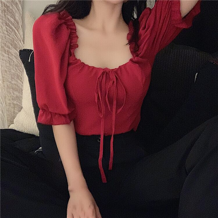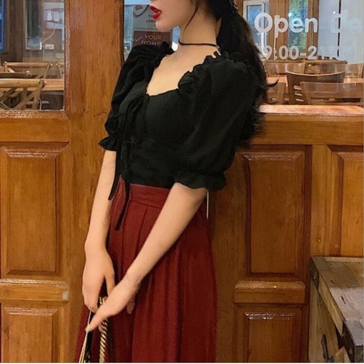 全2色 プルオーバー トップス ブラウス ラウンドネック 鎖骨 半袖 パフスリーブ リボン ショート丈 ハイウエスト 無地 きれいめ かわいい セクシー レトロ カジュアル お出かけ デート リゾート デイリー 夏 レッド ブラック
