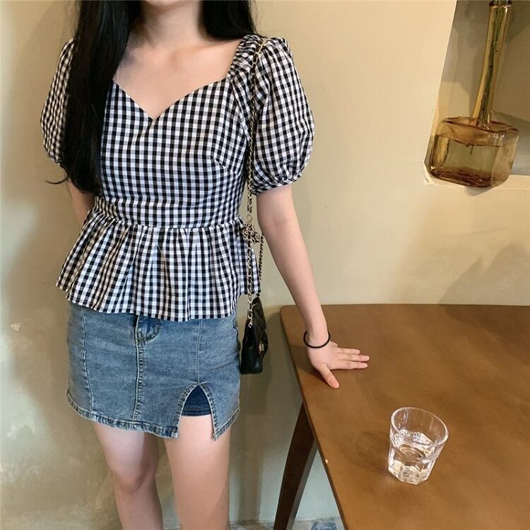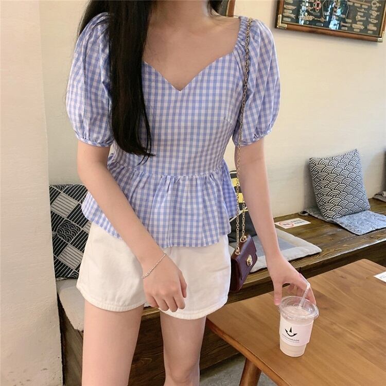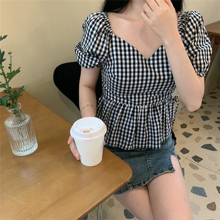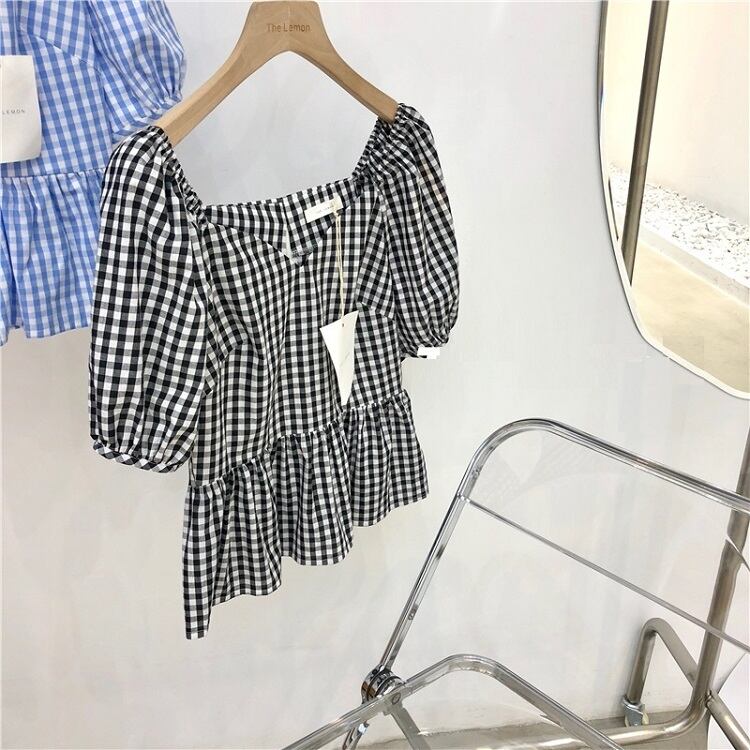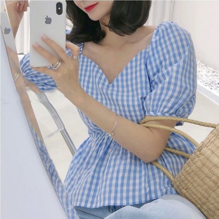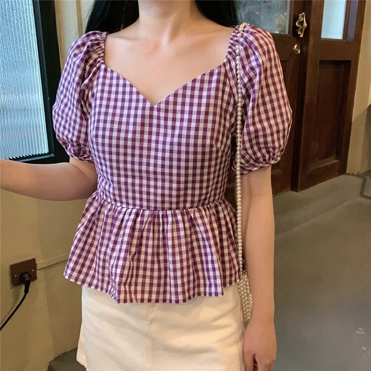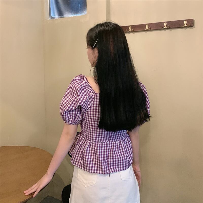 全3色 プルオーバー トップス ブラウス Vネック 鎖骨 半袖 パフスリーブ ハイウエスト ギンガムチェック きれいめ かわいい レトロ カジュアル お出かけ デート リゾート デイリー 夏 ブラック ブルー パープル