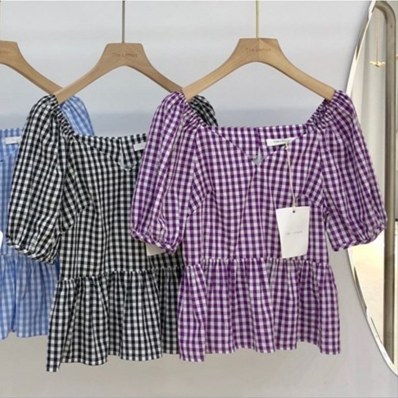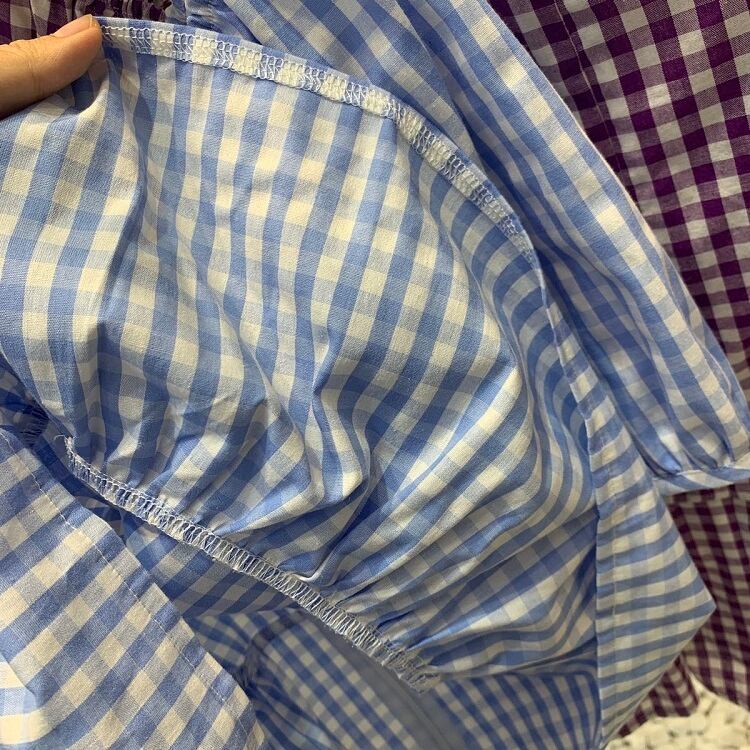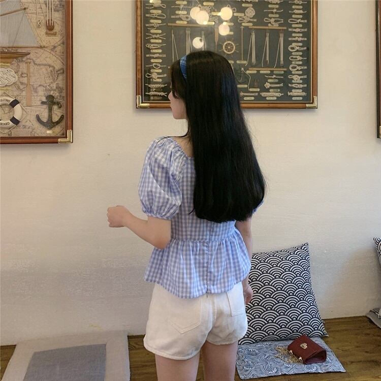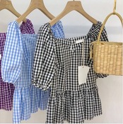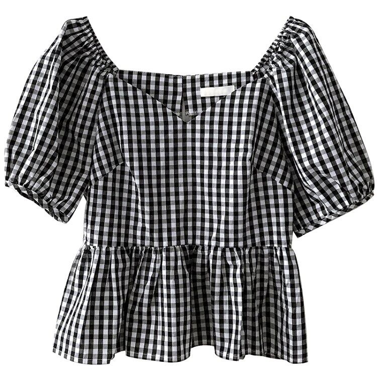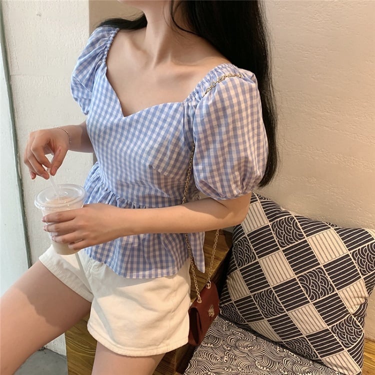 全3色 プルオーバー トップス ブラウス Vネック 鎖骨 半袖 パフスリーブ ハイウエスト ギンガムチェック きれいめ かわいい レトロ カジュアル お出かけ デート リゾート デイリー 夏 ブラック ブルー パープル