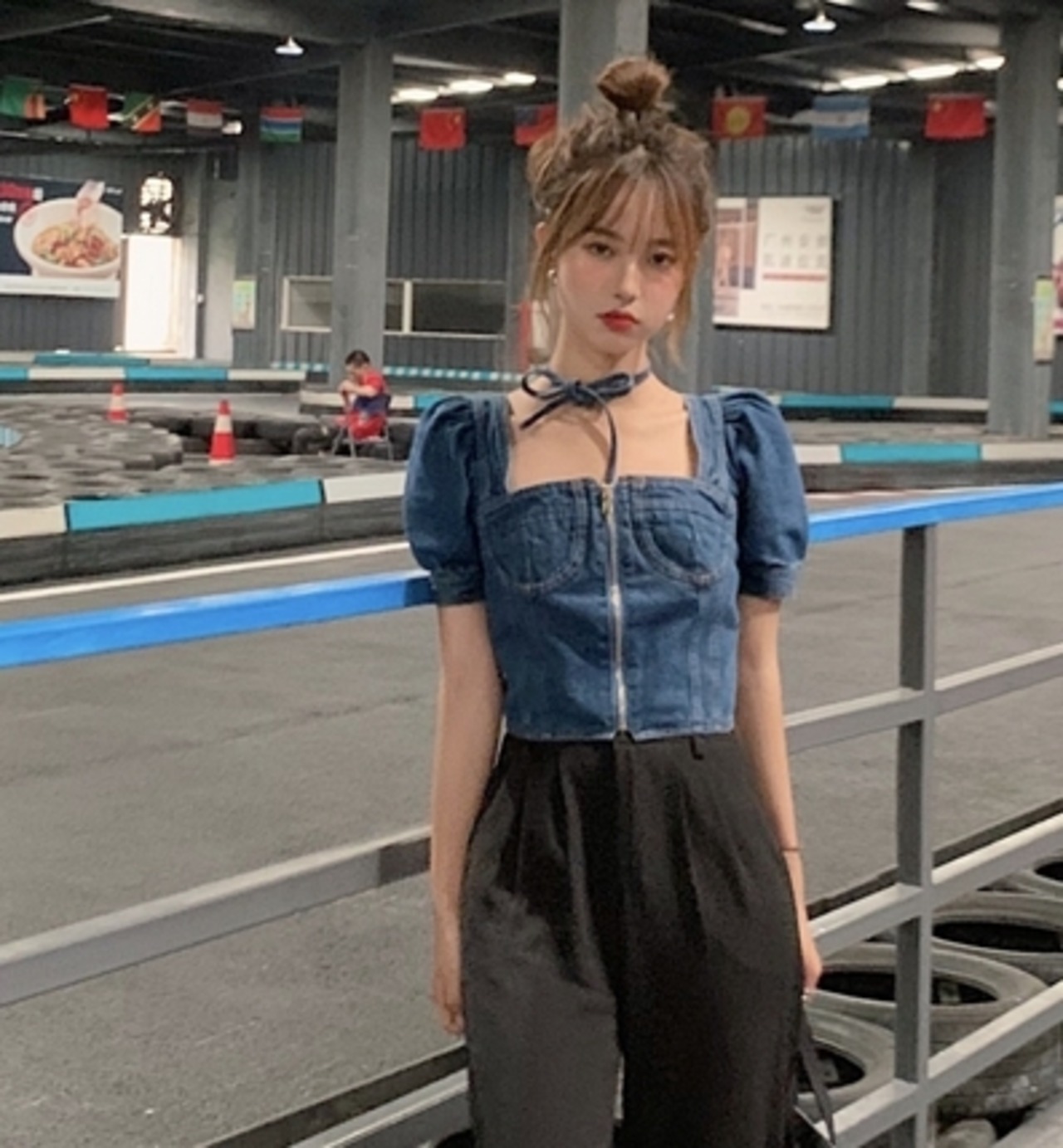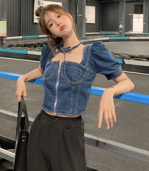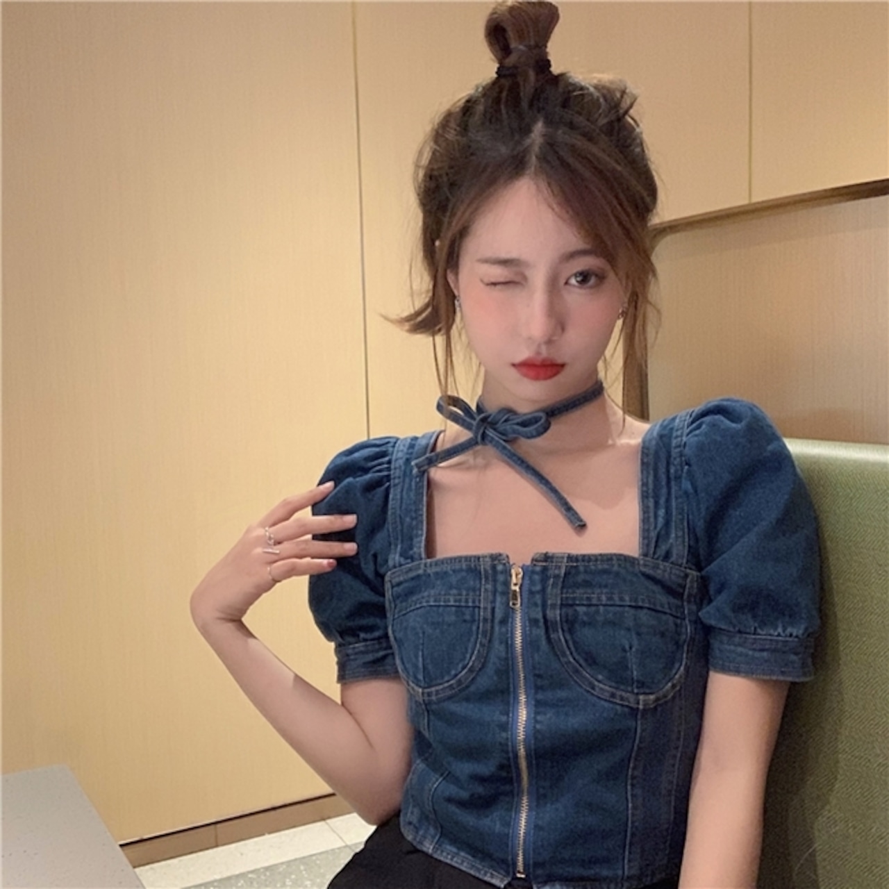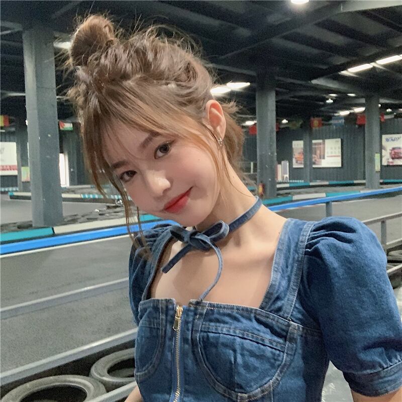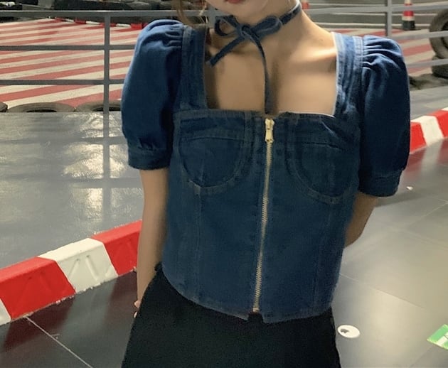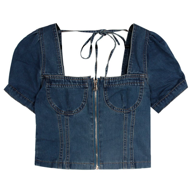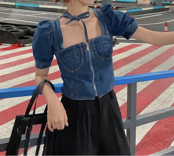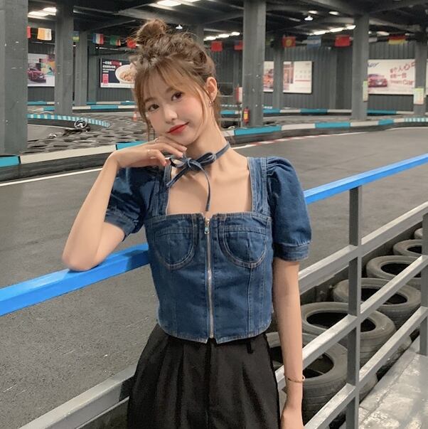 トップス ブラウス プルオーバー デニム ジーンズ スクエアネック ジッパー 半袖 パフスリーブ ショート丈 可愛い ネックリボン カジュアル ガーリー お出かけ デート リゾート デイリー 夏
