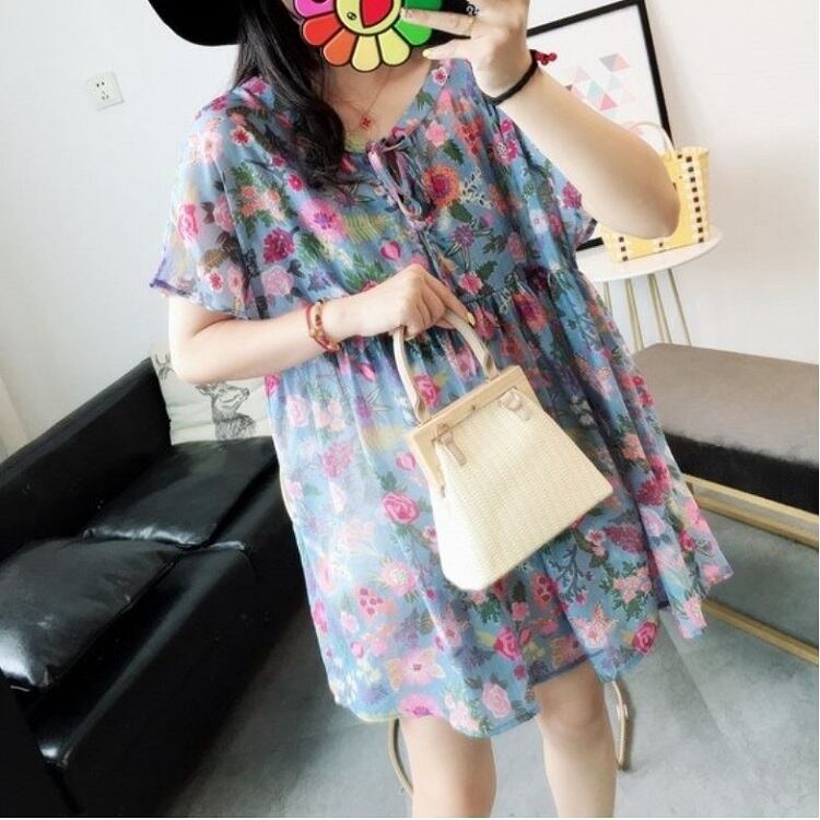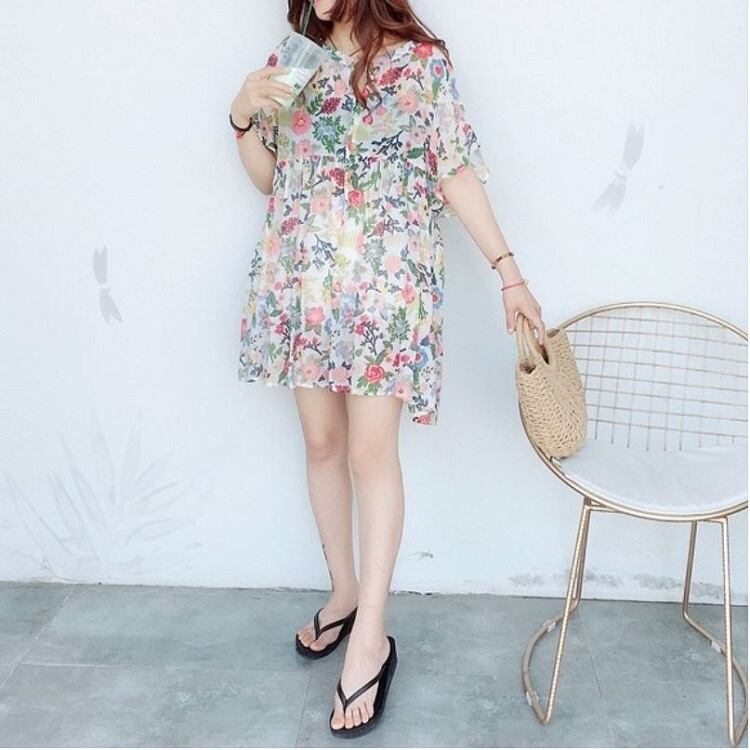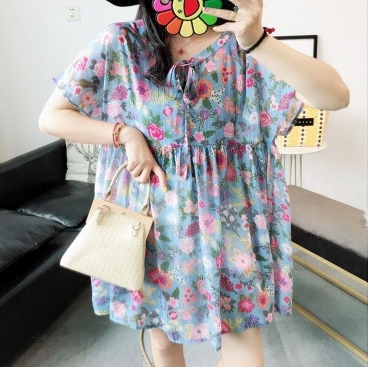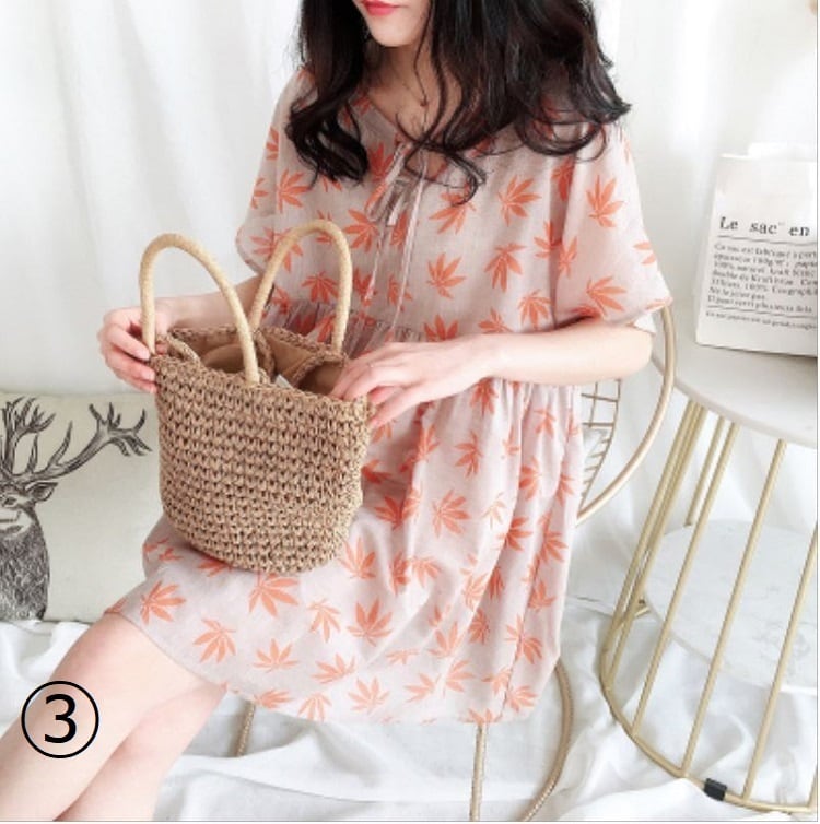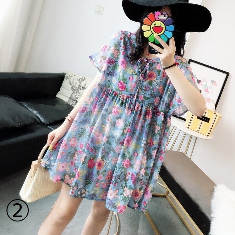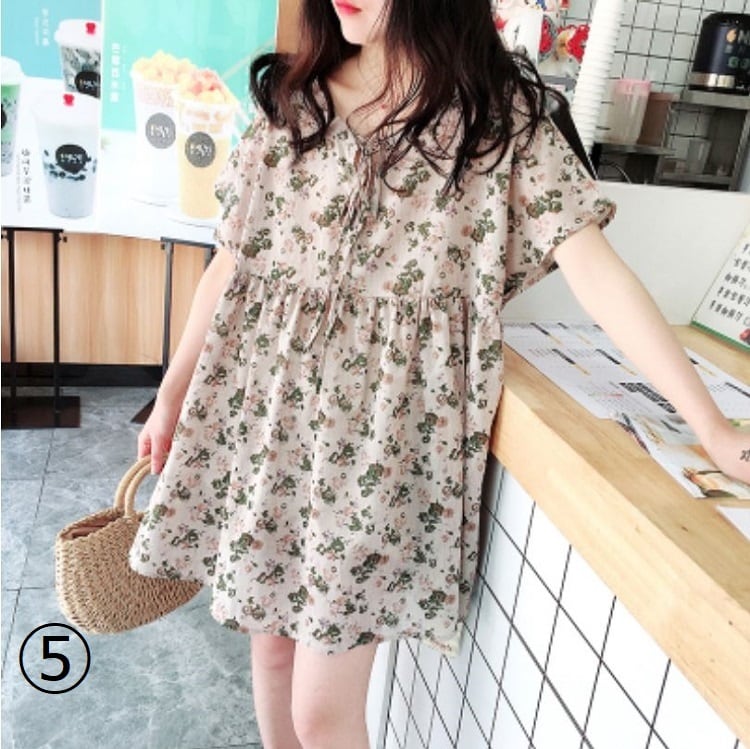 全5色 ミニワンピース チュニック 花柄 リボン Aライン 半袖 ゆったり 体型カバー かわいい フェミニン レトロ カジュアル お出かけ デート 夏