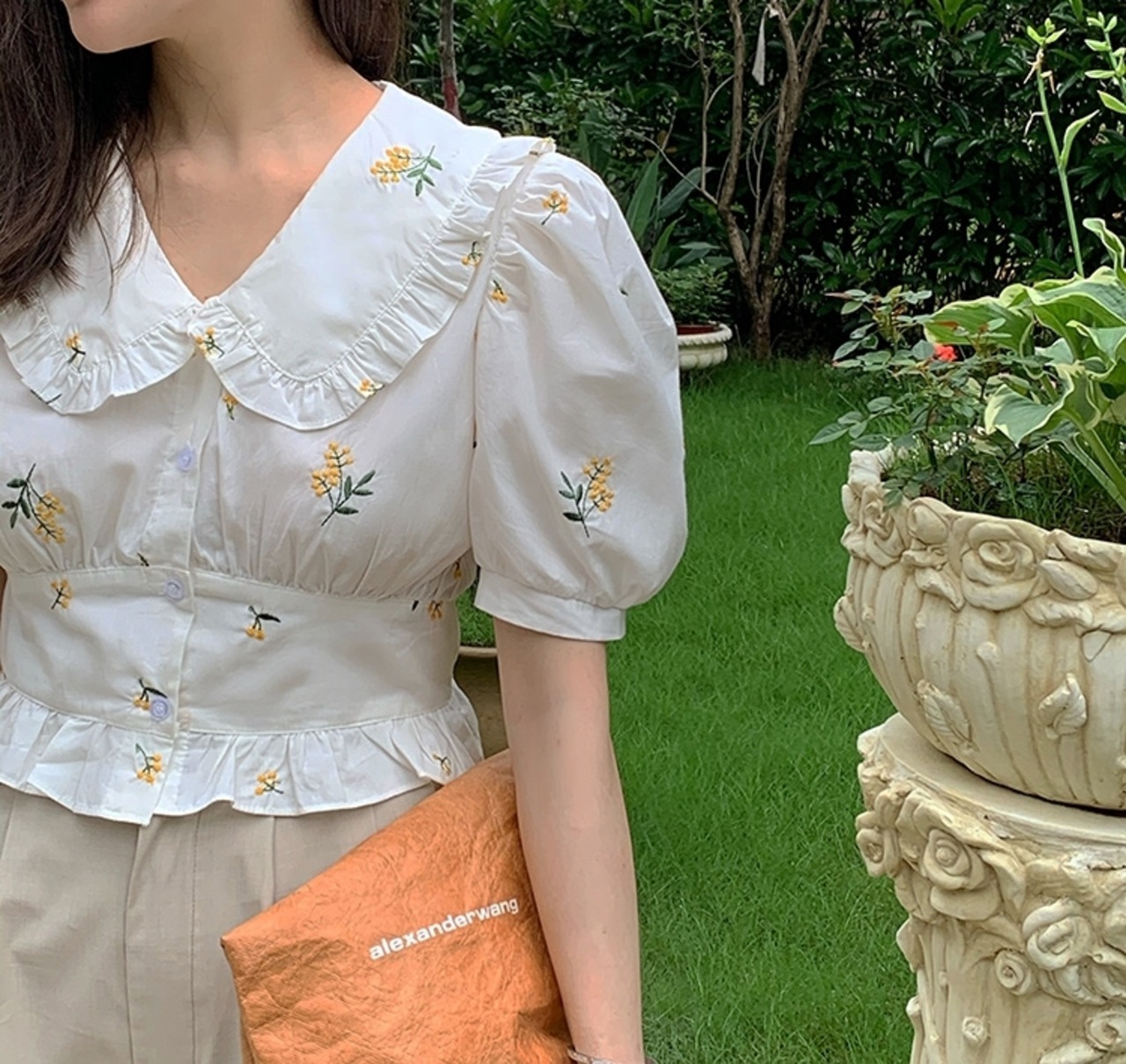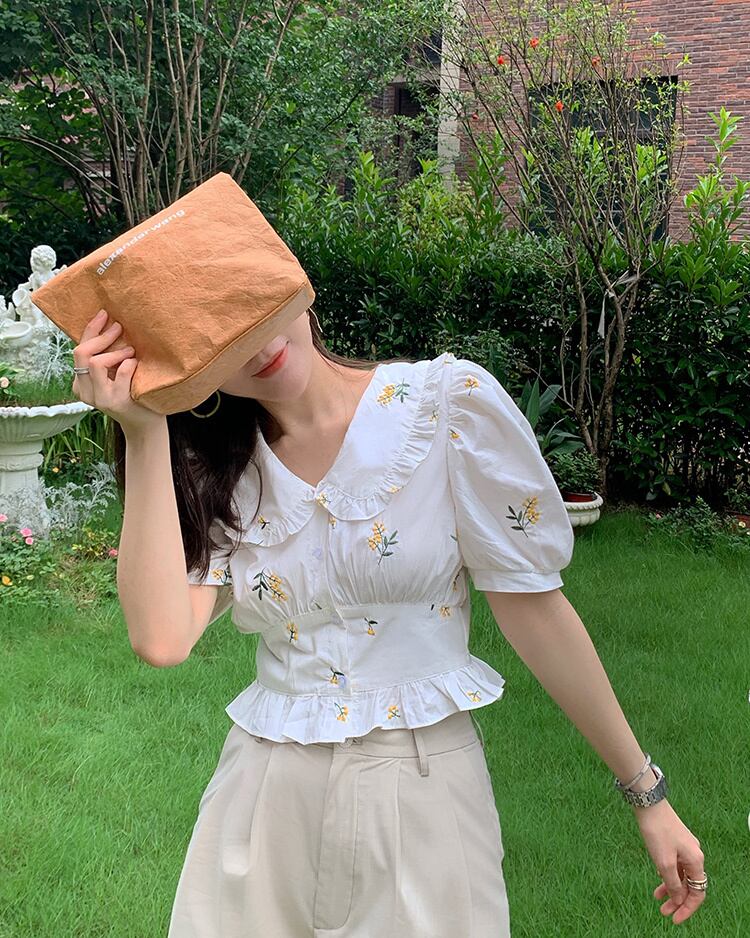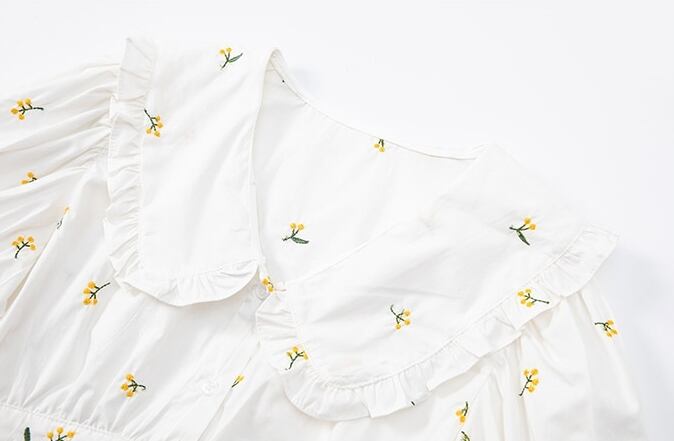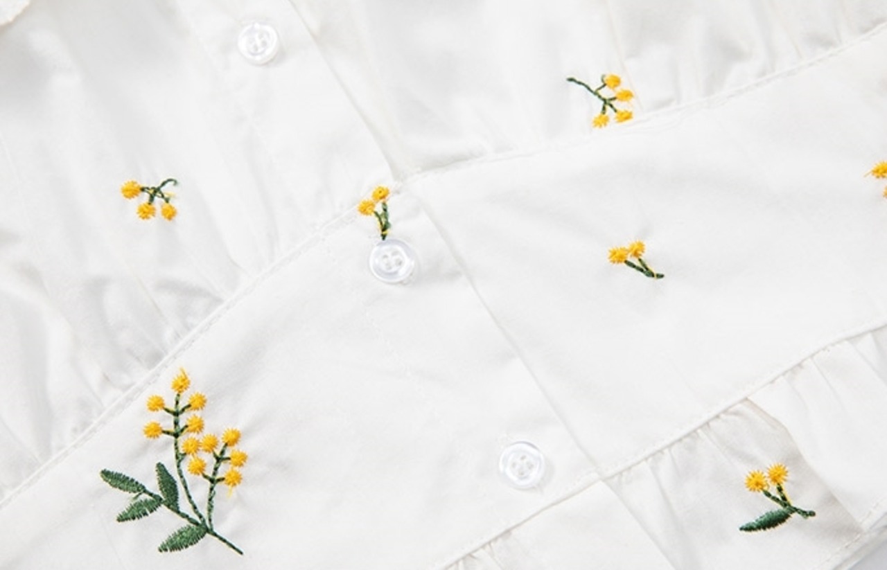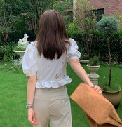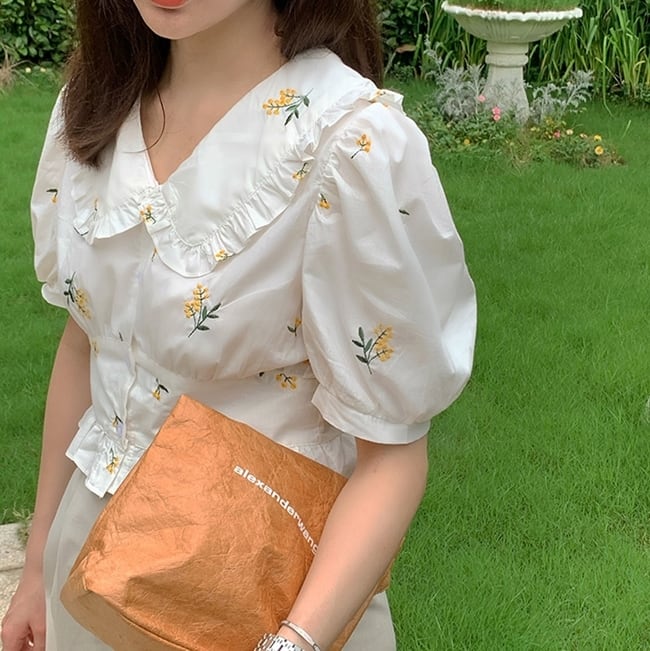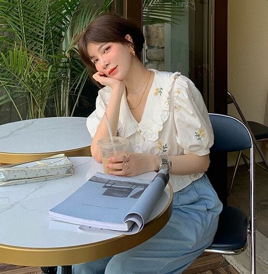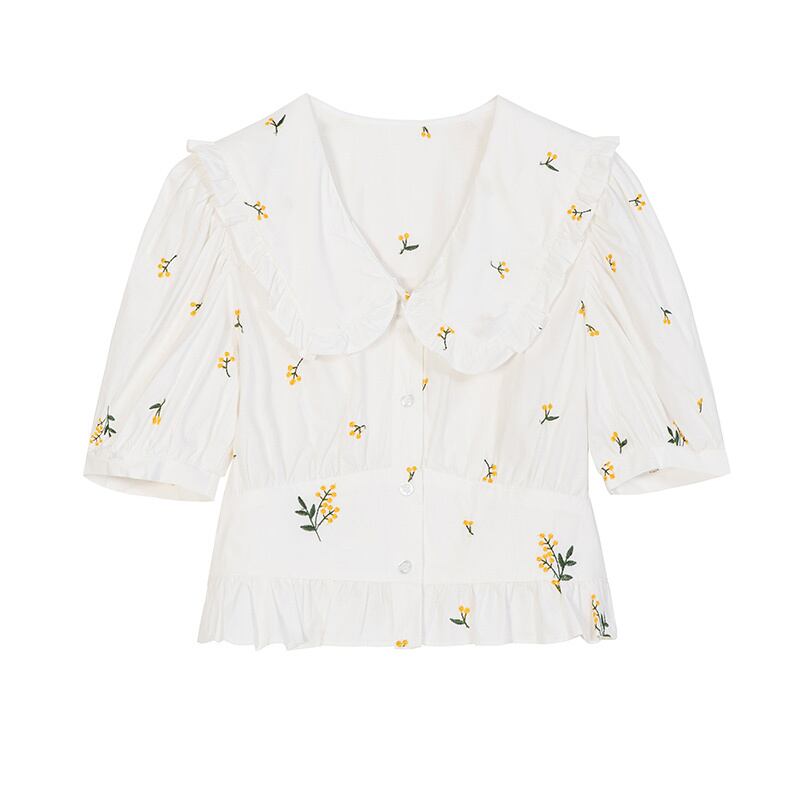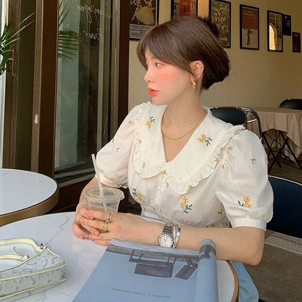 トップス ブラウス シャツ 刺繍 花柄 フリル ムスクテールカラー ガーリー 可愛い 半袖 パフスリーブ Vネック フリル 上品 フロントボタン カジュアル デイリー デート お出かけ リゾート レトロ 夏