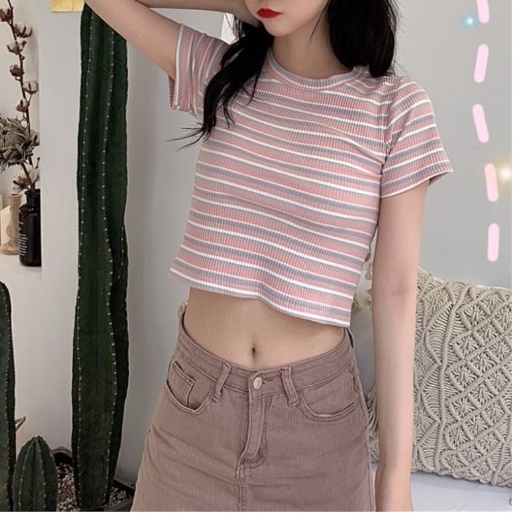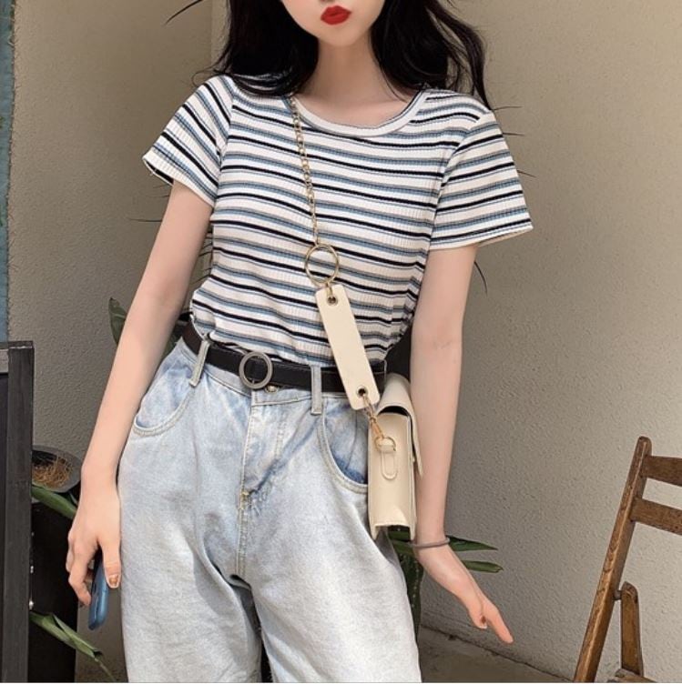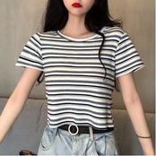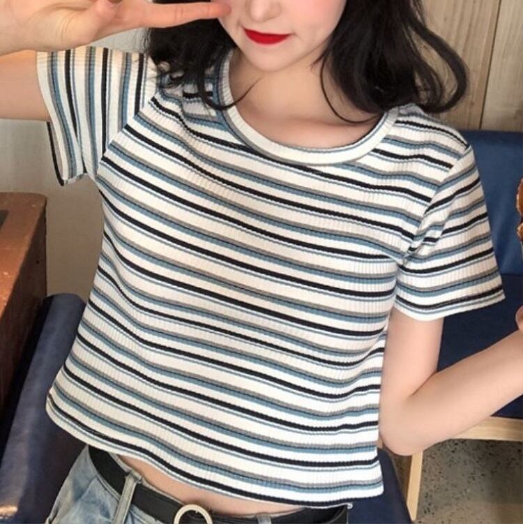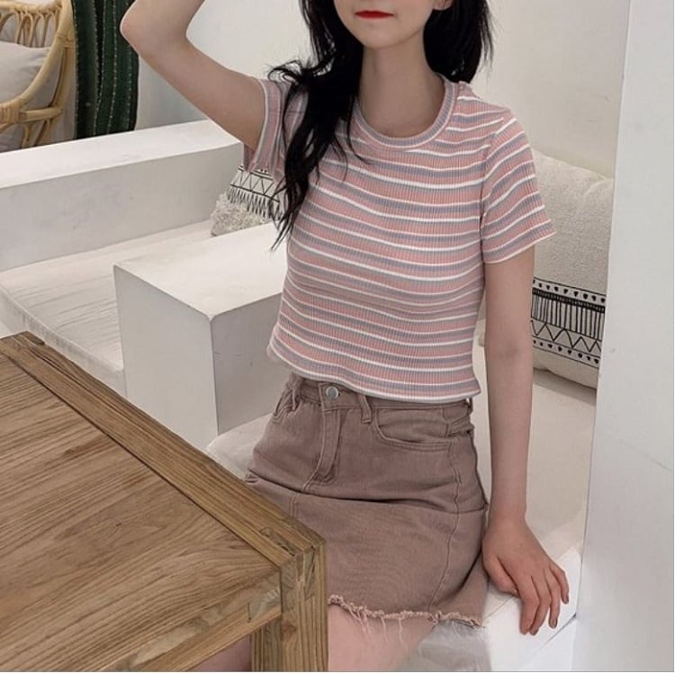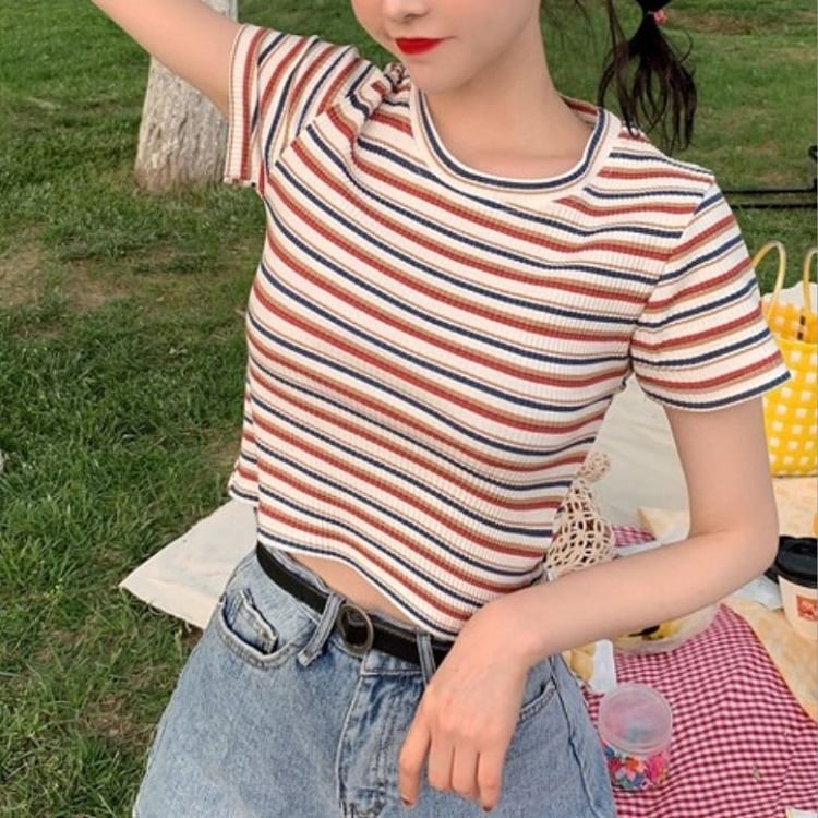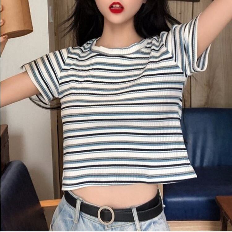 全3色 トップス Tシャツ ニットトップス ストライプ ショート丈 タイト ラウンドネック 半袖 かわいい レトロ カジュアル お出かけ リゾート デート 夏 ブルー レッド ピンク