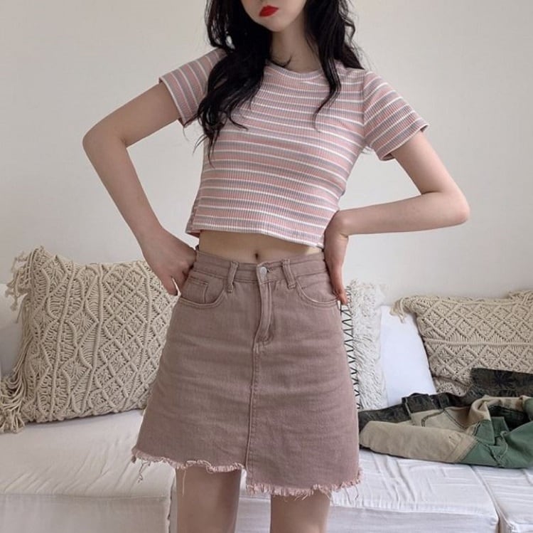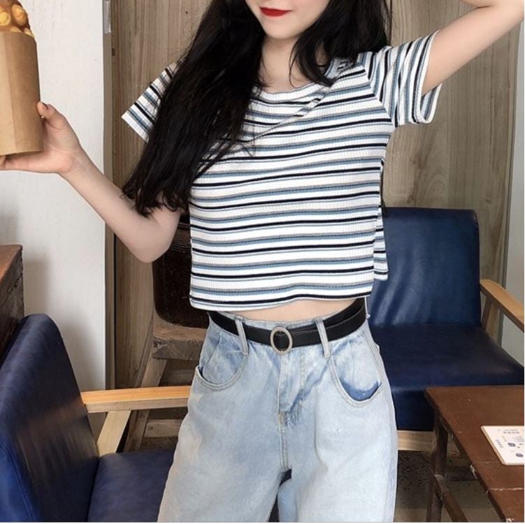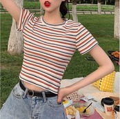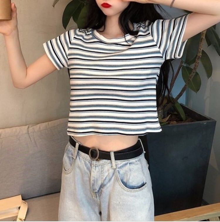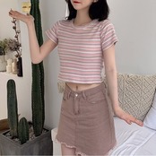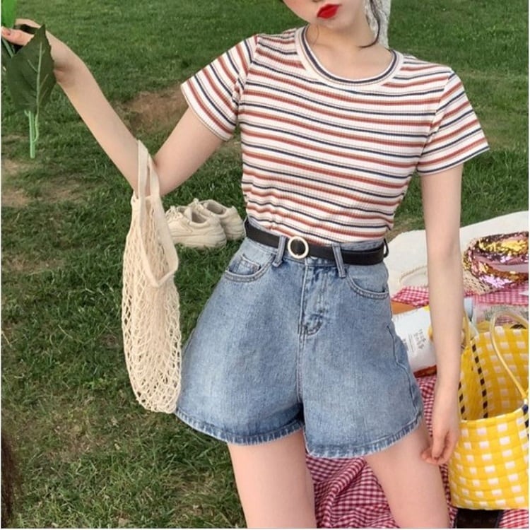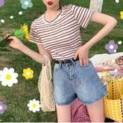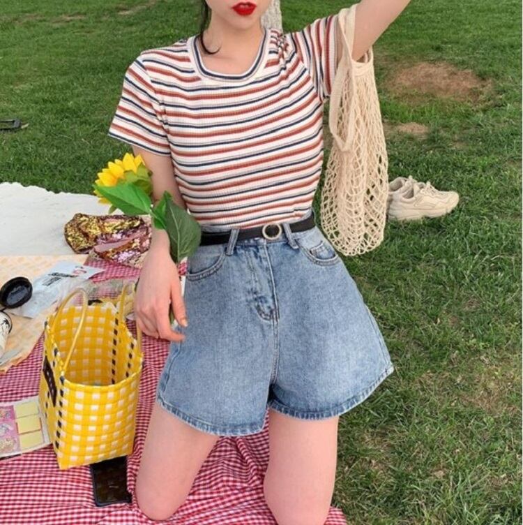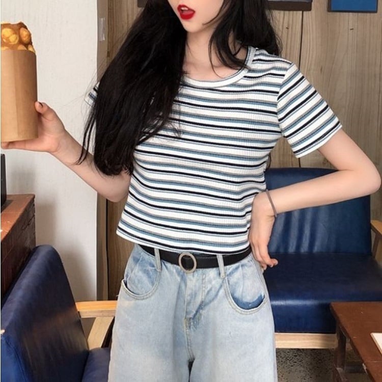 全3色 トップス Tシャツ ニットトップス ストライプ ショート丈 タイト ラウンドネック 半袖 かわいい レトロ カジュアル お出かけ リゾート デート 夏 ブルー レッド ピンク