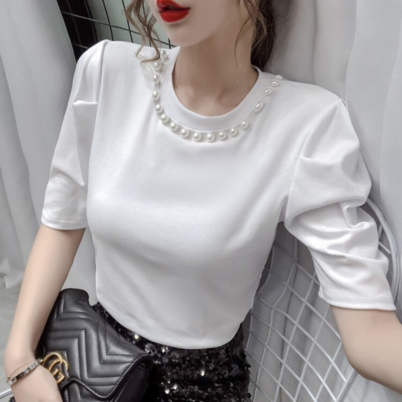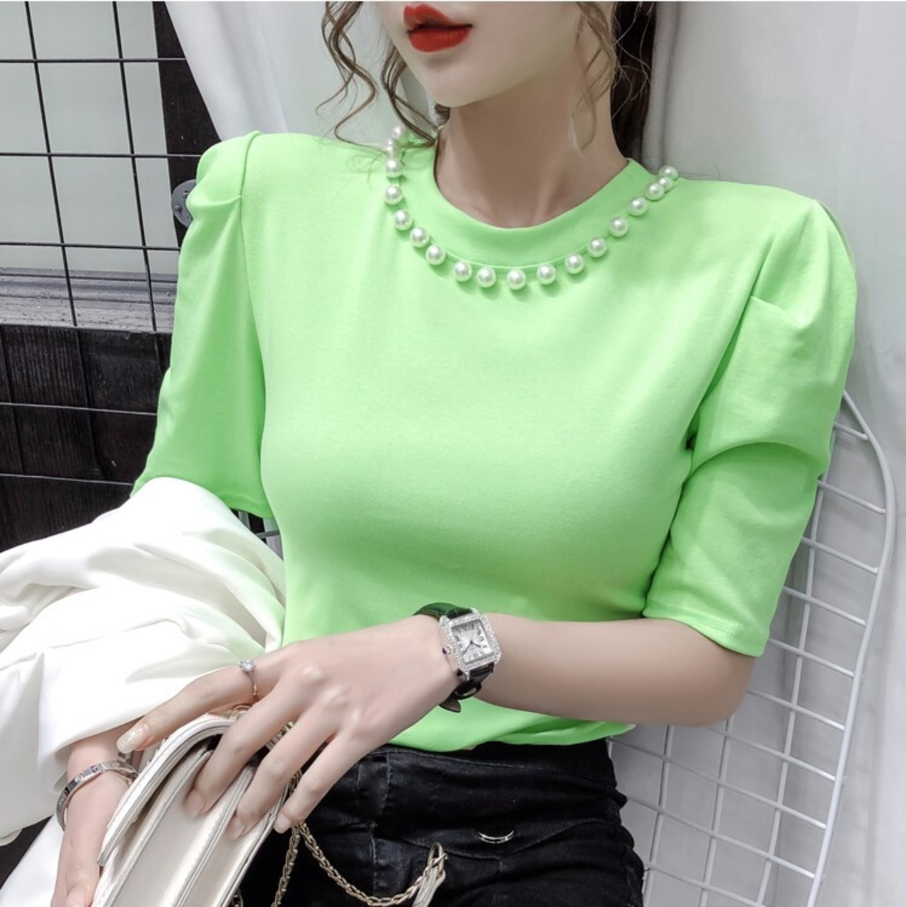 全3色 トップス Tシャツ ラウンドネック パール ネックレス 半袖 パフスリーブ シンプル きれいめ かわいい レトロ カジュアル お出かけ リゾート デート 夏 ブラック ホワイト グリーン