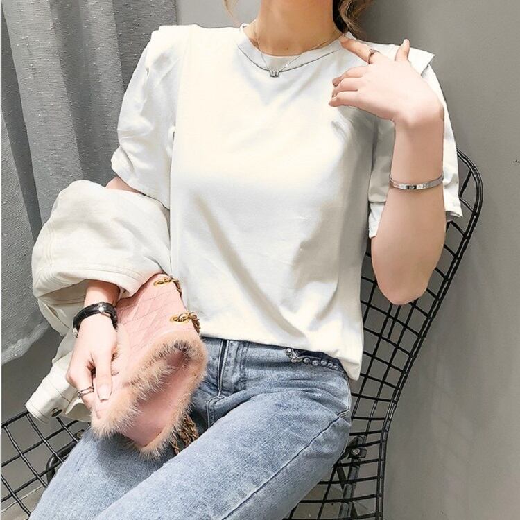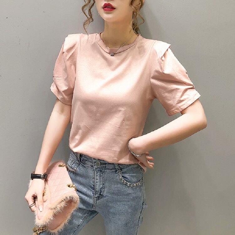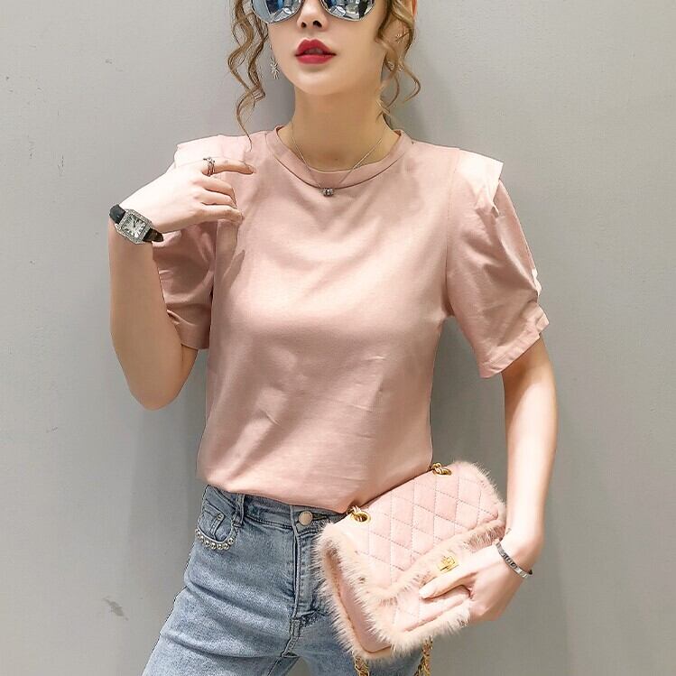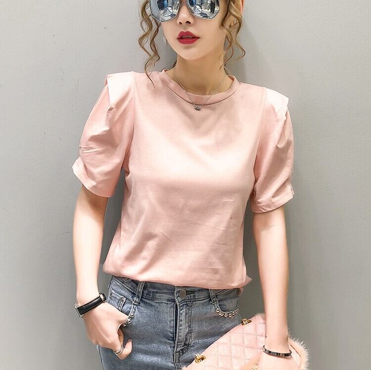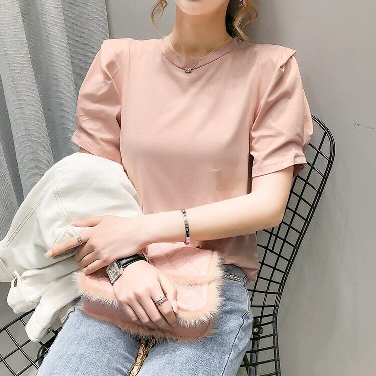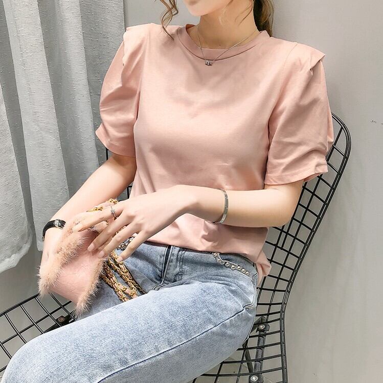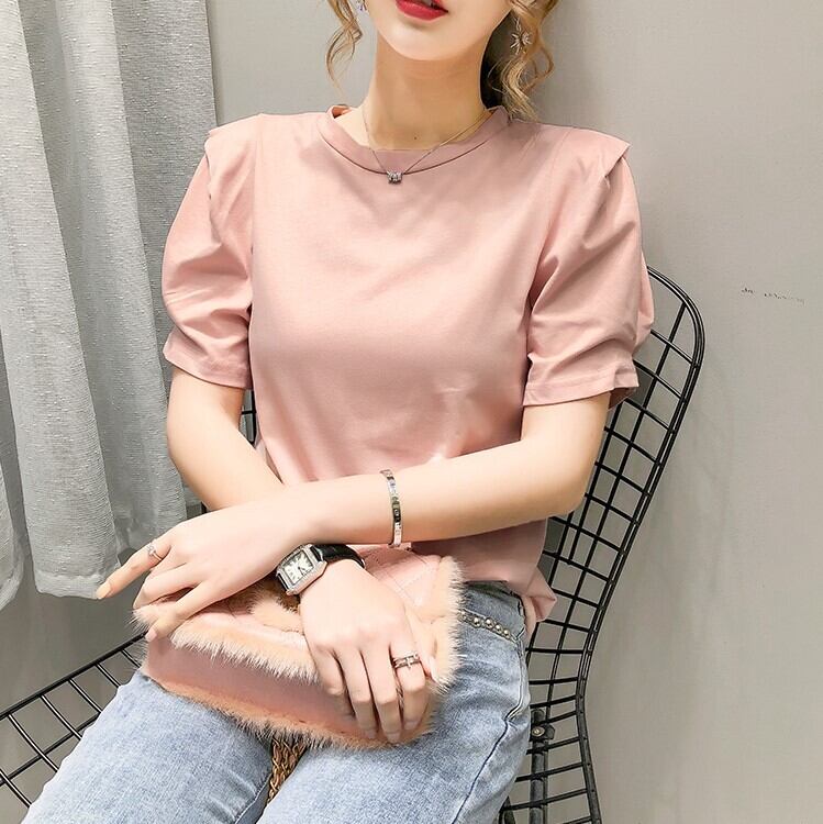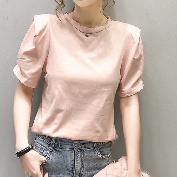 全2色 トップス Tシャツ ラウンドネック 半袖 パフスリーブ シンプル 無地 かわいい レトロ カジュアル お出かけ リゾート デイリー 普段着 夏 ピンク ホワイト