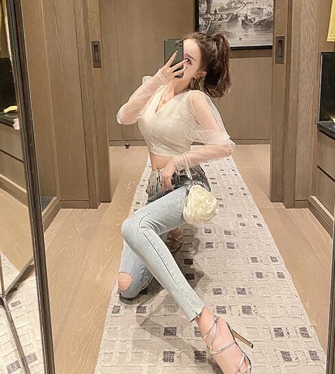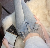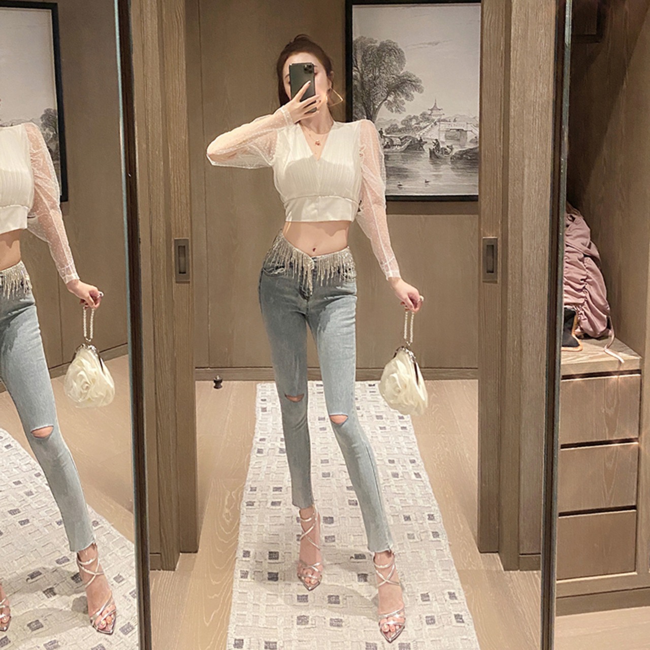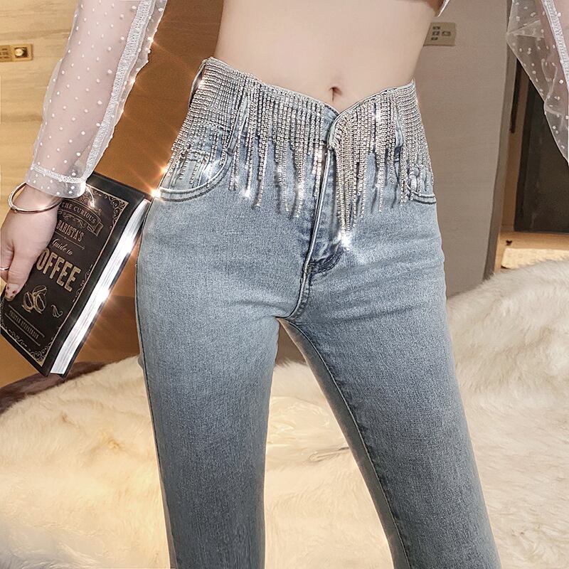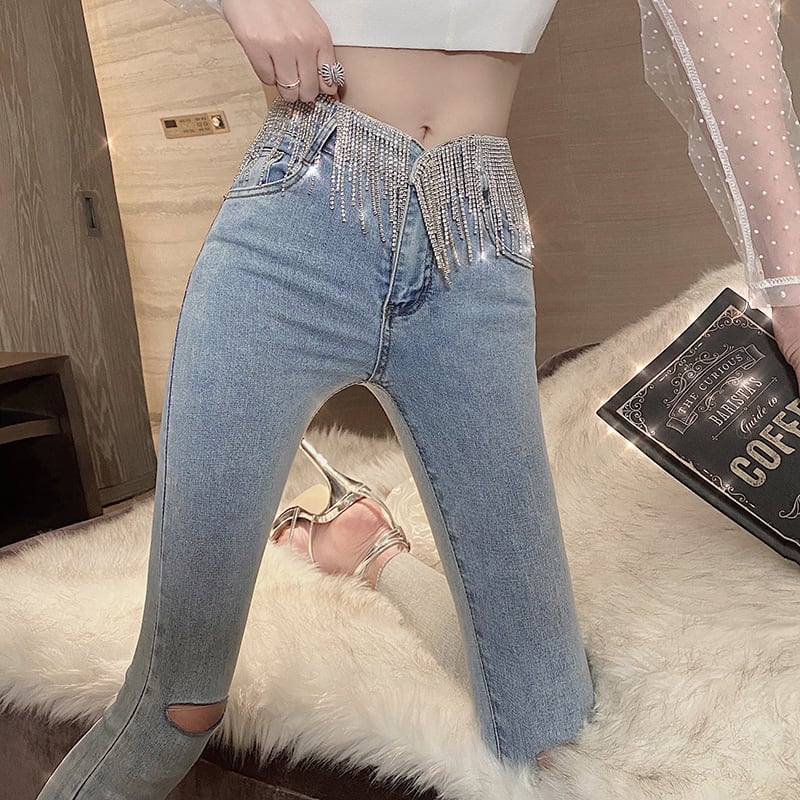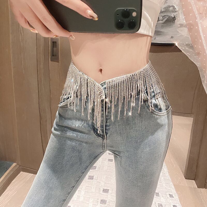 デニムパンツ スキニーパンツ フリンジ ラインストーン キラキラ 個性的 ユニーク ジーンズ ストレッチ スリム アンクル丈 9分丈 ダメージ加工 切りっぱなし カットオフデニム 上品 カジュアル きれいめ シック ウエストコンシャス デート 夏 秋