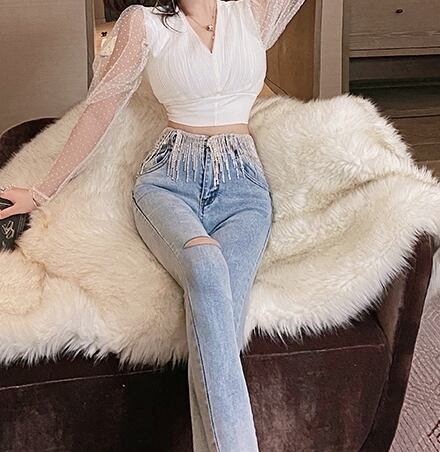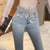 動く度にキラキラ輝くウエストフリンジが華やかなデニムパンツ。