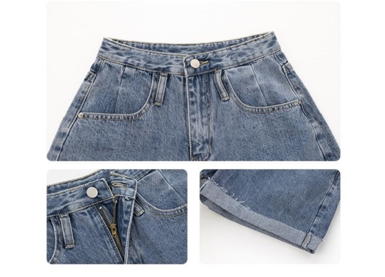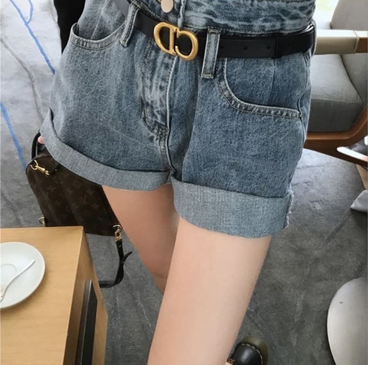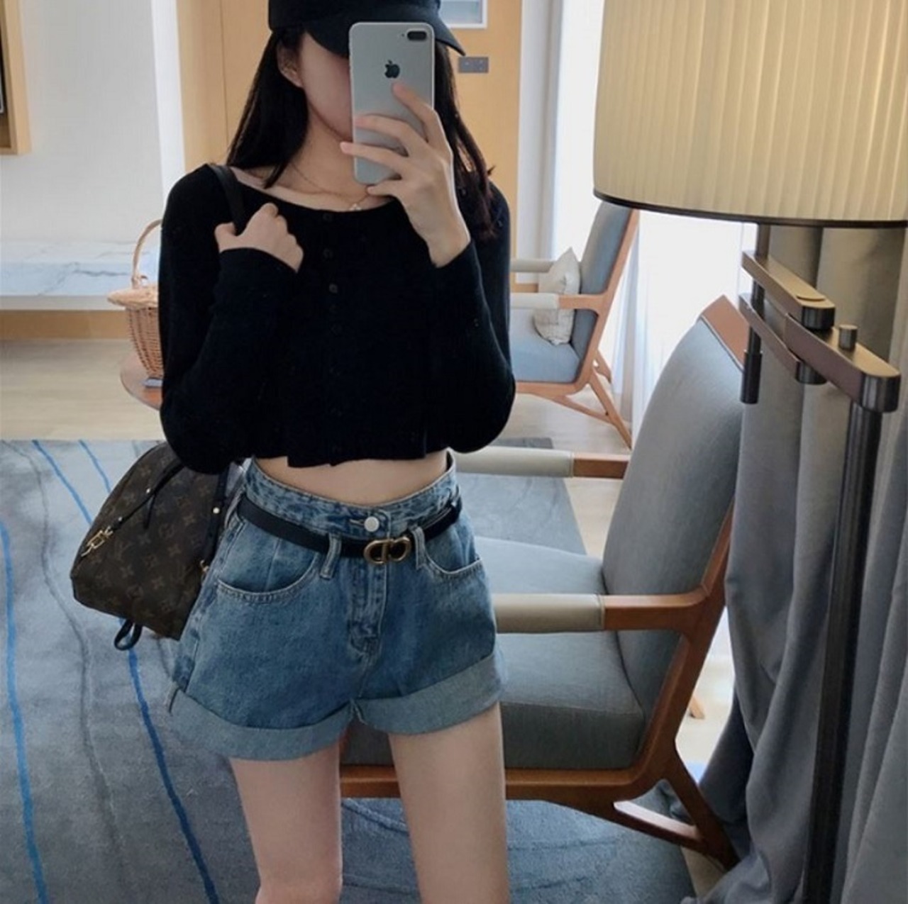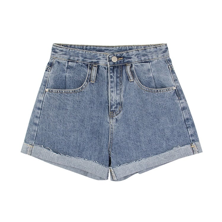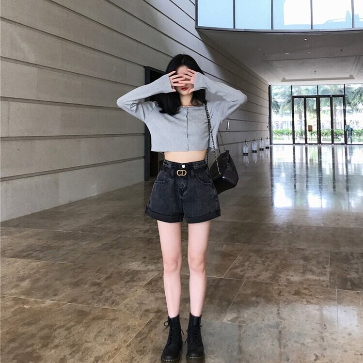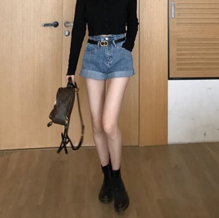 全2色 デニムパンツ ショートパンツ ボトムス 短パン ハイウエスト 美脚 シンプル ストリート かわいい レトロ カジュアル お出かけ リゾート デイリー 普段着 夏 ブルー グレーブラック