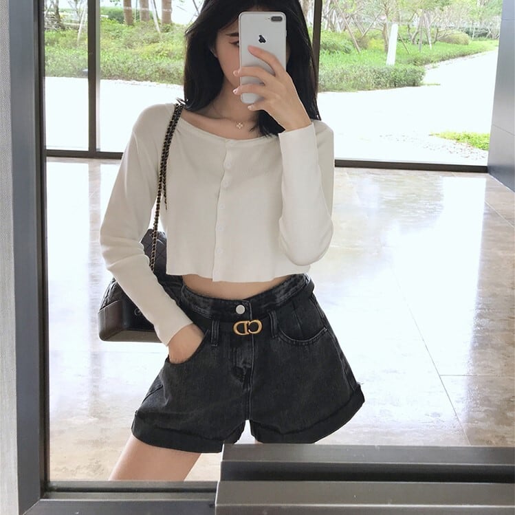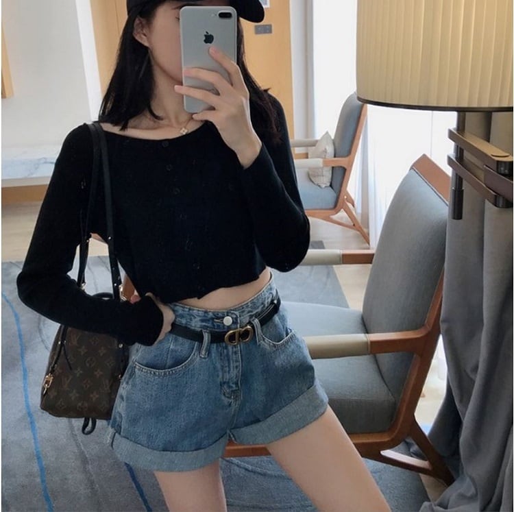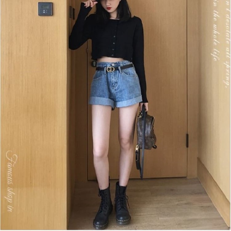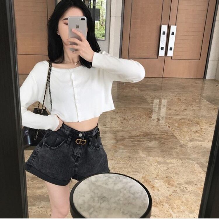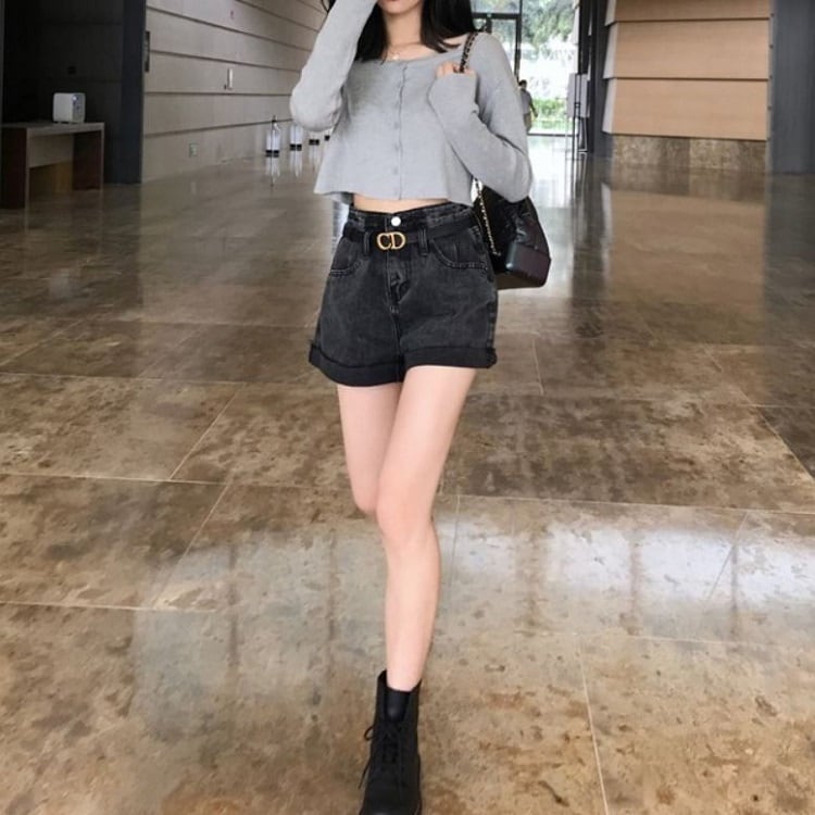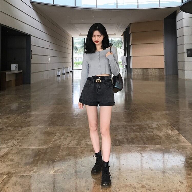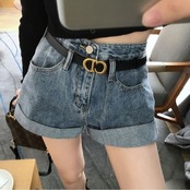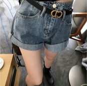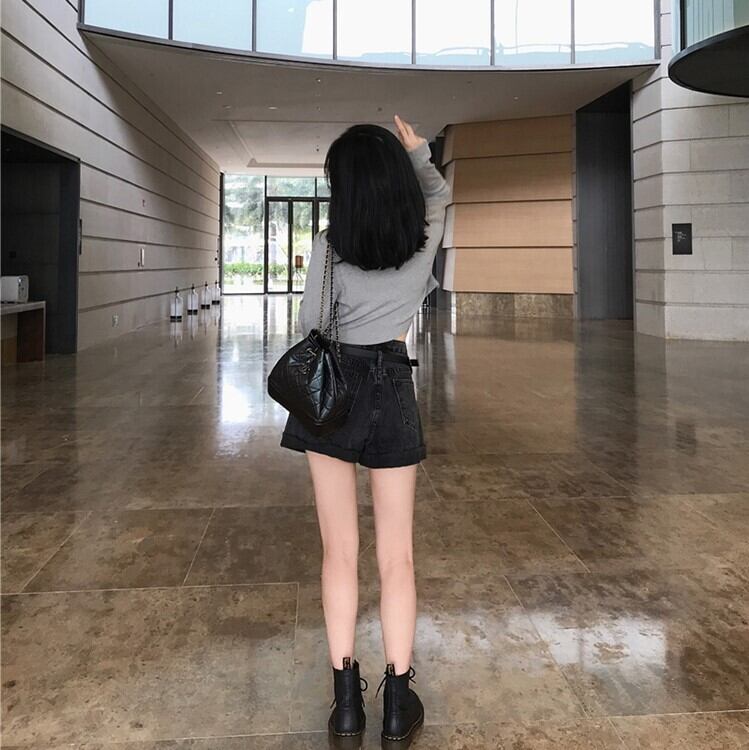全2色 デニムパンツ ショートパンツ ボトムス 短パン ハイウエスト 美脚 シンプル ストリート かわいい レトロ カジュアル お出かけ リゾート デイリー 普段着 夏 ブルー グレーブラック