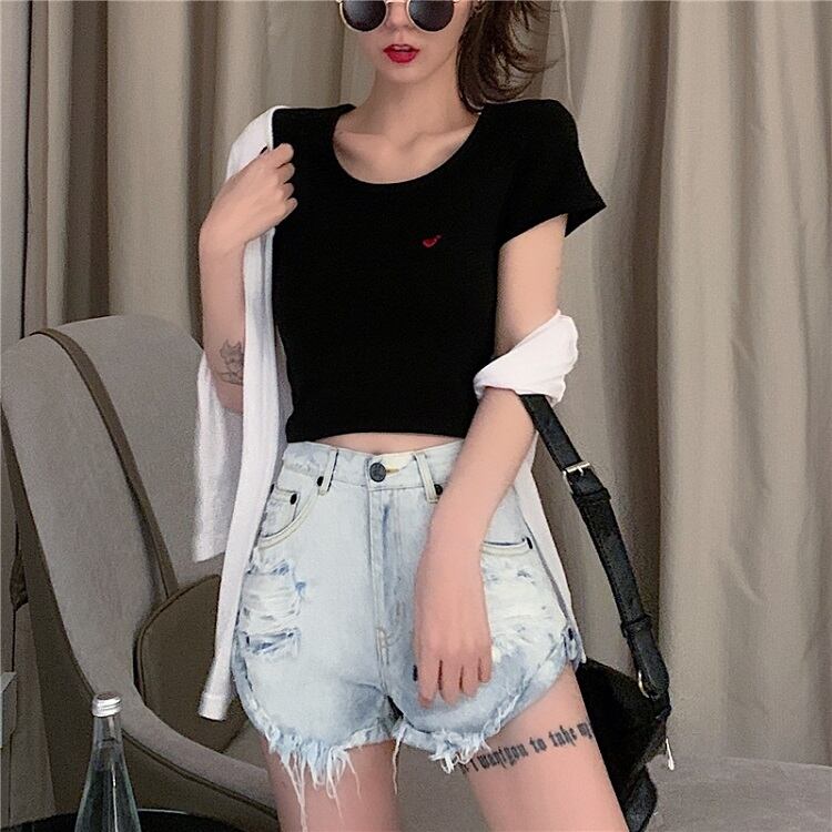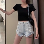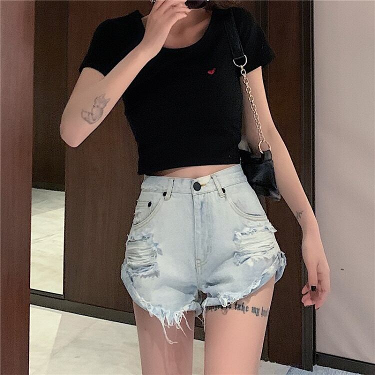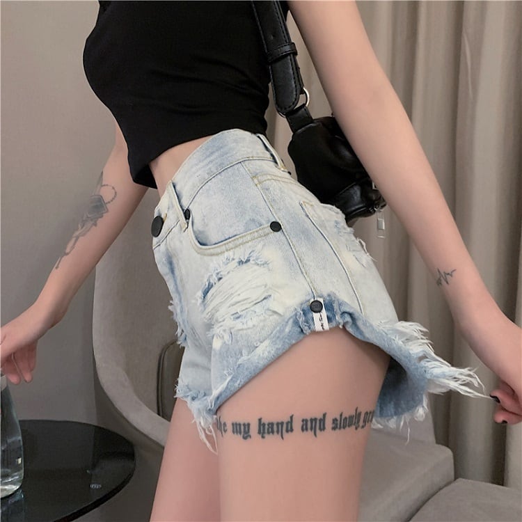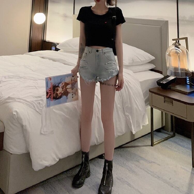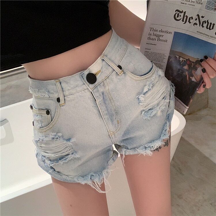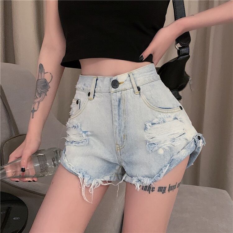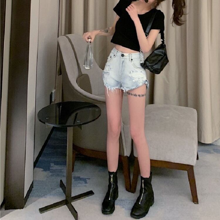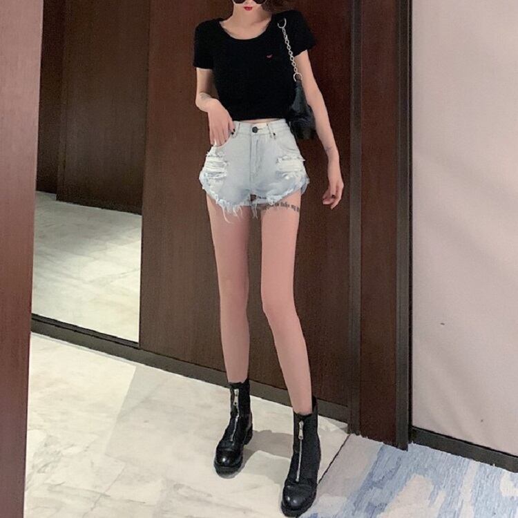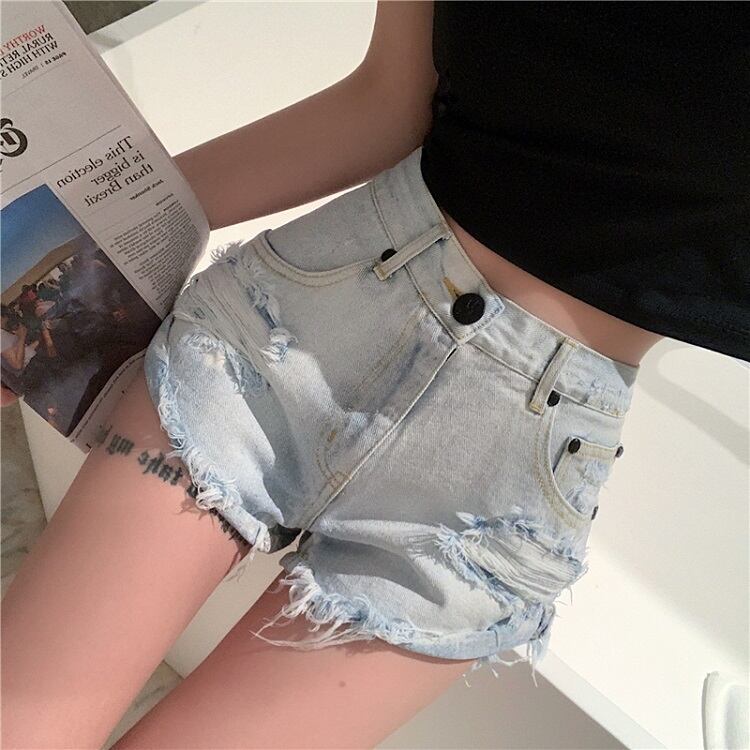 デニムパンツ ダメージパンツ ボトムス 短パン ハイウエスト 美脚 シンプル セクシー レトロ カジュアル お出かけ リゾート デイリー 普段着 夏 ブルー