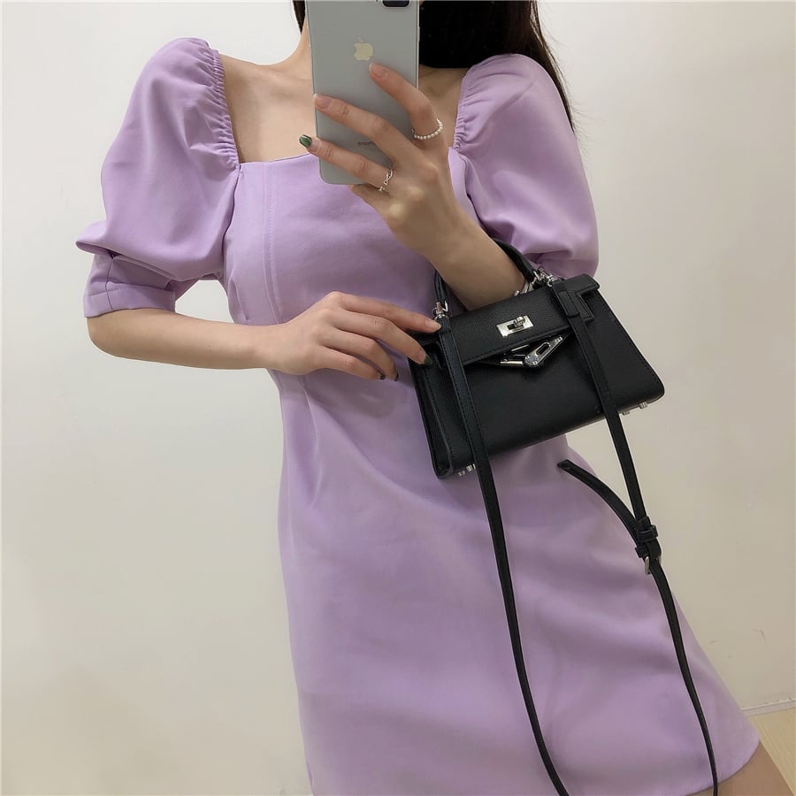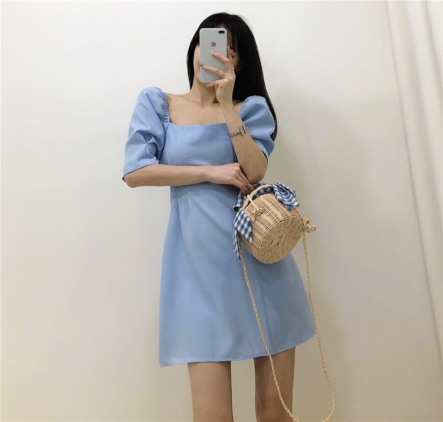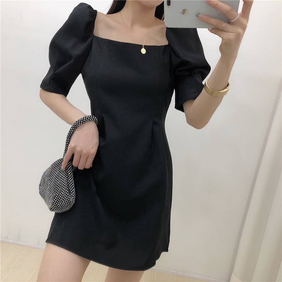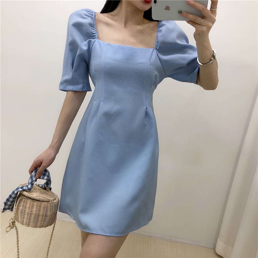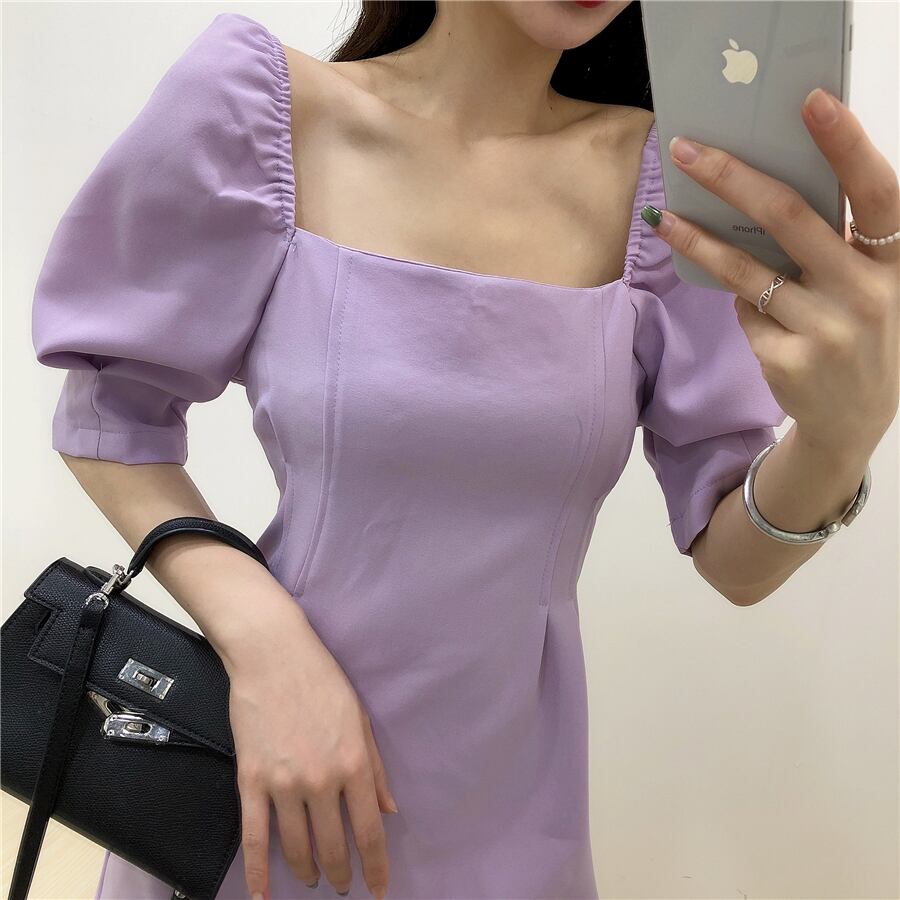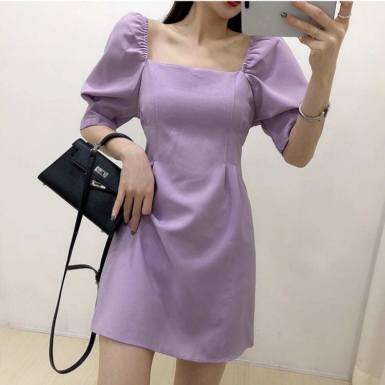 全4色 ワンピース ミニ丈 パフスリーブ スクエアネック シンプル レトロ きれいめ 可愛い お呼ばれ フォーマル お出かけ デート 夏 パープル ブルー ホワイト ブラック