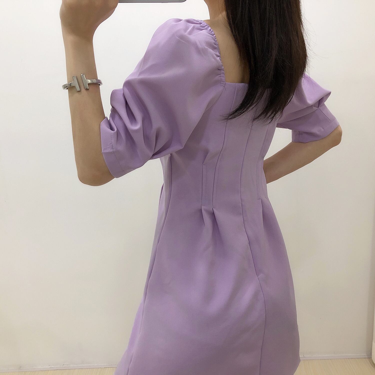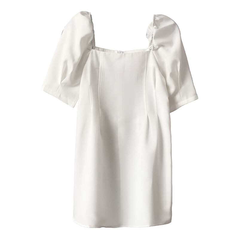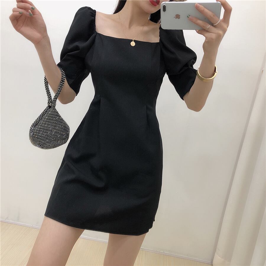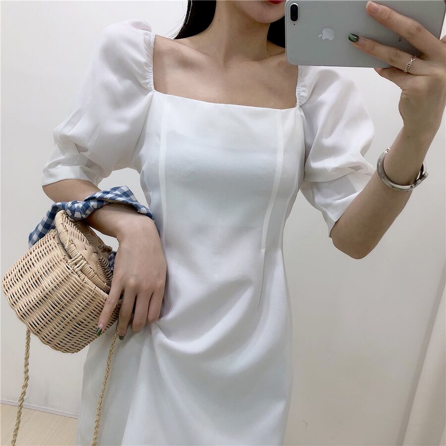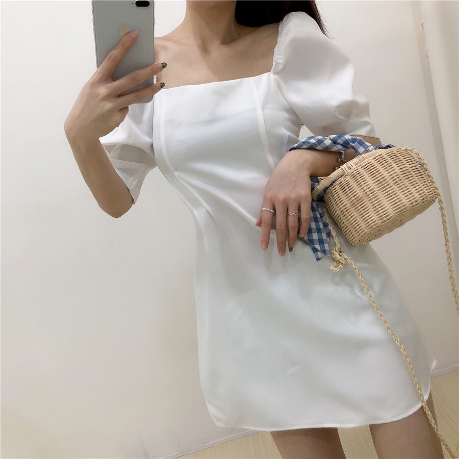 全4色 ワンピース ミニ丈 パフスリーブ スクエアネック シンプル レトロ きれいめ 可愛い お呼ばれ フォーマル お出かけ デート 夏 パープル ブルー ホワイト ブラック