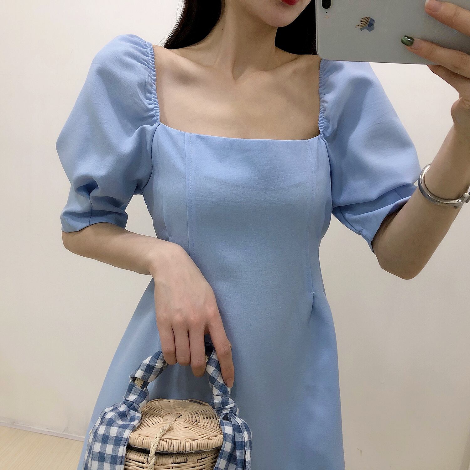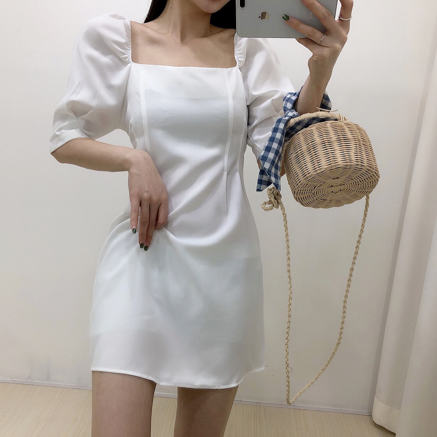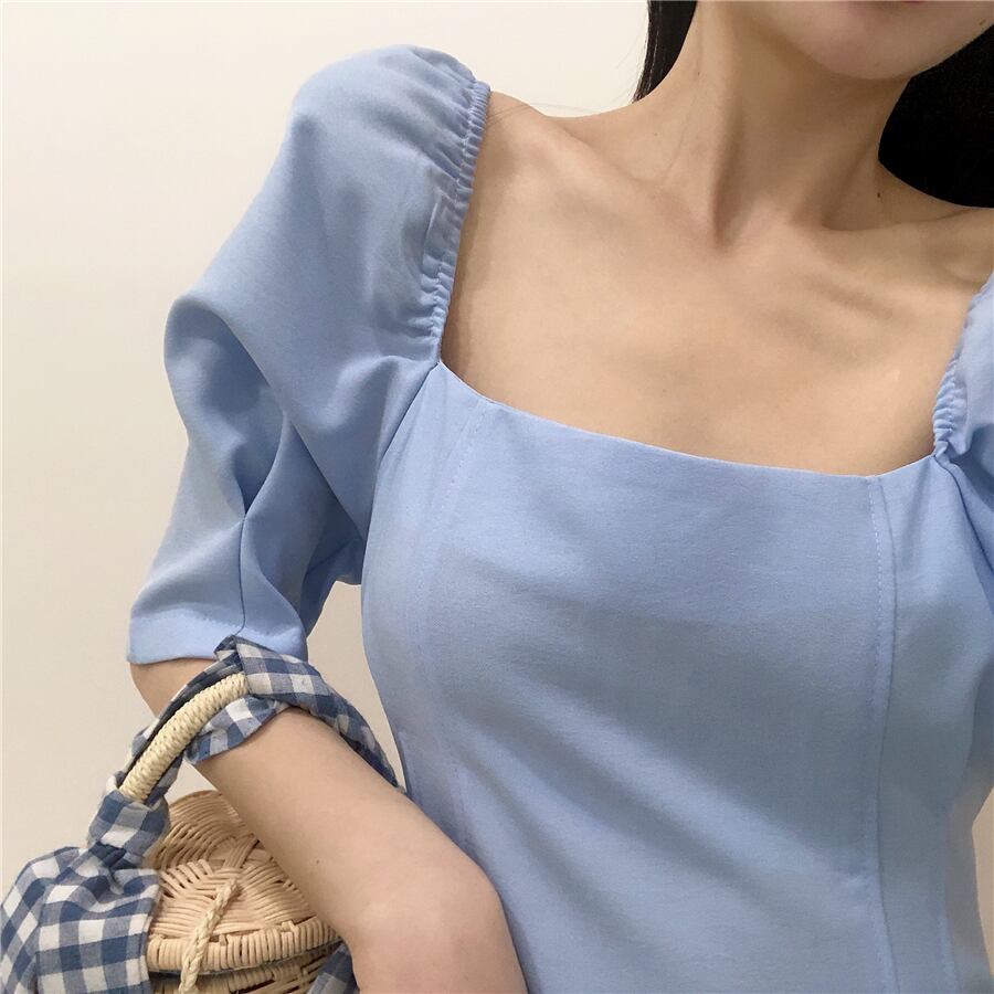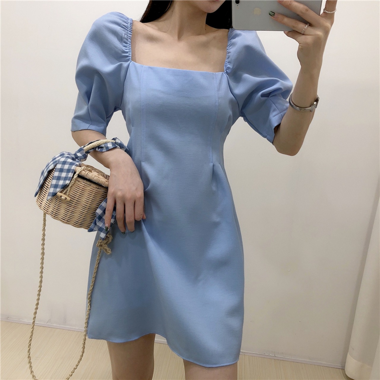 全4色 ワンピース ミニ丈 パフスリーブ スクエアネック シンプル レトロ きれいめ 可愛い お呼ばれ フォーマル お出かけ デート 夏 パープル ブルー ホワイト ブラック