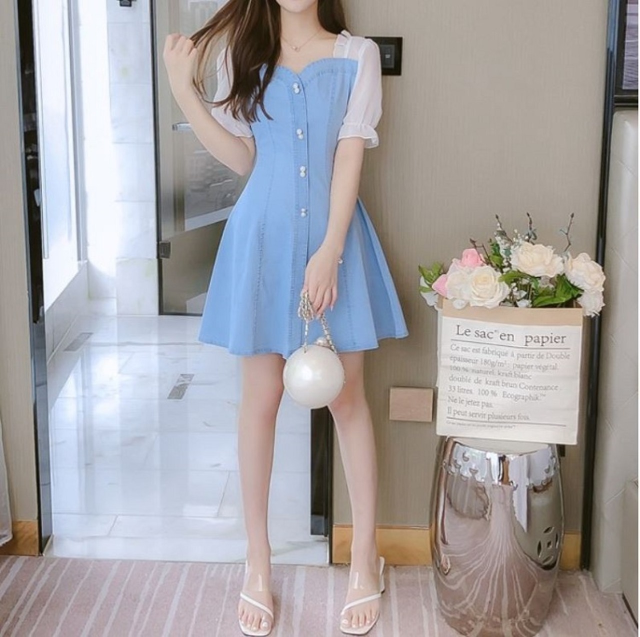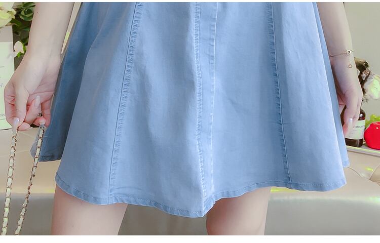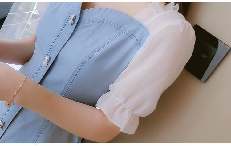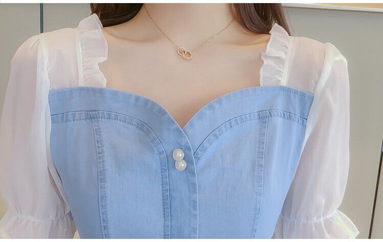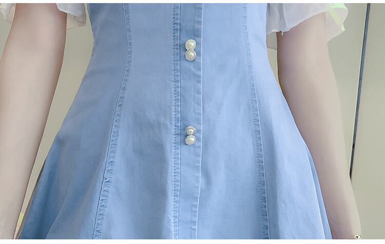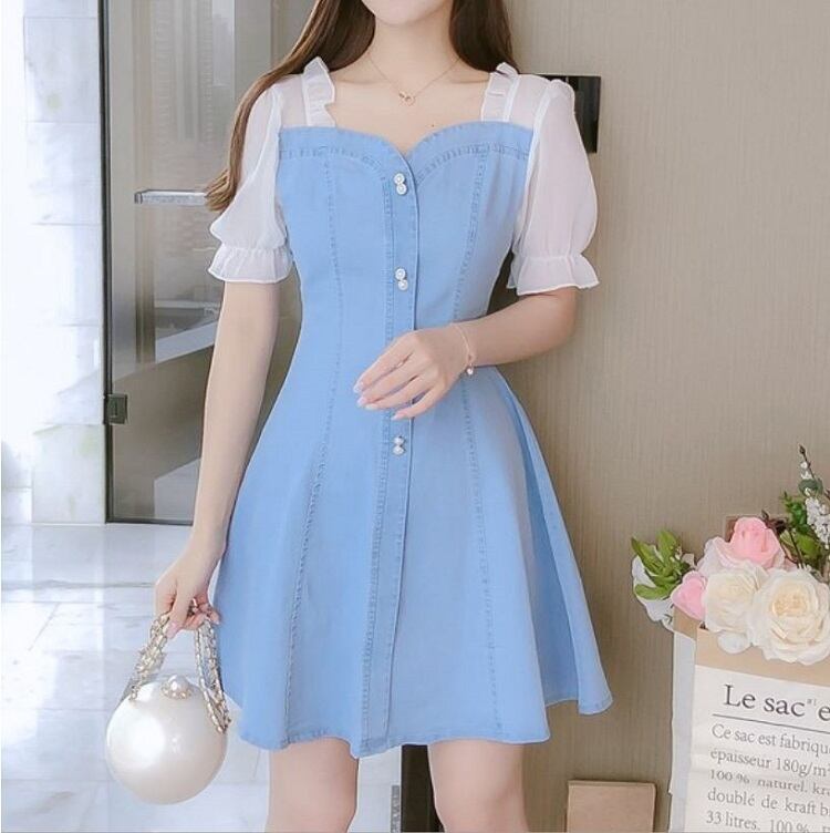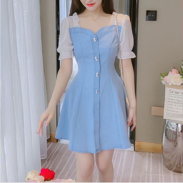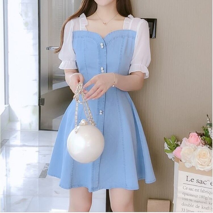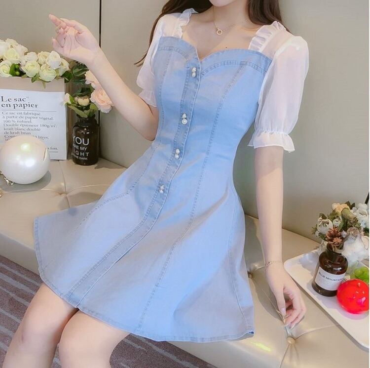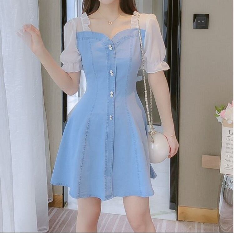 ワンピース ミニ丈 デニム パフスリーブ シンプル レトロ きれいめ 可愛い お呼ばれ お出かけ デート デイリー 夏 ブルー