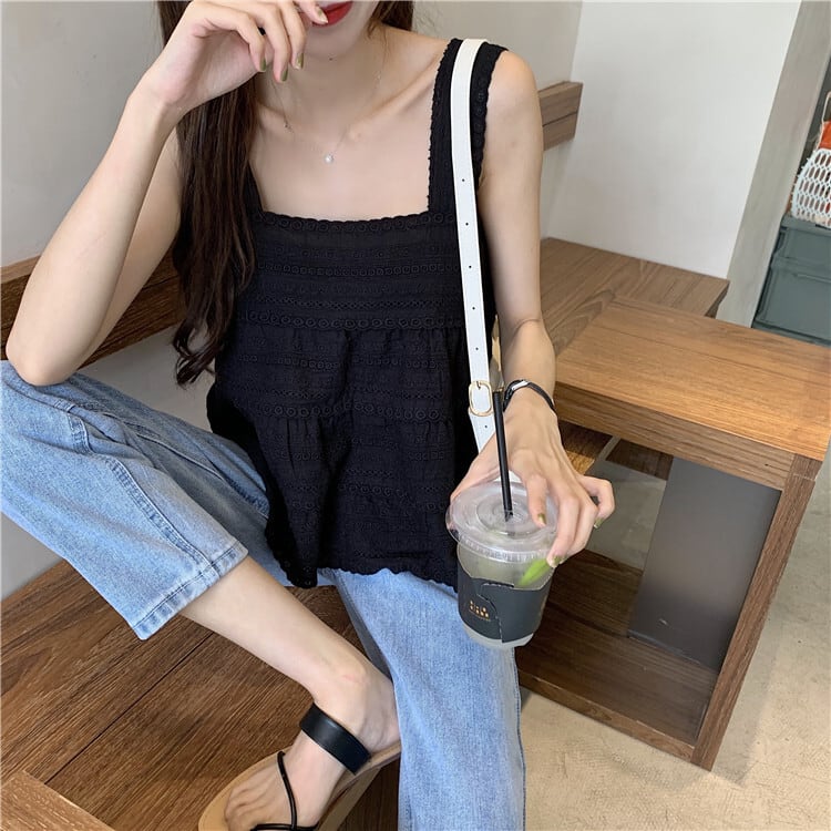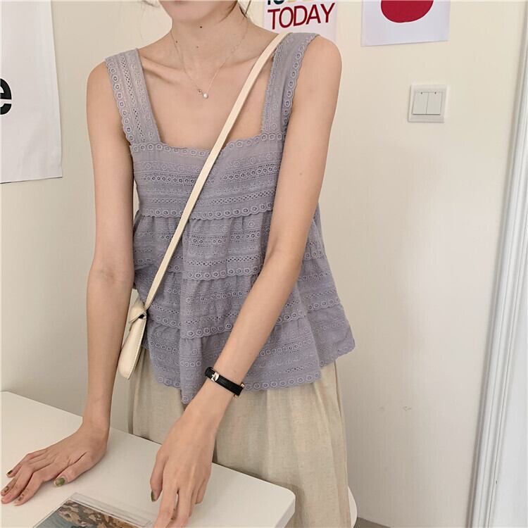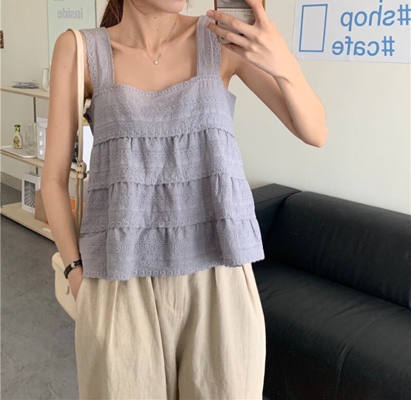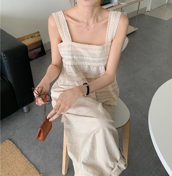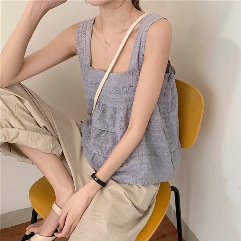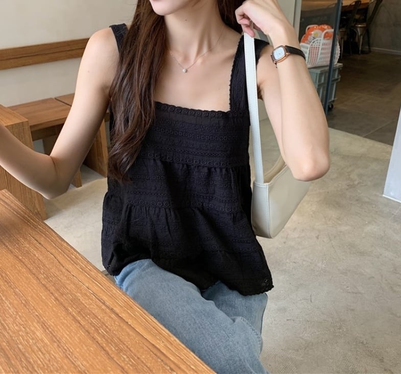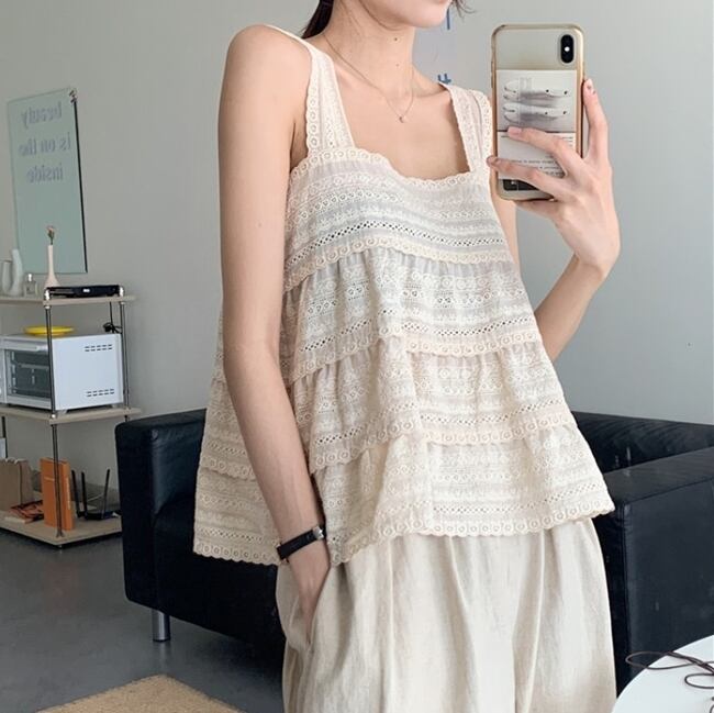 全3色 トップス タンクトップ ノースリーブ レース コットンレース 綿 可愛い シンプル スクエアネック ゆったり ナチュラル カジュアル デイリー リゾート 夏