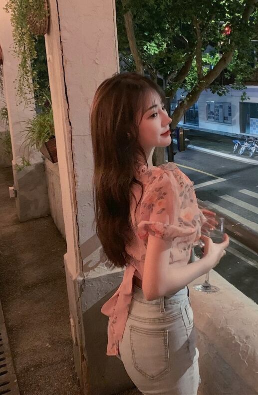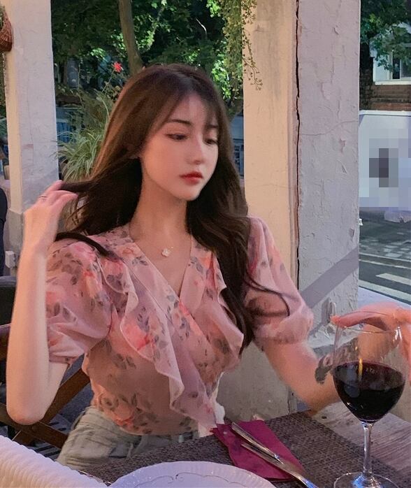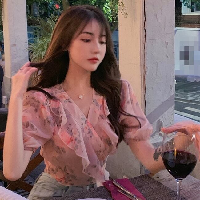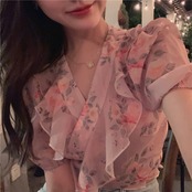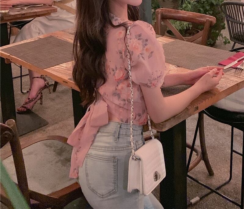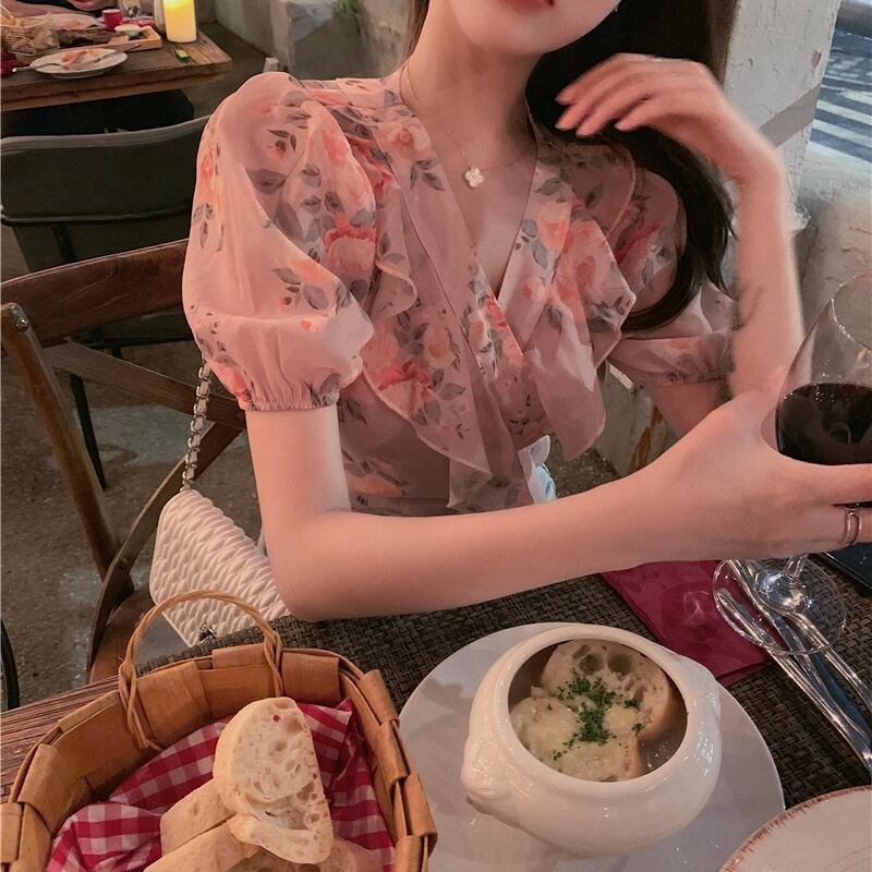 ブラウス 花柄 フリル Vネック 可愛い ガーリー 上品 シフォン 半袖 バックコンシャス バックリボン パフスリーブ デート カジュアル お出かけ リゾート 夏