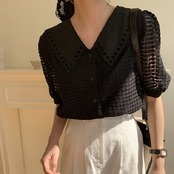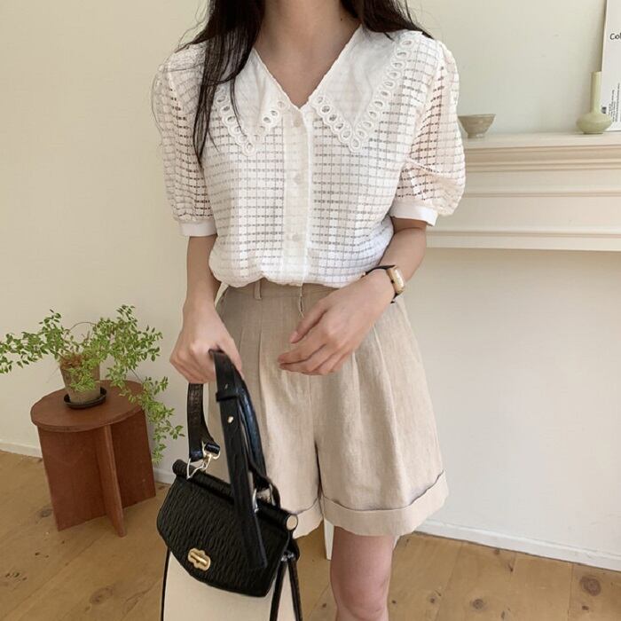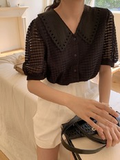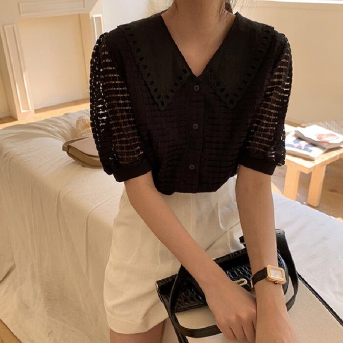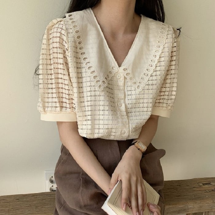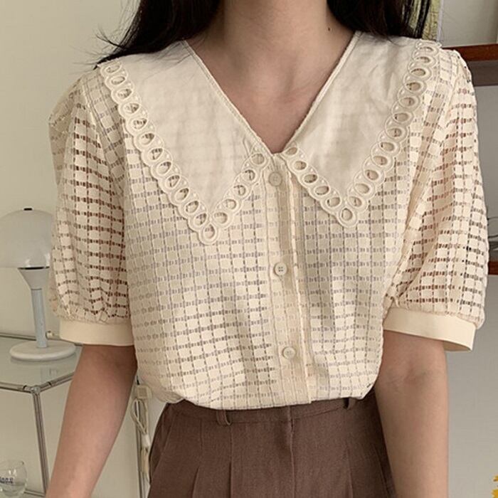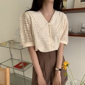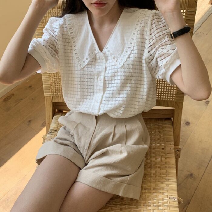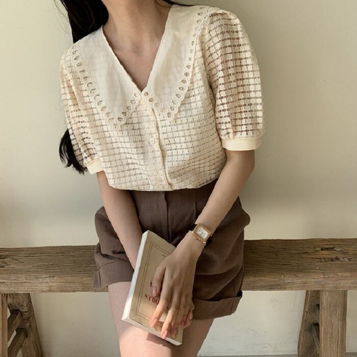 大きめの襟がレトロガーリーな半袖ブラウス。