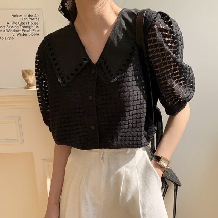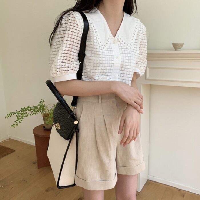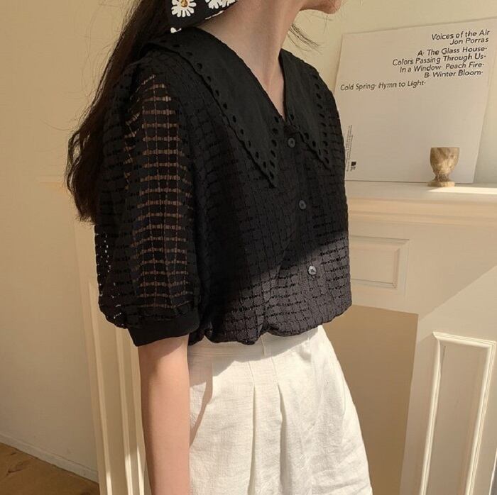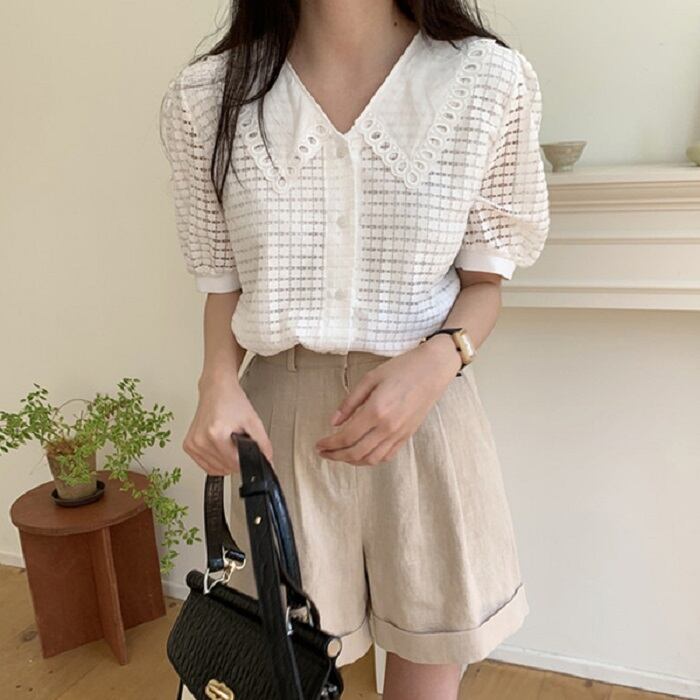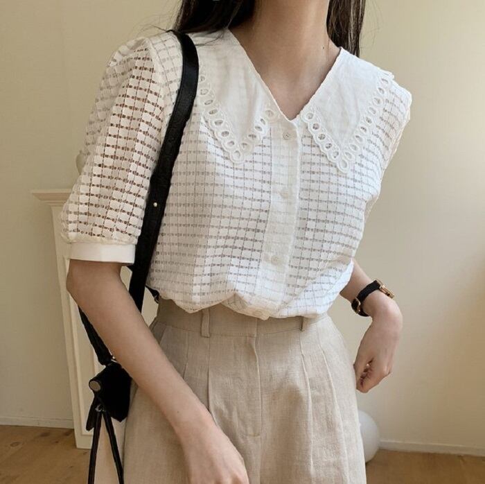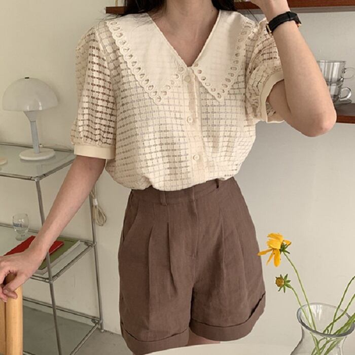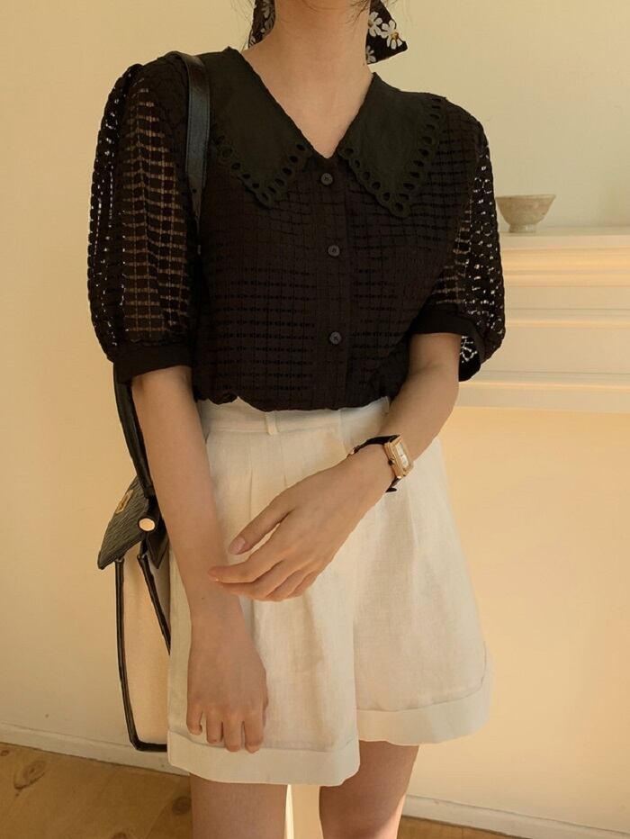 大きめの襟がレトロガーリーな半袖ブラウス。