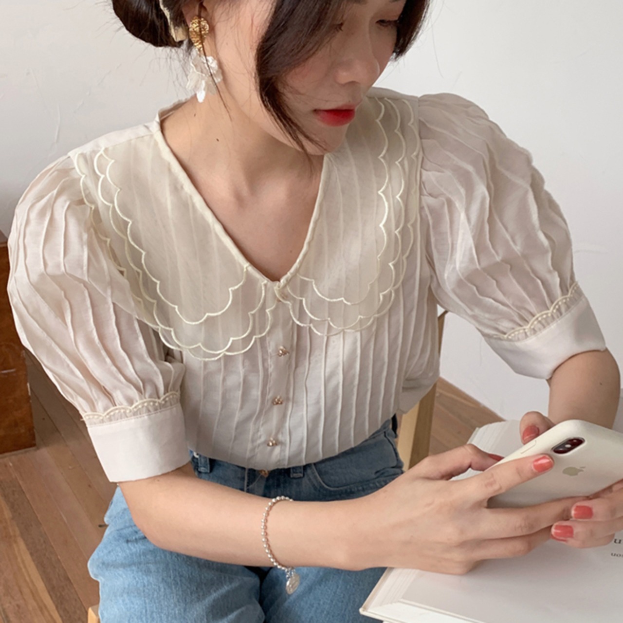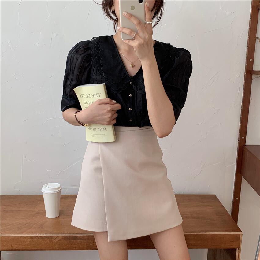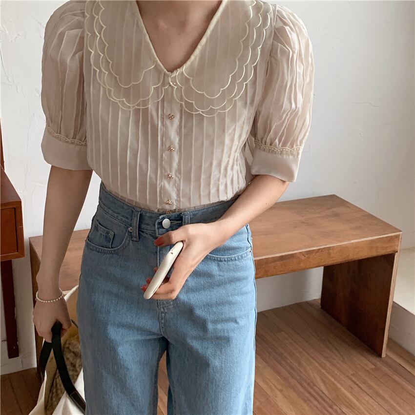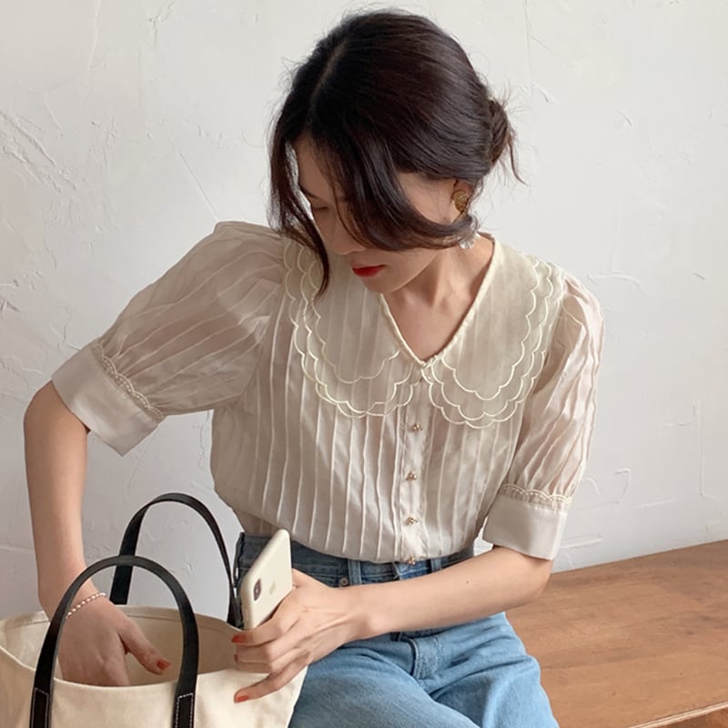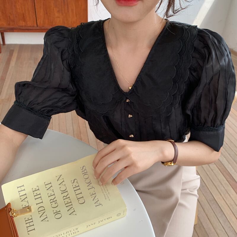 ブラウス トップス シャツ シンプル 5分袖 フロントボタン Vネック カジュアル 襟 きれいめ デート パフスリーブ 上品 ストライプ ムスクテールカラー 大人可愛い 通勤 お出かけ 無地 レトロ 韓国ファッション 夏