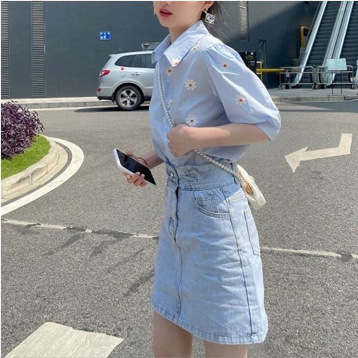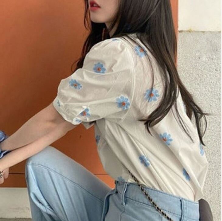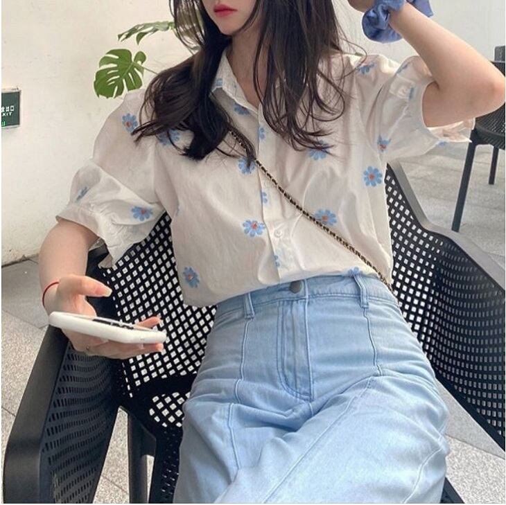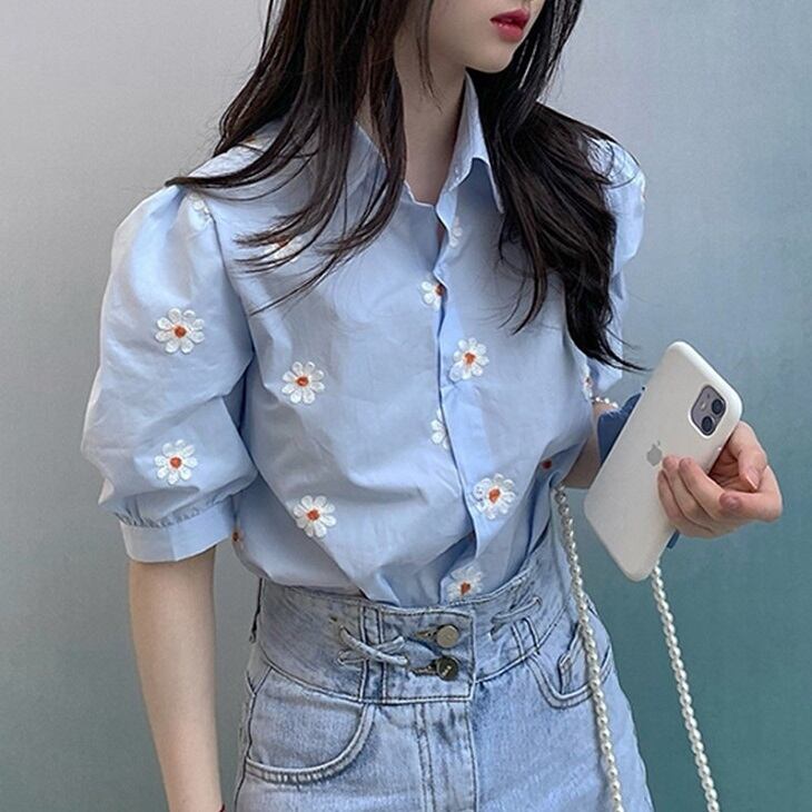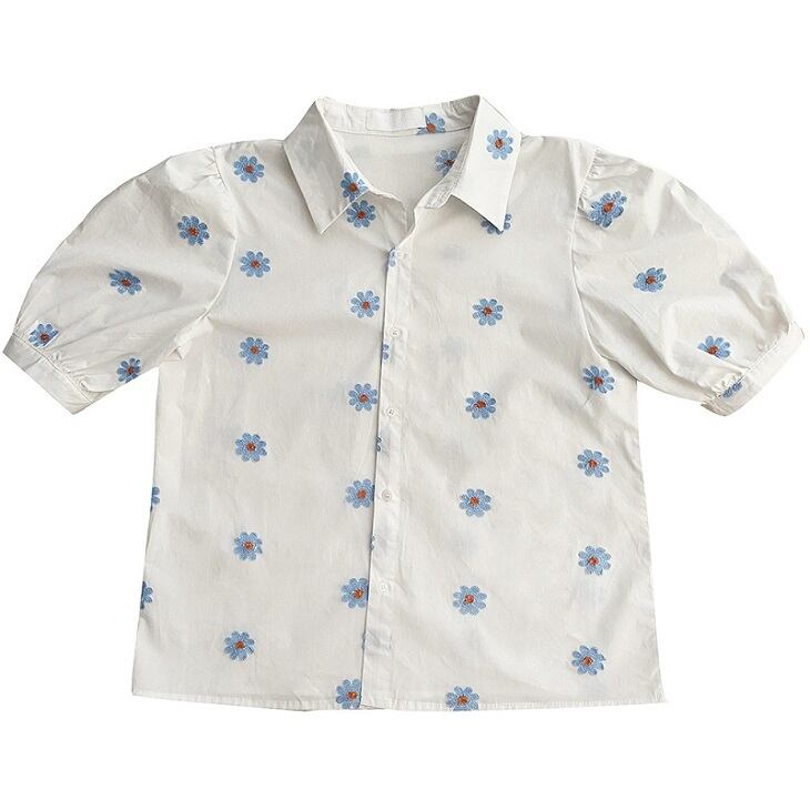 全2色 トップス ブラウス シャツ 襟付き 半袖 デイジー 花柄 フロントボタン カジュアル シンプル レトロ お出かけ デート デイリー 普段着 夏 ホワイト ブルー