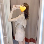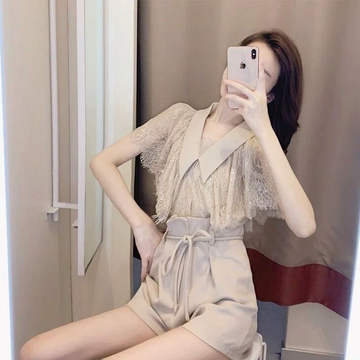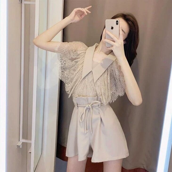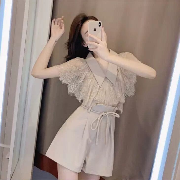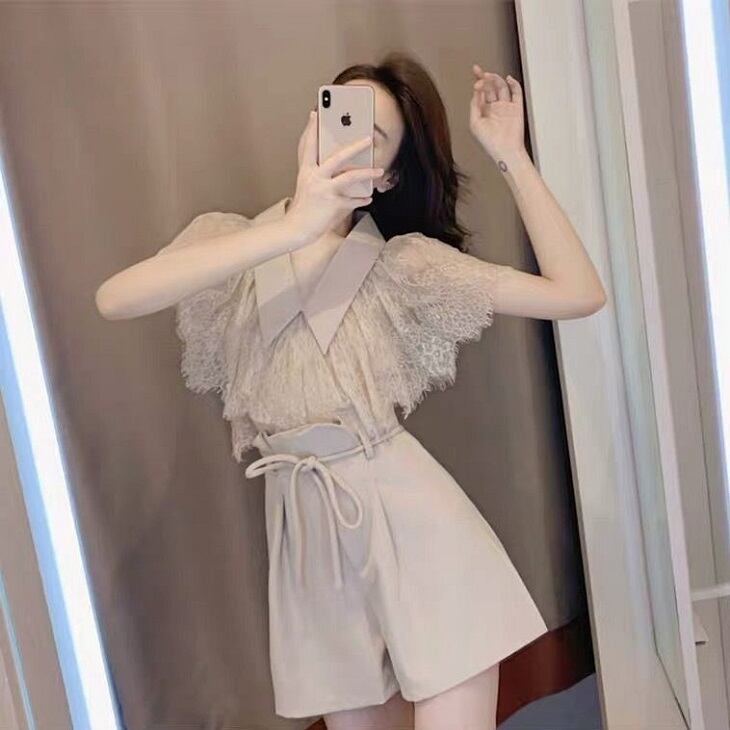レース使いが綺麗なブラウスとショートパンツのセットアップです。