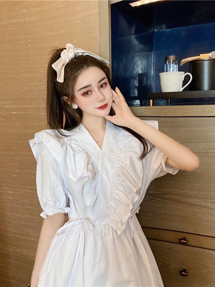 ワンピース ひざ丈 フリル カシュクールネック Vネック 半袖 ウエストリボン フレア 上品 ガーリー 可愛い カジュアル きれいめ お出かけ デート レトロ 夏
