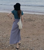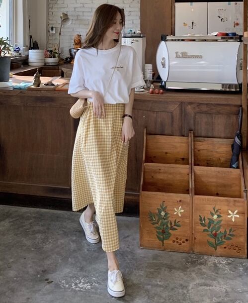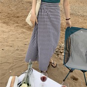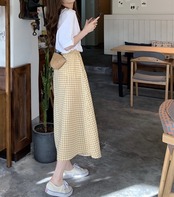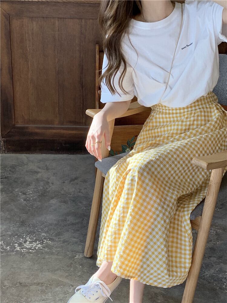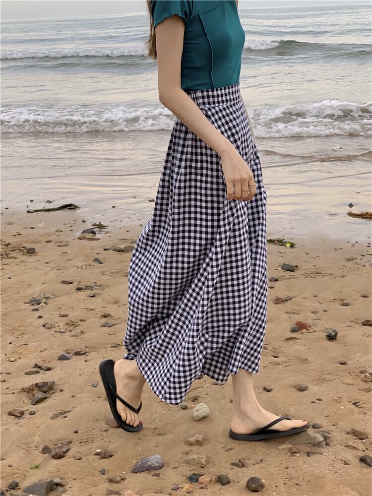 全2色 スカート ミモレ丈 チェック柄 フレア Aライン 大人 ハイウエスト カジュアル ウエストゴム デイリー デート リゾート シンプル レトロ 夏 秋