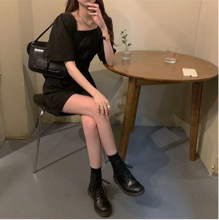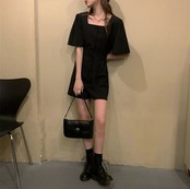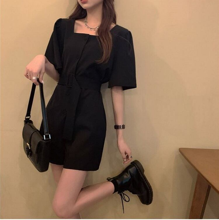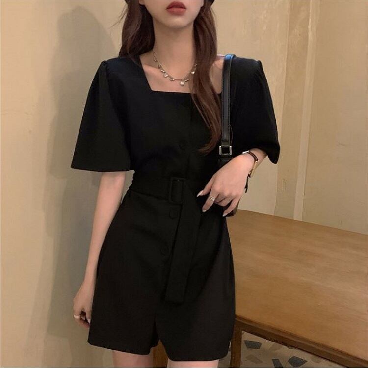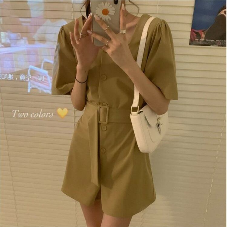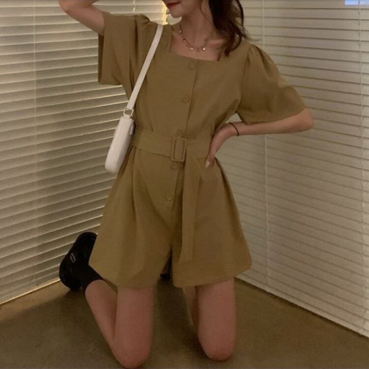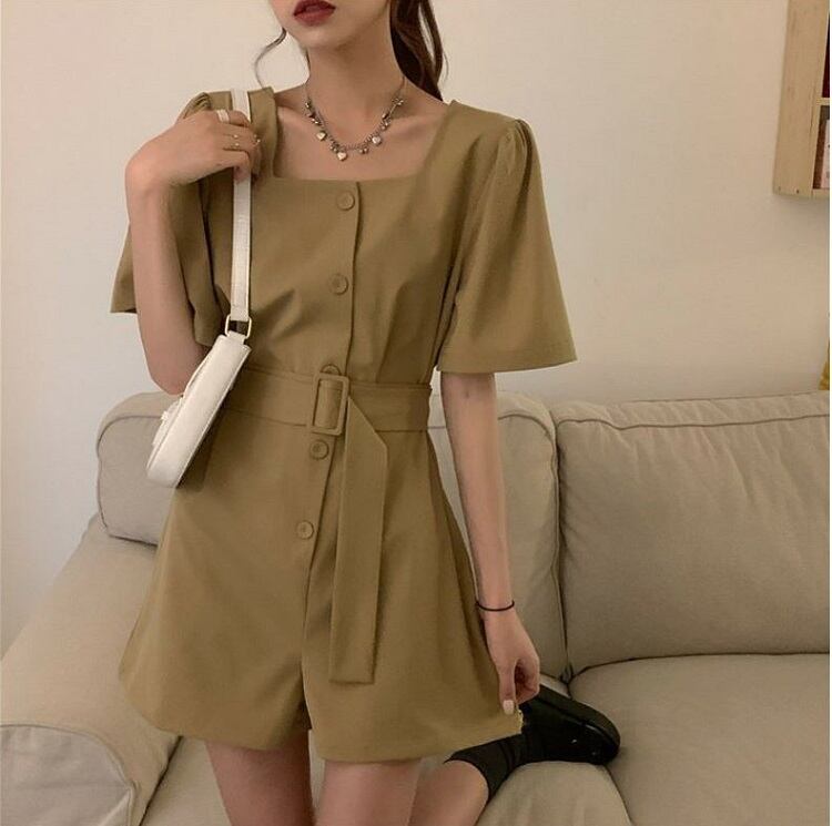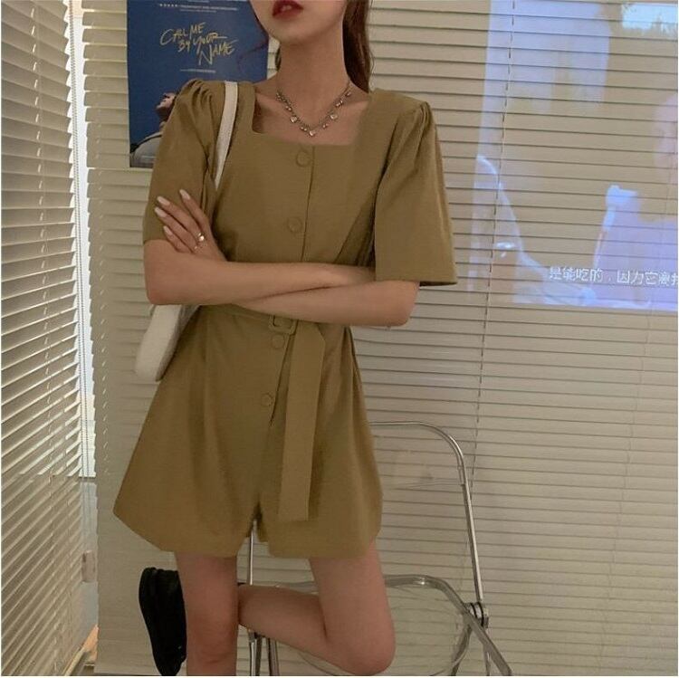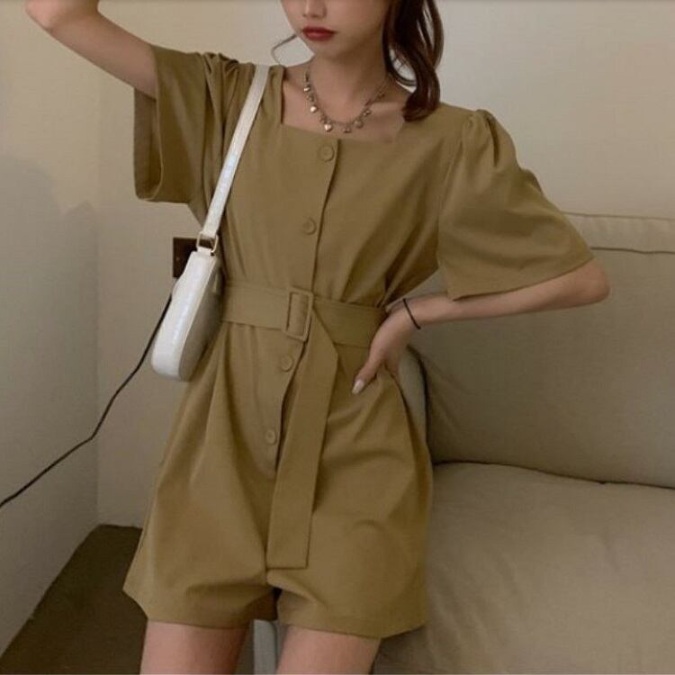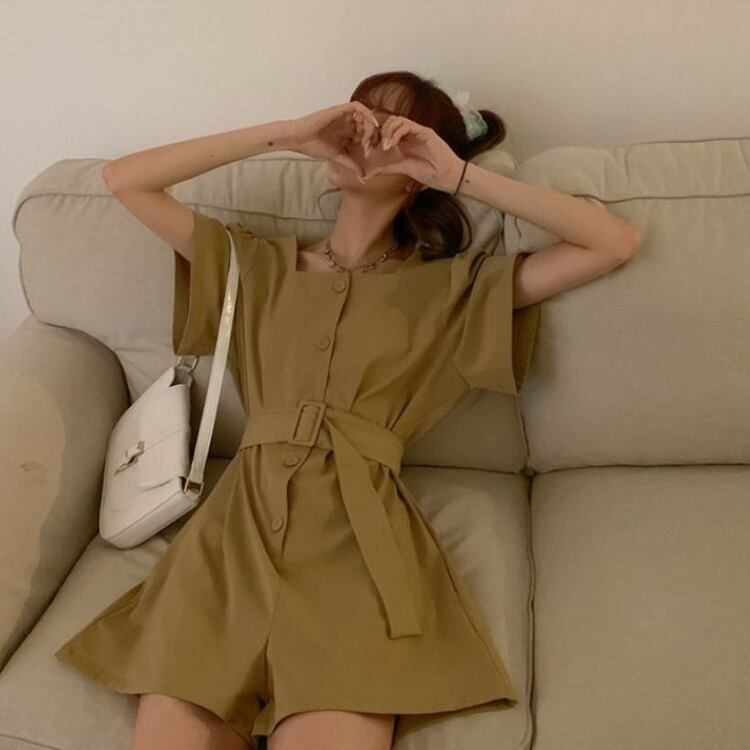全2色 オールインワン ジャンプスーツ ショートパンツ スクエアネック ウエストリボン 半袖 キュロット 無地 きれいめ カジュアル シンプル レトロ 可愛い 上品 リゾート デイリー 夏 カーキ ブラック