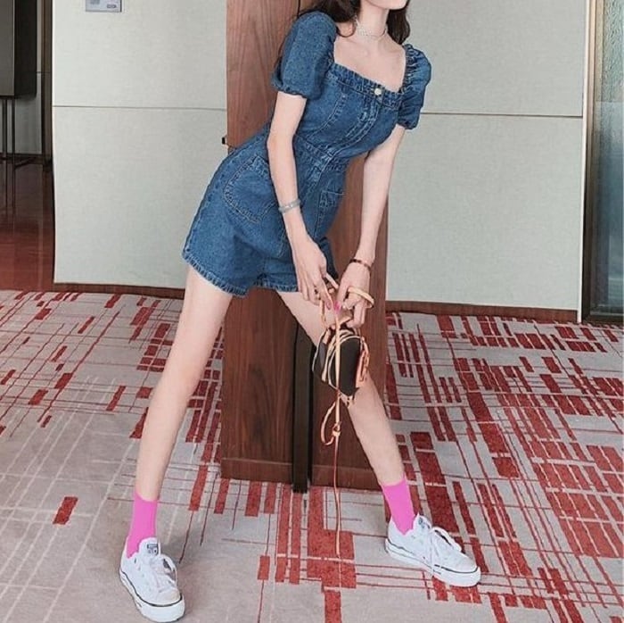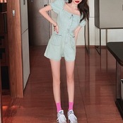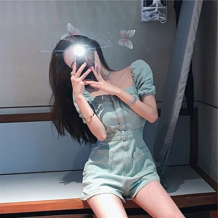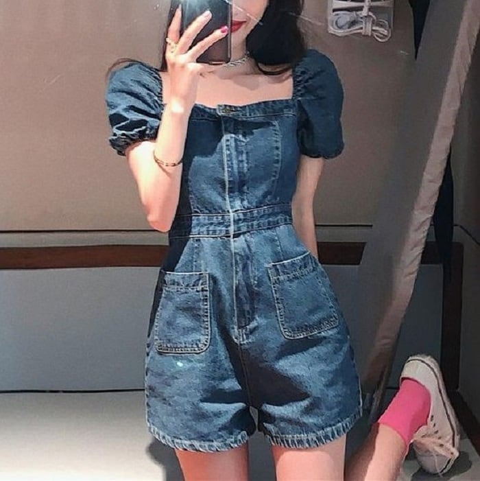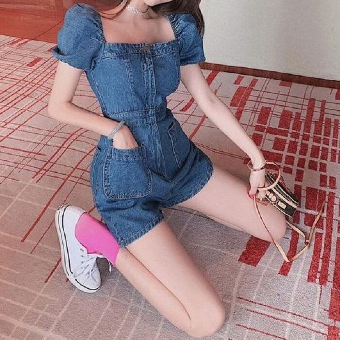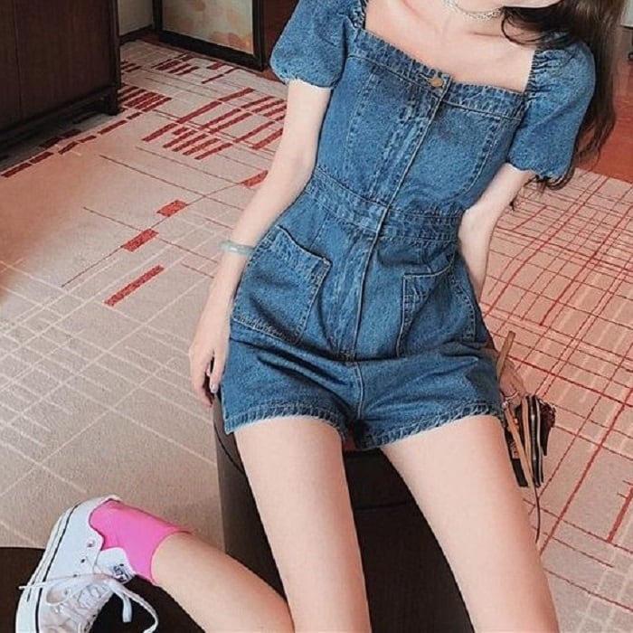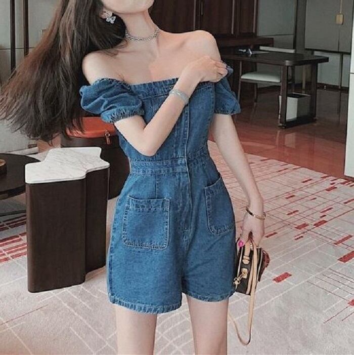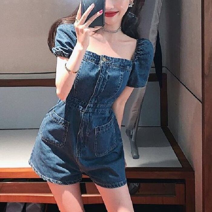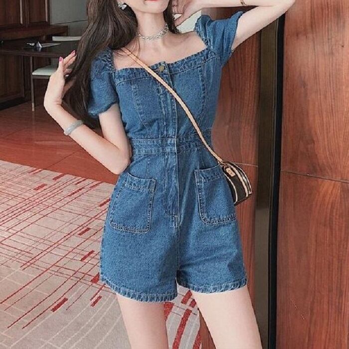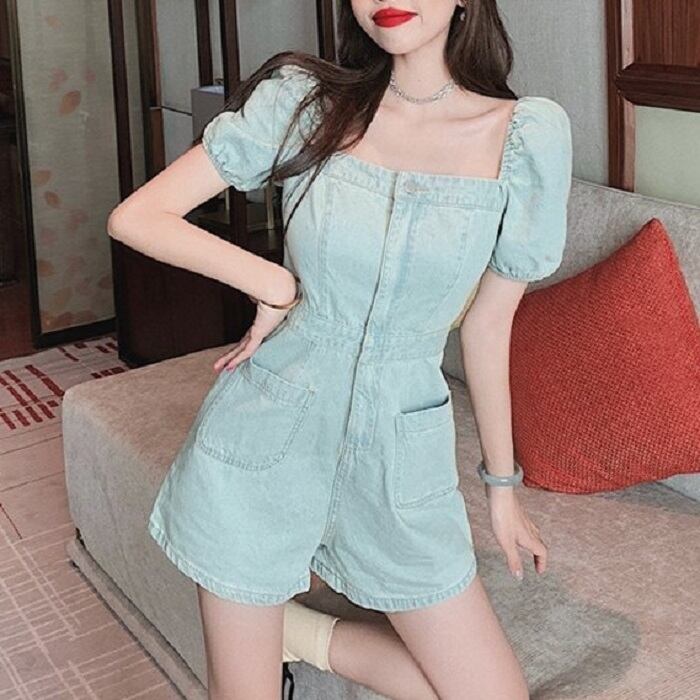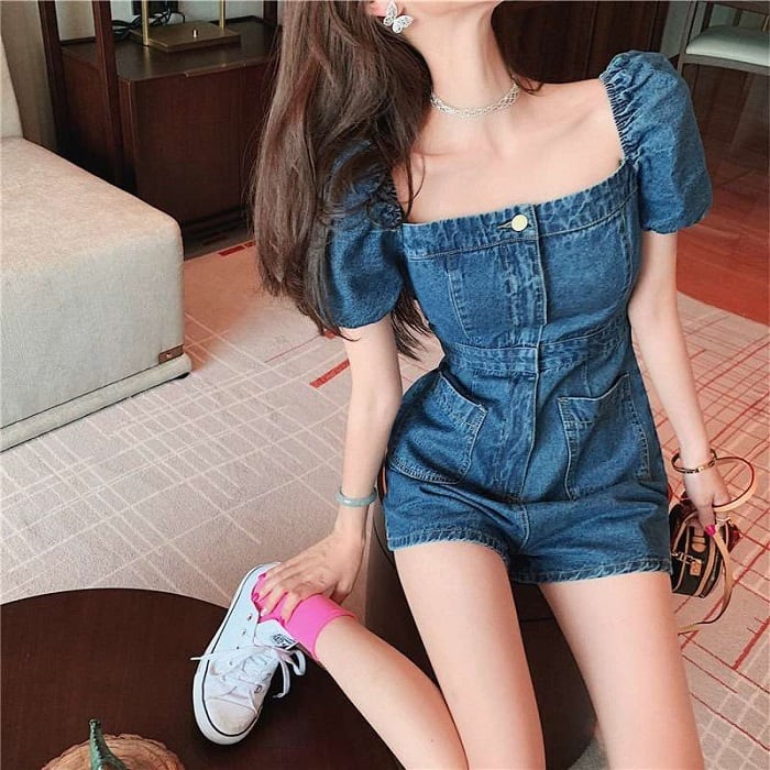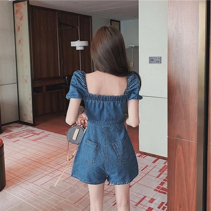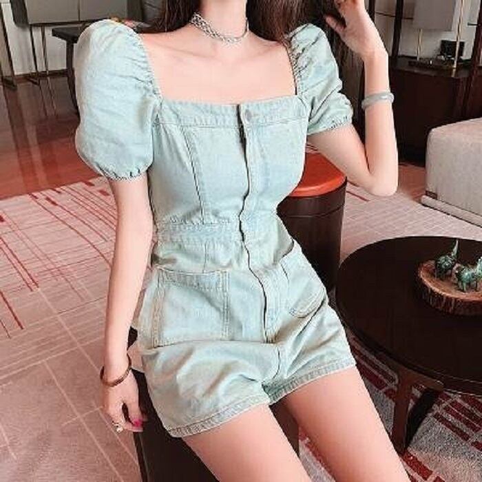 全2色 オールインワン デニム ジャンプスーツ ショートパンツ ハイウエスト スクエアネック パフスリーブ オフショルダー 半袖 無地 カジュアル シンプル レトロ 可愛い お出かけ リゾート デイリー 夏 ライトブルー ネイビー