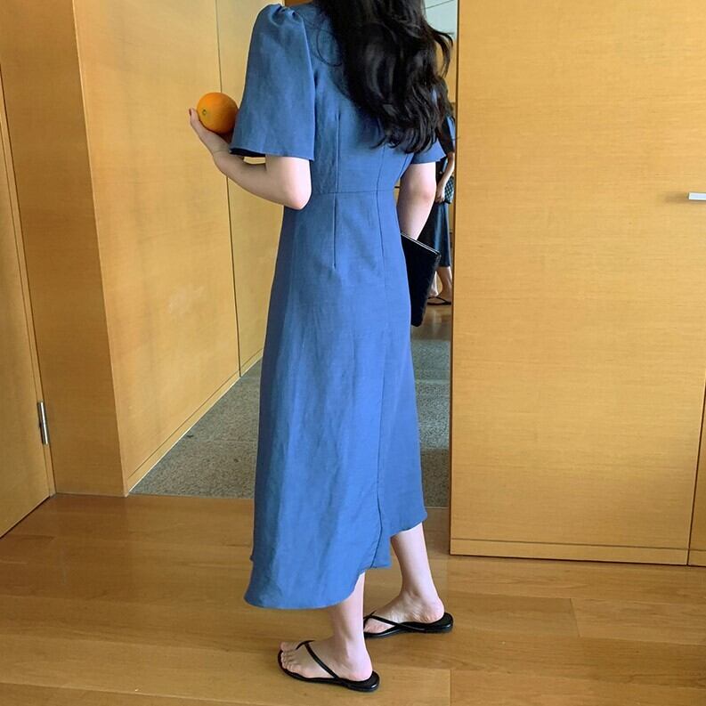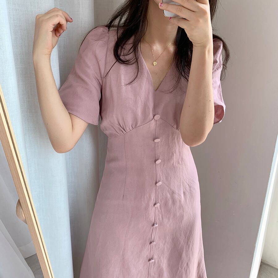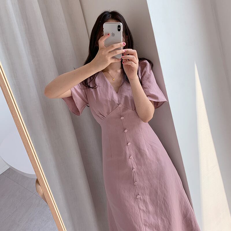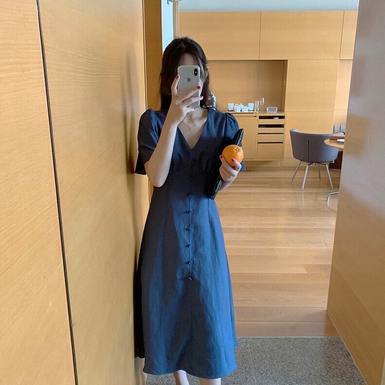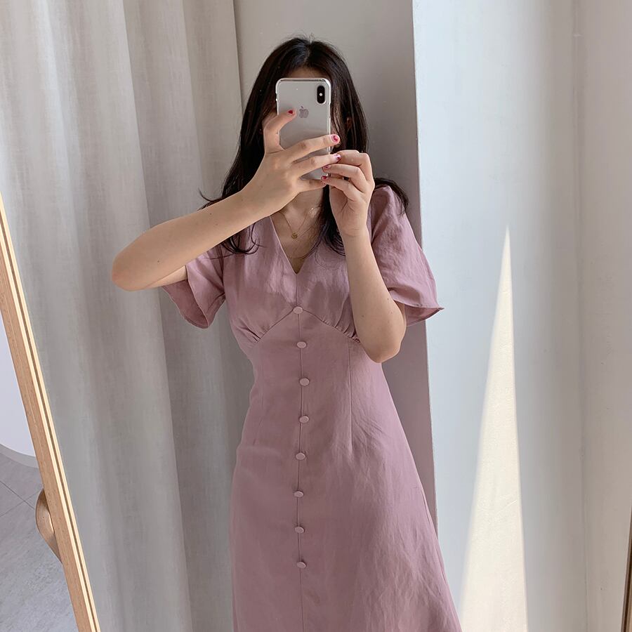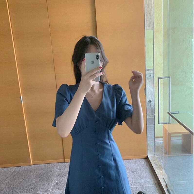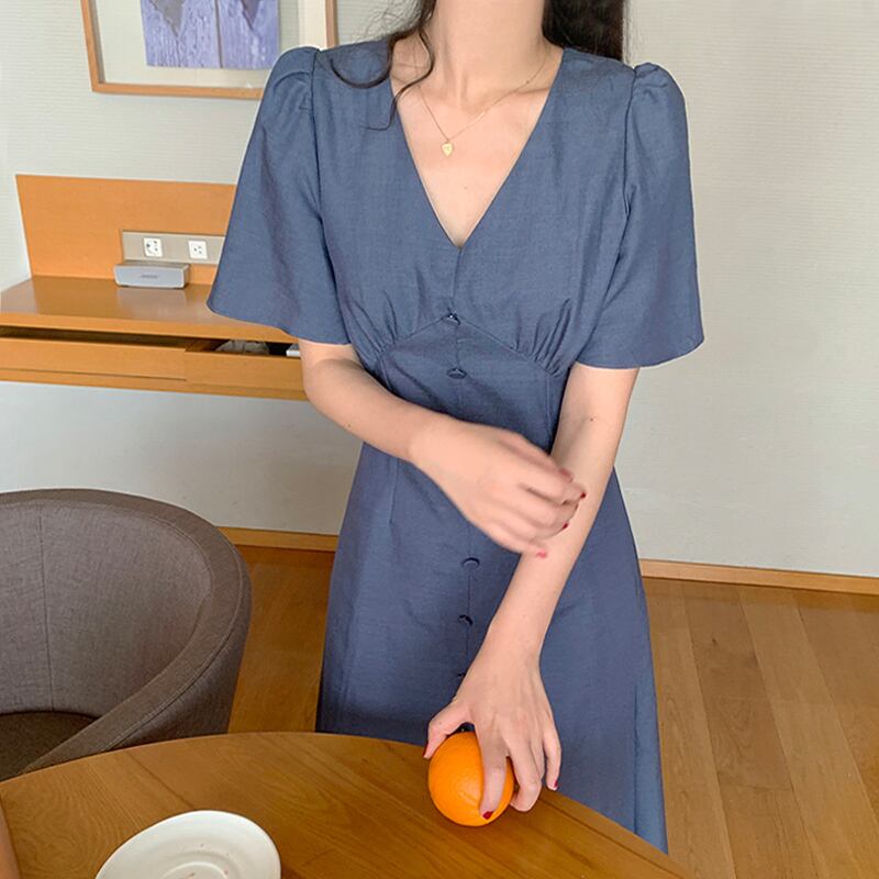 全2色 ワンピース Vネック 半袖 フロントボタン ひざ丈 ミディ丈 フレアスカート 無地 きれいめ カジュアル シンプル レトロ リゾート デイリー 夏 ブルー ピンク