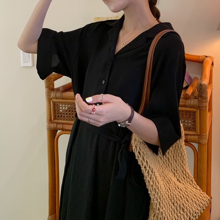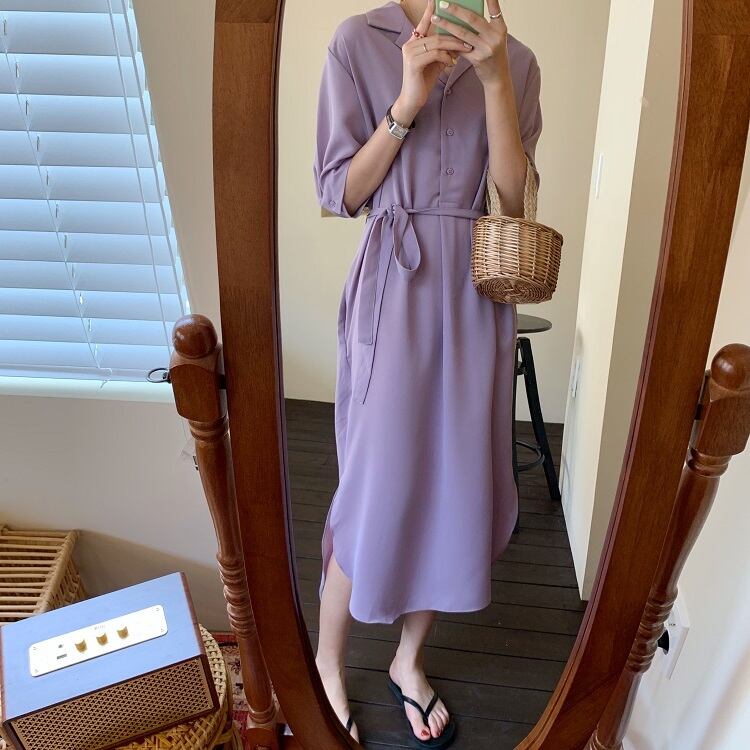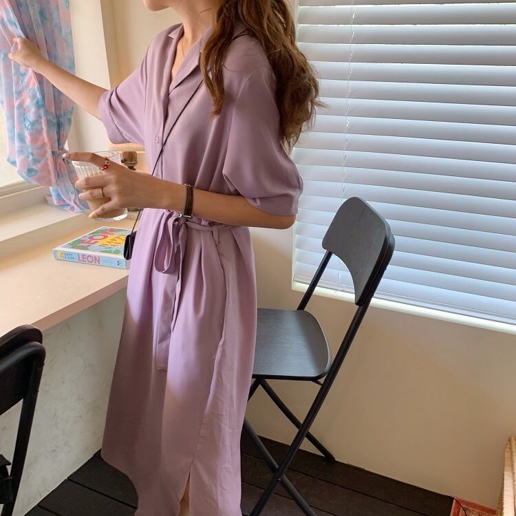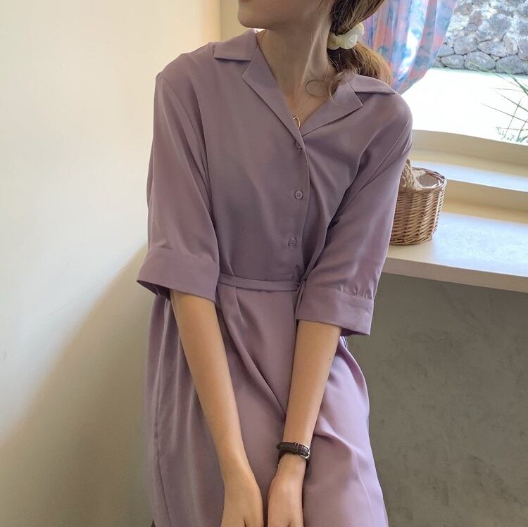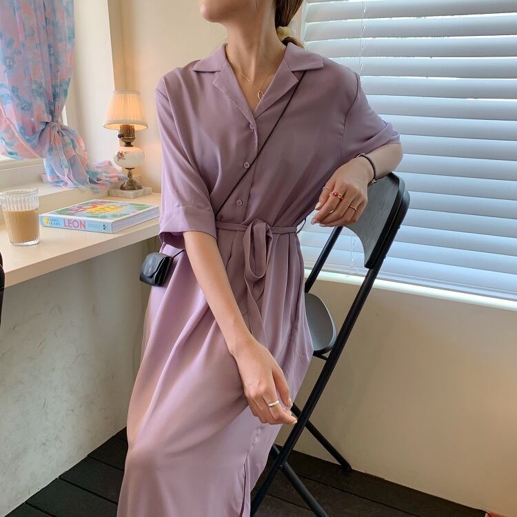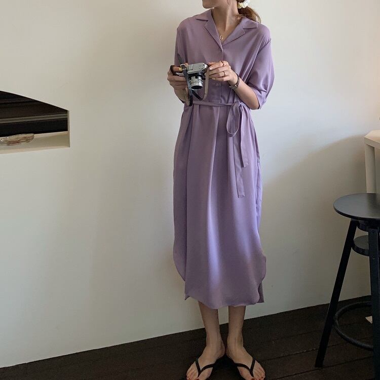 全2色 シフォンワンピース シャツワンピース 襟付き Vネック 半袖 5分袖 ウエストリボン ロング丈 ミディ丈 無地 きれいめ カジュアル シンプル レトロ お出かけ デート オフィス リゾート デイリー 夏 パープル ブラック