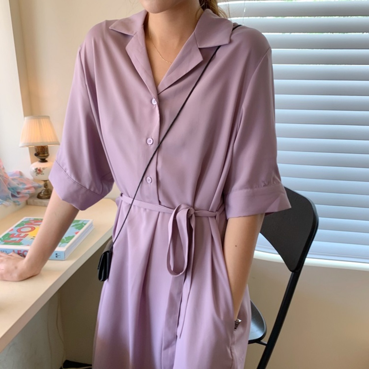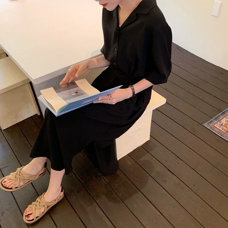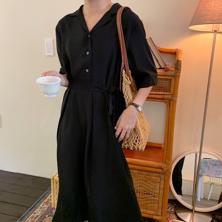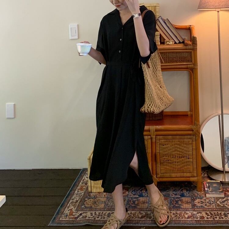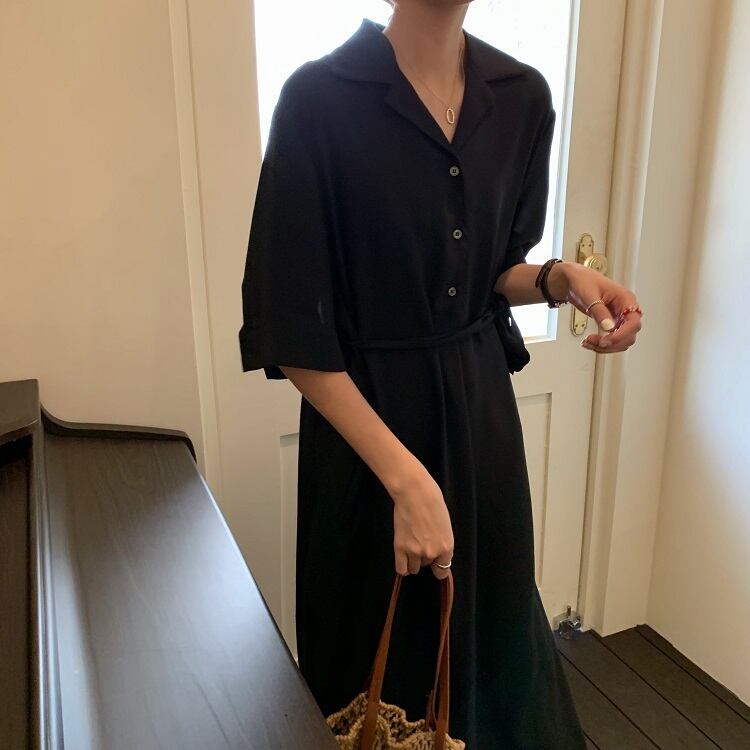 全2色 シフォンワンピース シャツワンピース 襟付き Vネック 半袖 5分袖 ウエストリボン ロング丈 ミディ丈 無地 きれいめ カジュアル シンプル レトロ お出かけ デート オフィス リゾート デイリー 夏 パープル ブラック