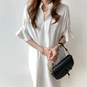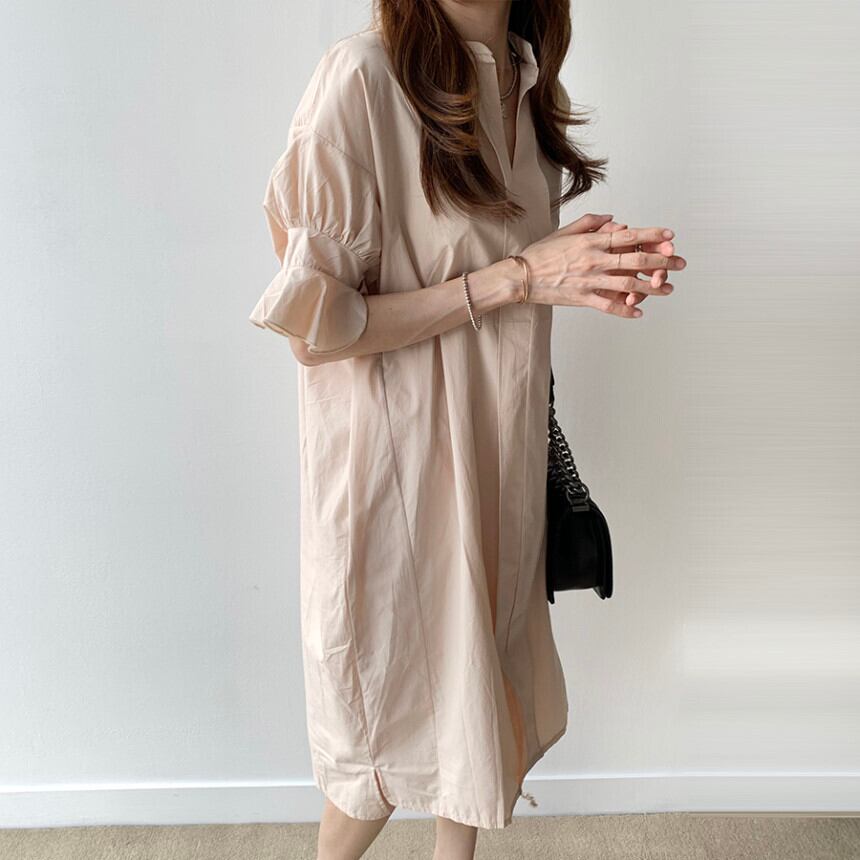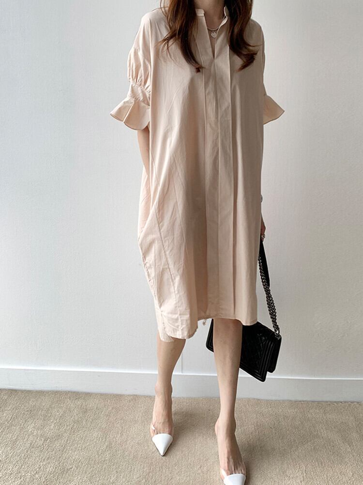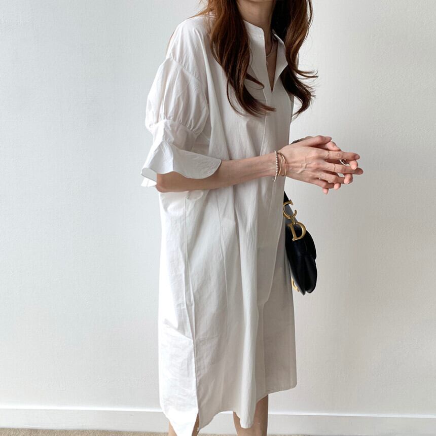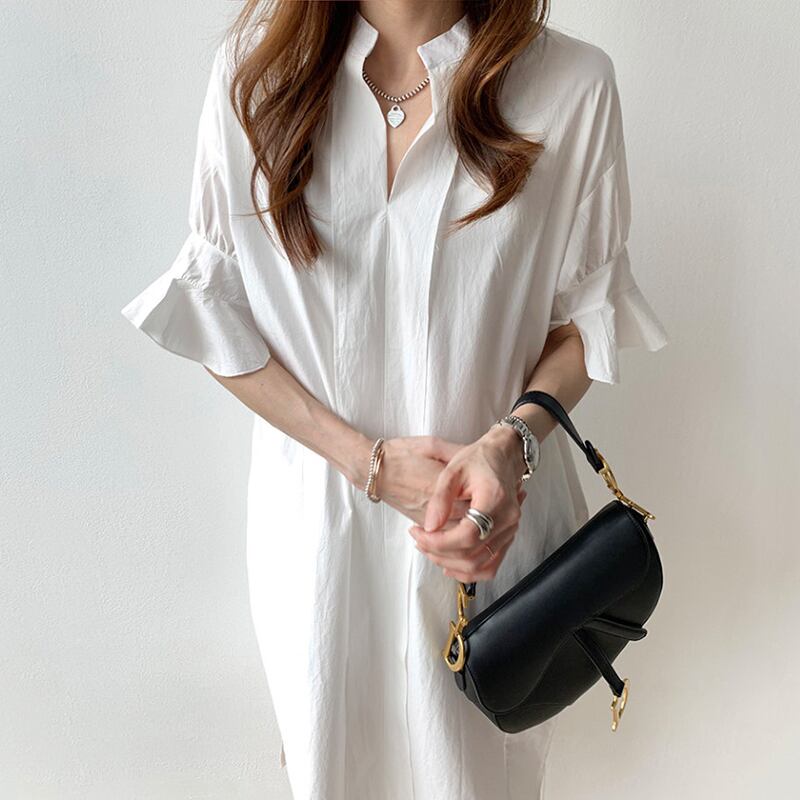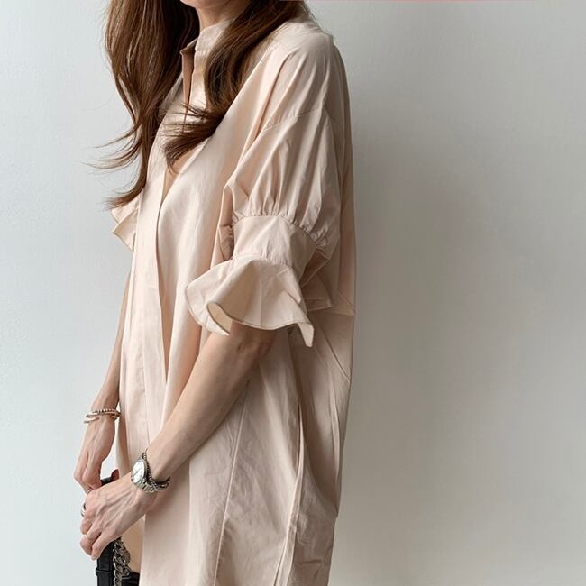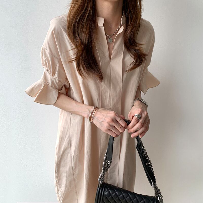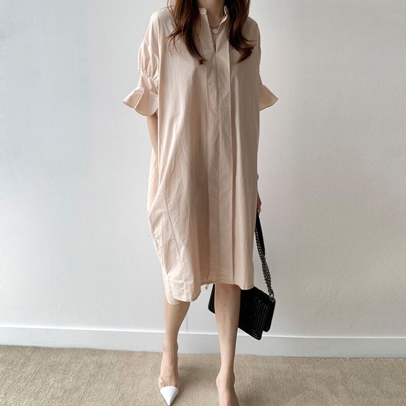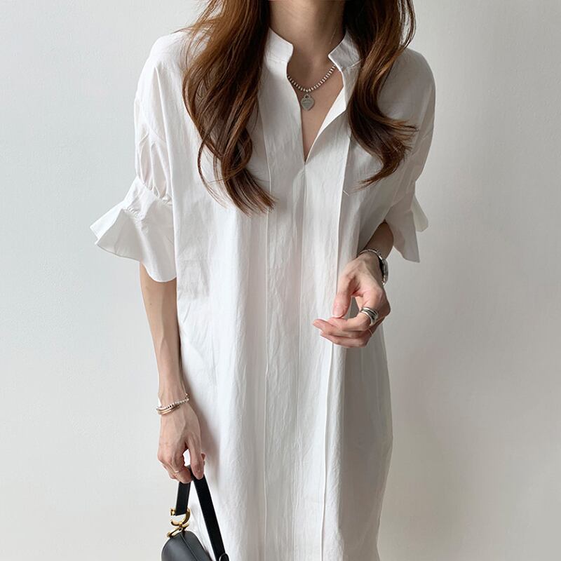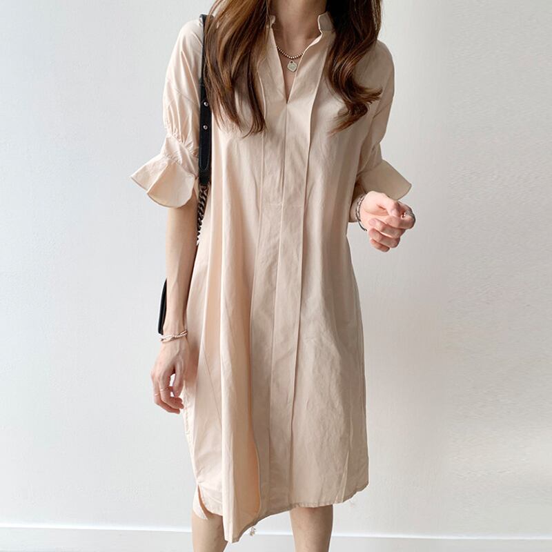 全2色 ワンピース ひざ丈 シャツワンピース チュニック スタンドカラー Vネック 大人 フリル 体型カバー フレアスリーブ 5分袖 ゆったり 袖コンシャス サイドスリット カジュアル お出かけ 韓国ファッション 夏