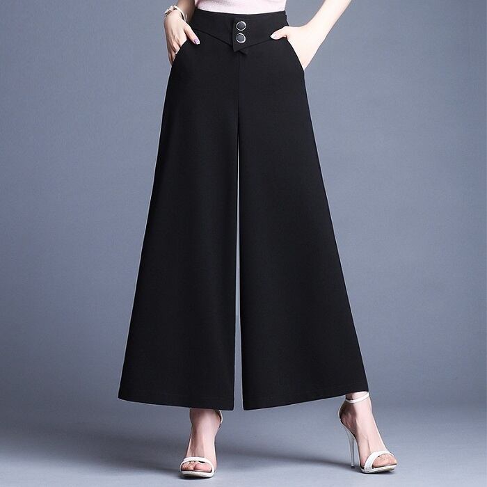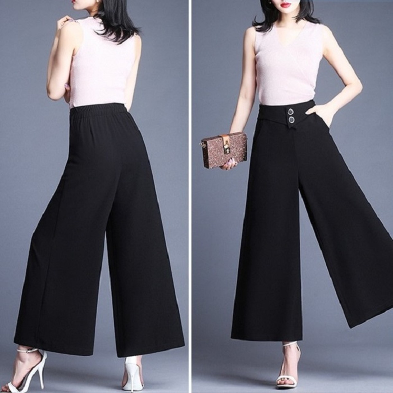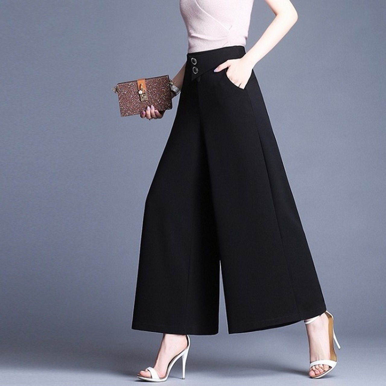 大きいサイズ ワイドパンツ ボトムス ハイウエスト ゆったり ウエストゴム サイドファスナー カジュアル シンプル レトロ お出かけ オフィス デート リゾート デイリー 夏 ブラック