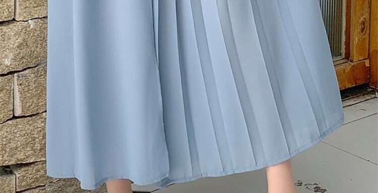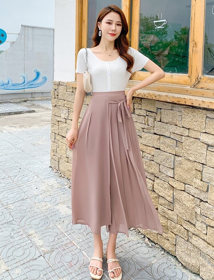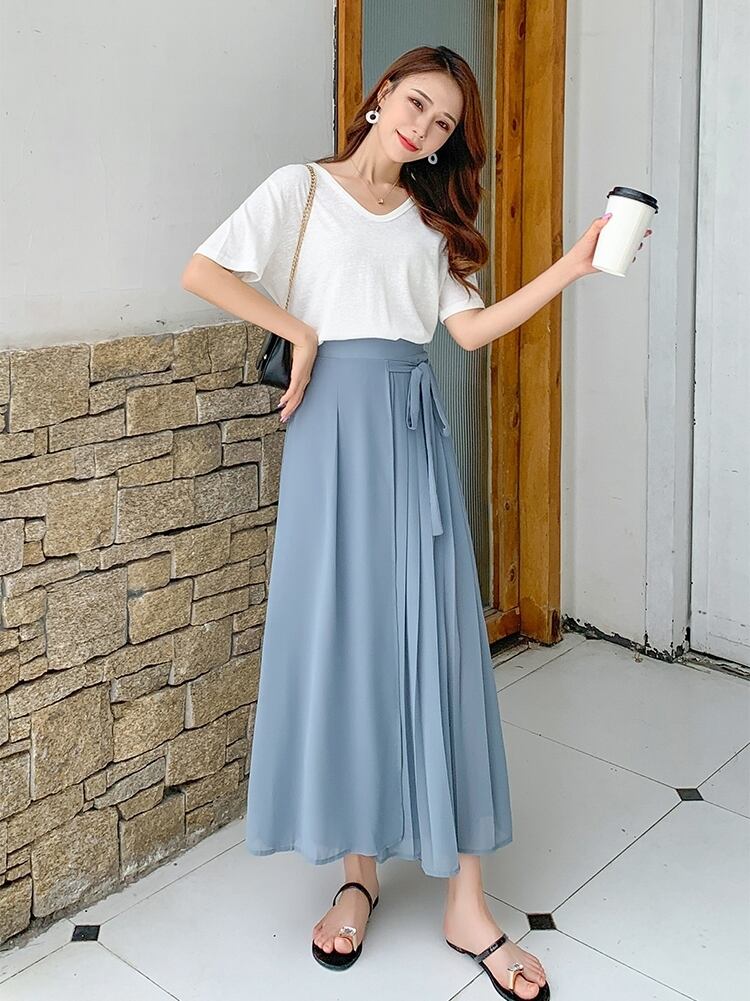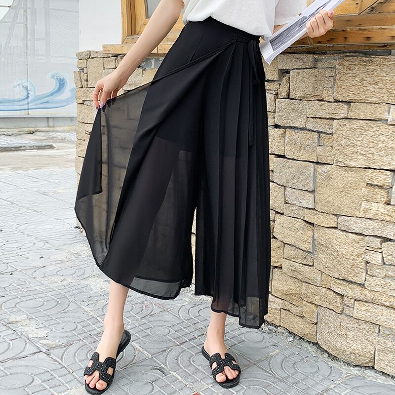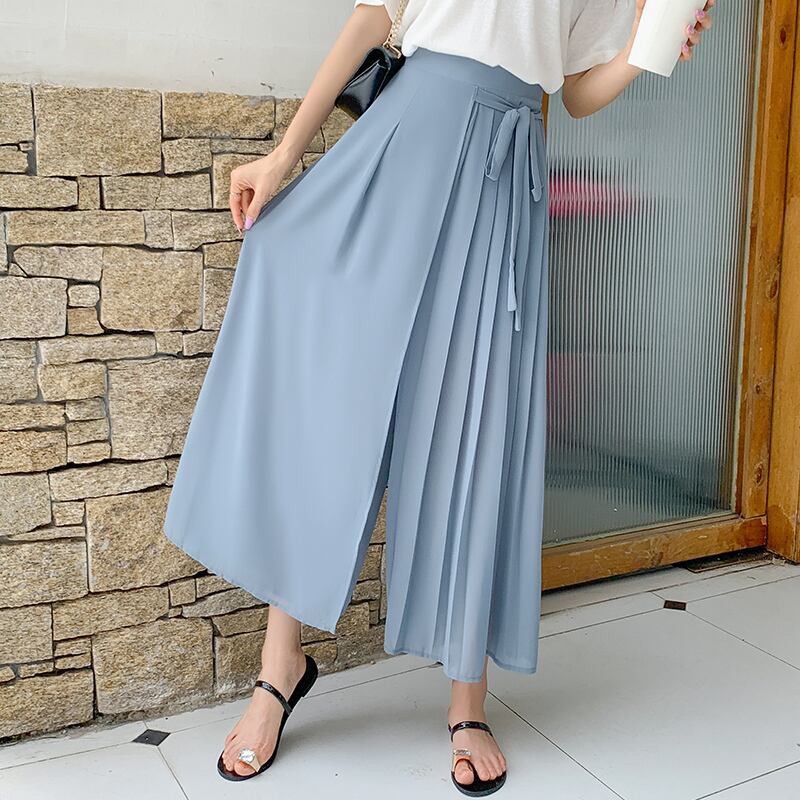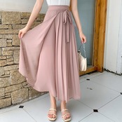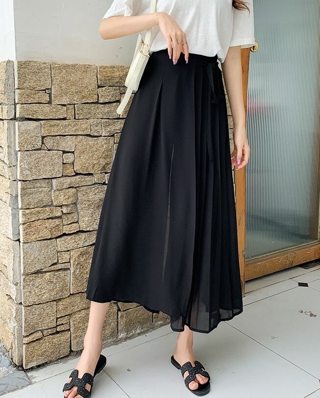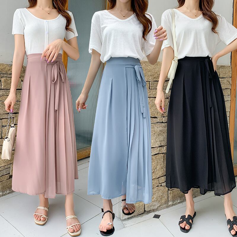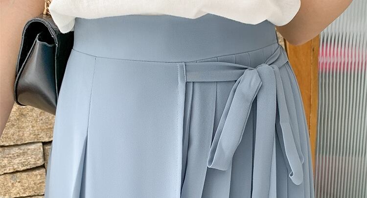 全3色 パンツ ワイドパンツ ボトムス ワイドレッグ ゆったり プリーツ Aライン フレア リボン カジュアル 上品 シフォン 大人 きれいめ お出かけ デート 韓国ファッション 夏 秋