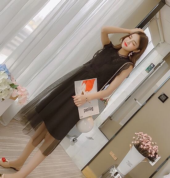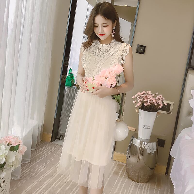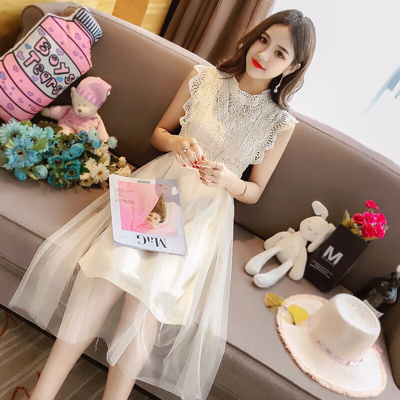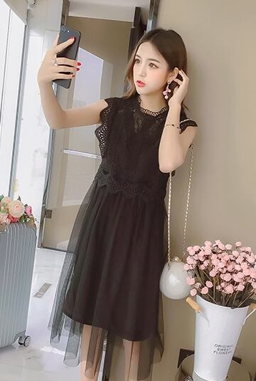 全2色 ワンピース レース ドレス フレア チュール ノースリーブ シースルー ボトルネック ミモレ丈 ガーリー 可愛い カジュアル きれいめ 上品 きれいめ お呼ばれ 女子会 デート 夏