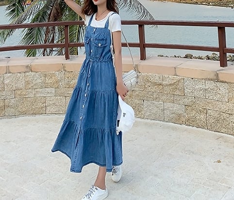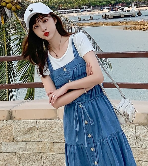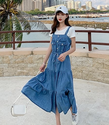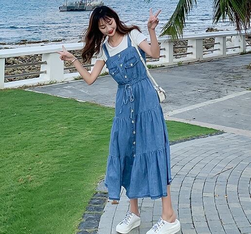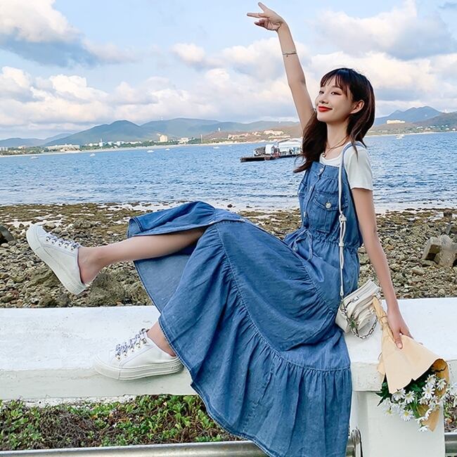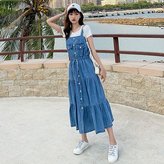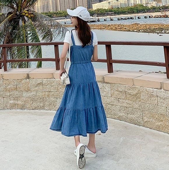 デニムワンピース ティアード キャミソールワンピ フロントボタン ミモレ丈 フレア Aライン 可愛い ウエストリボン ハイウエスト カジュアル デイリー リゾート デート 韓国ファッション 夏
