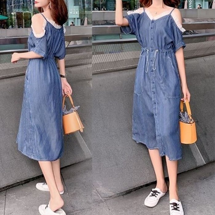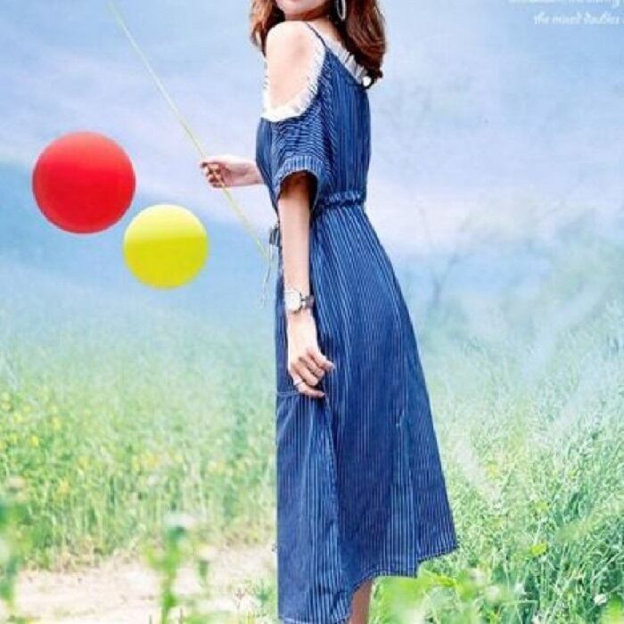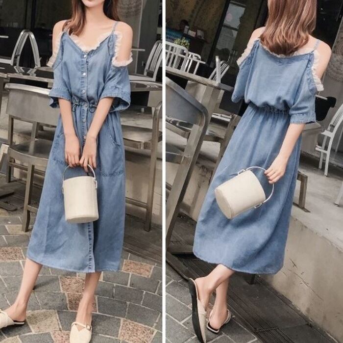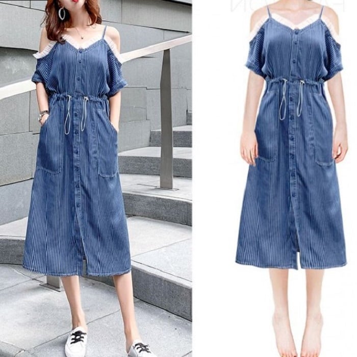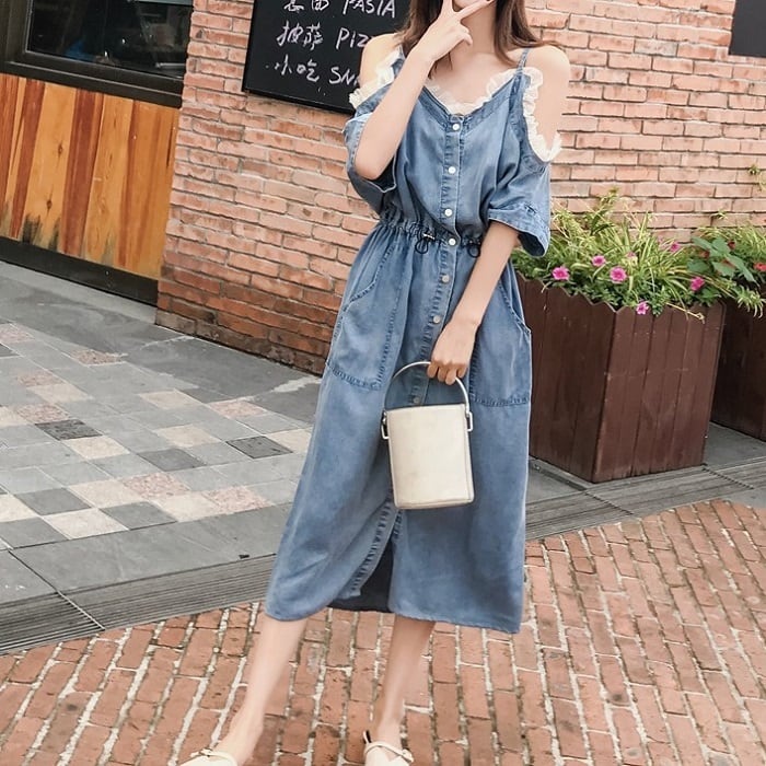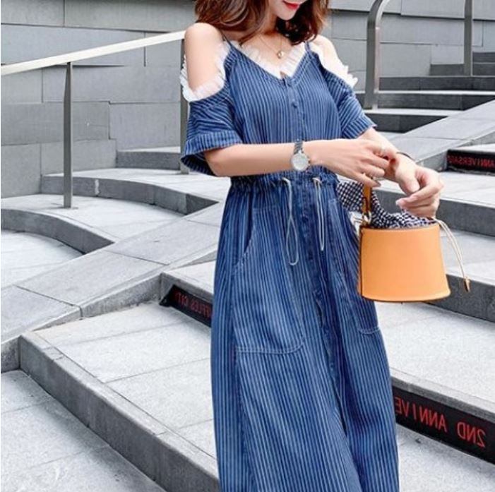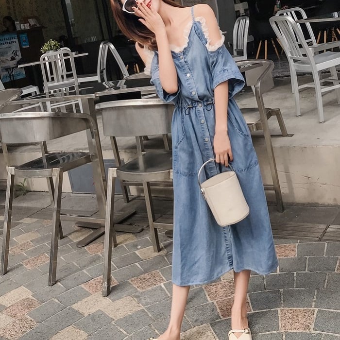 ショルダーストラップ付きのオフショルダーがお洒落なデニムワンピース。