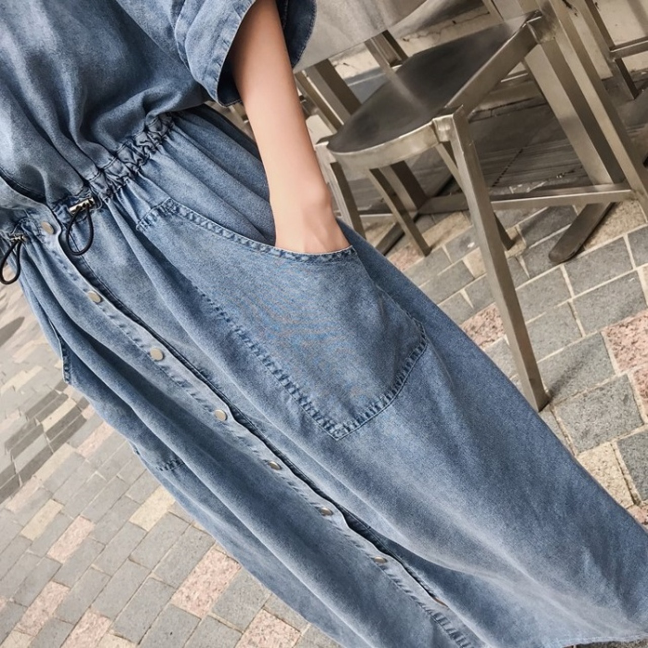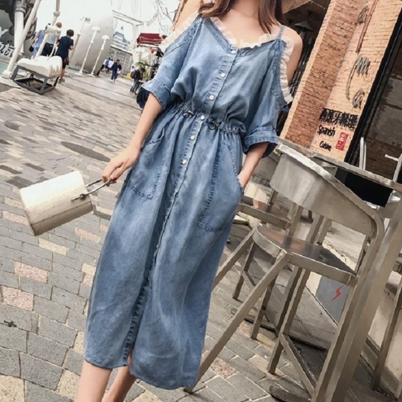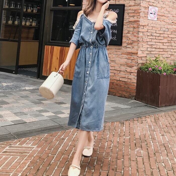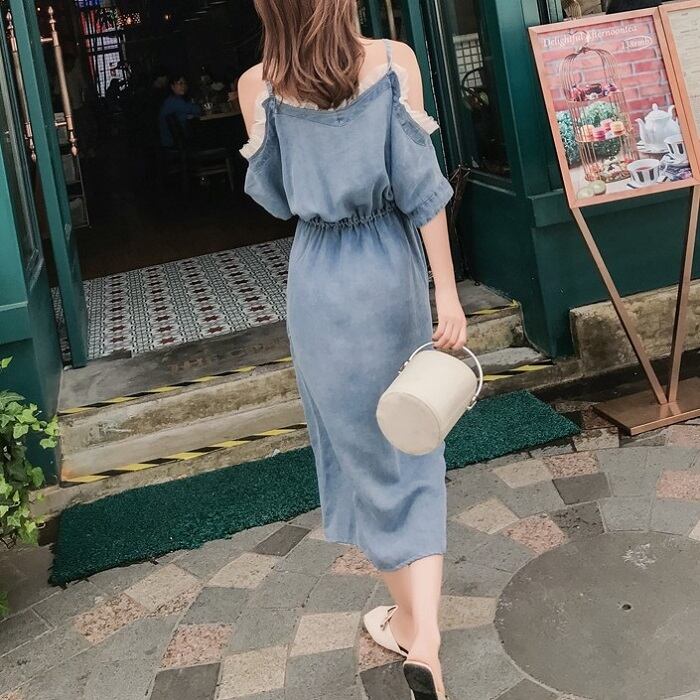 全2色 デニムワンピース ひざ丈 ミディ丈 オフショルダー ウエストリボン カジュアル シンプル レトロ セクシー お出かけ デート リゾート デイリー 夏 ブルー