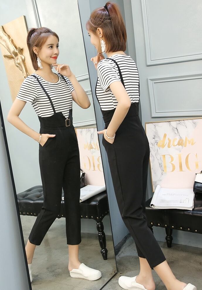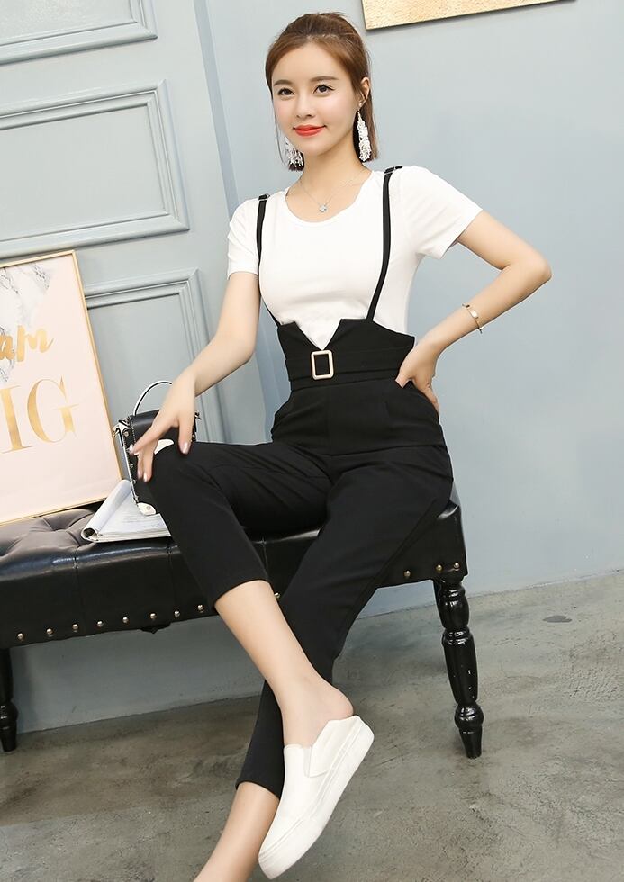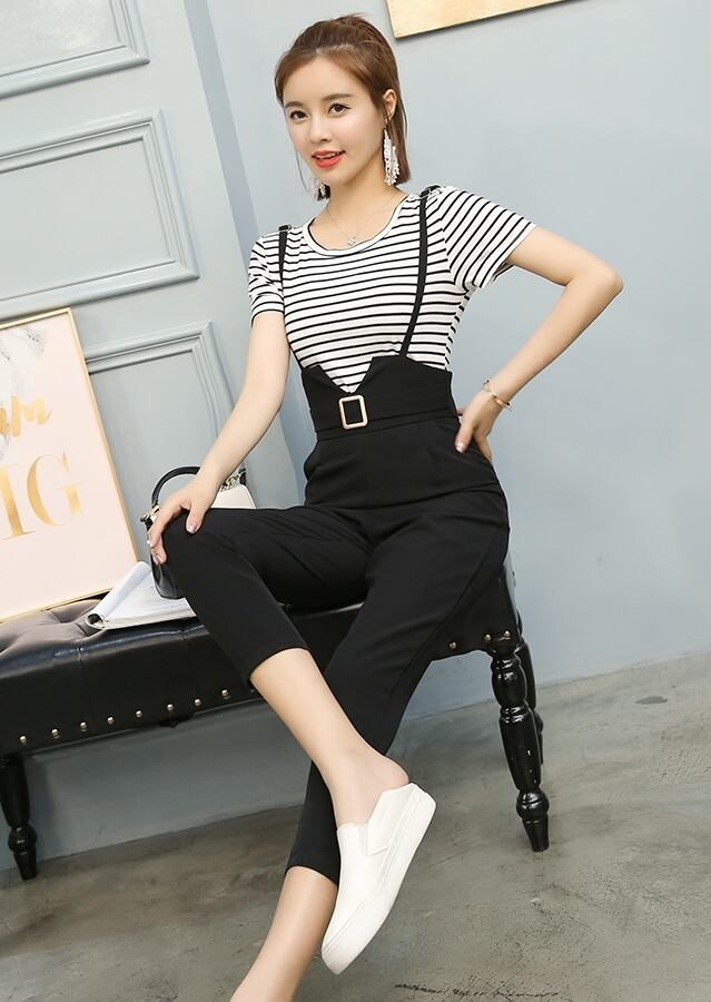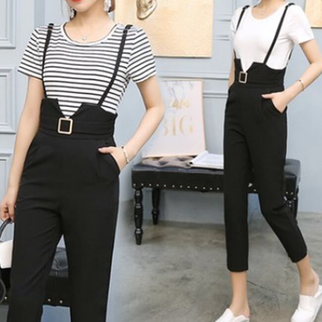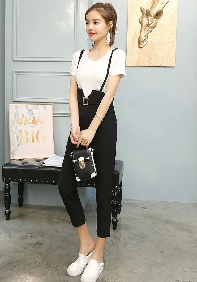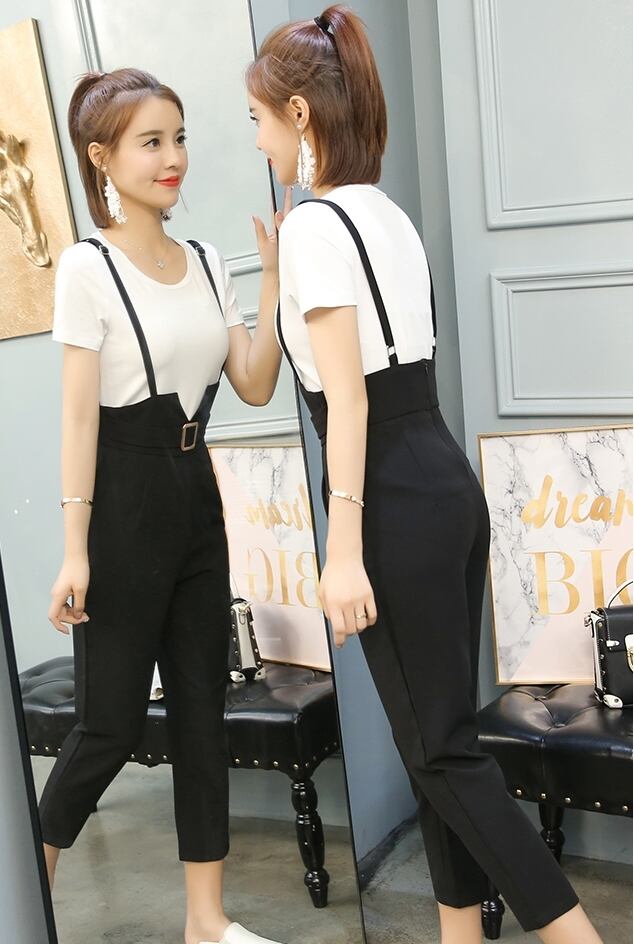 全2色 セットアップ ツーピース サロペット オーバーオール Tシャツ インナー付き 半袖 大人可愛い カジュアル デイリー 8分丈 スリム クルーネック デート ハイウエスト 韓国ファッション 夏 秋