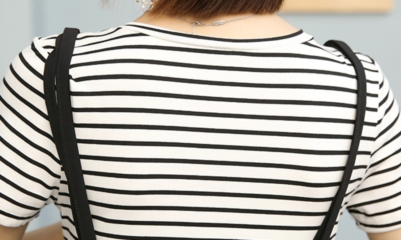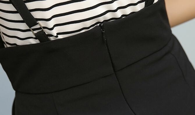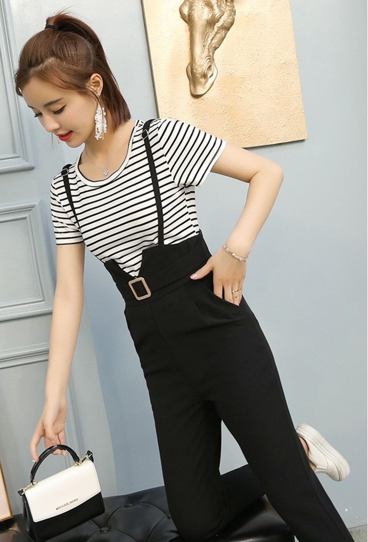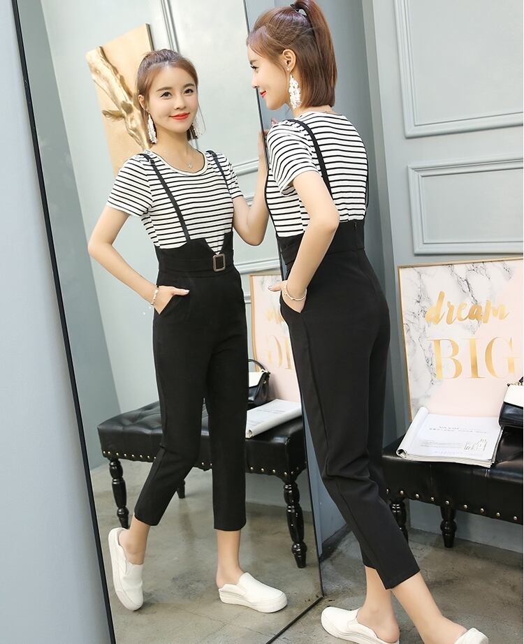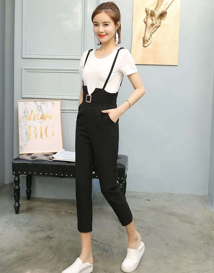 全2色 セットアップ ツーピース サロペット オーバーオール Tシャツ インナー付き 半袖 大人可愛い カジュアル デイリー 8分丈 スリム クルーネック デート ハイウエスト 韓国ファッション 夏 秋