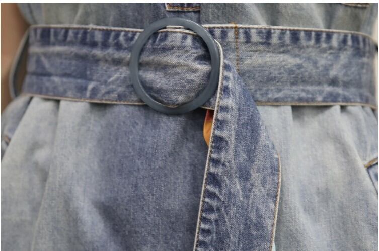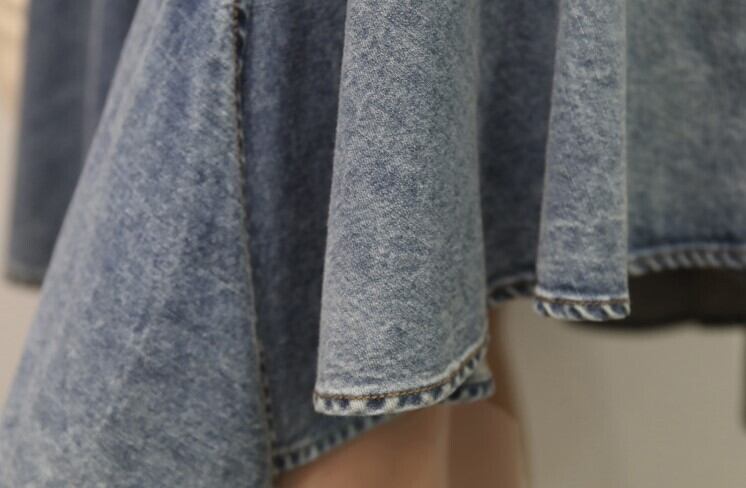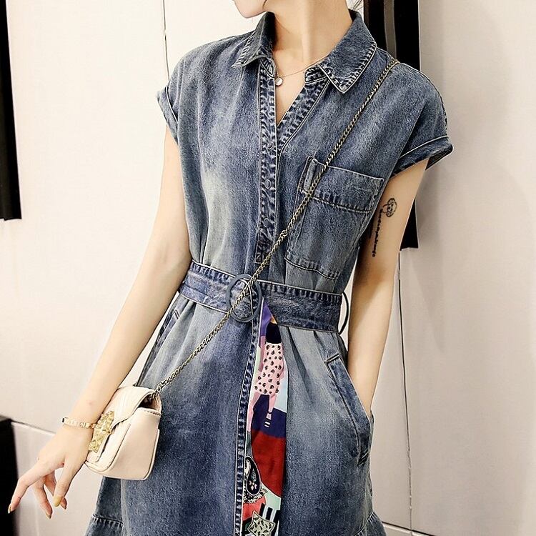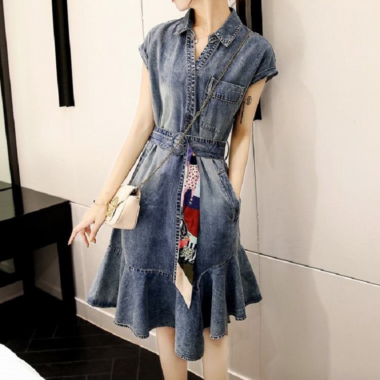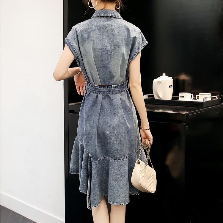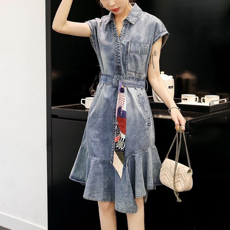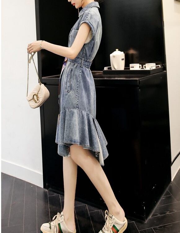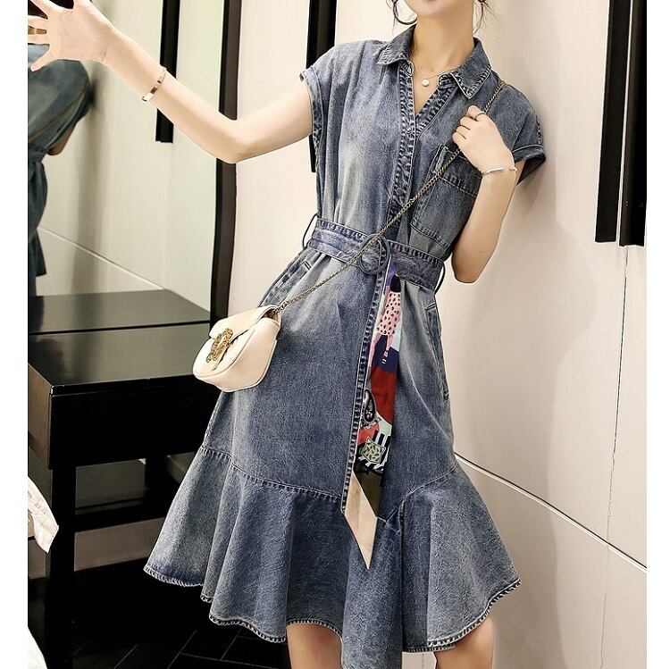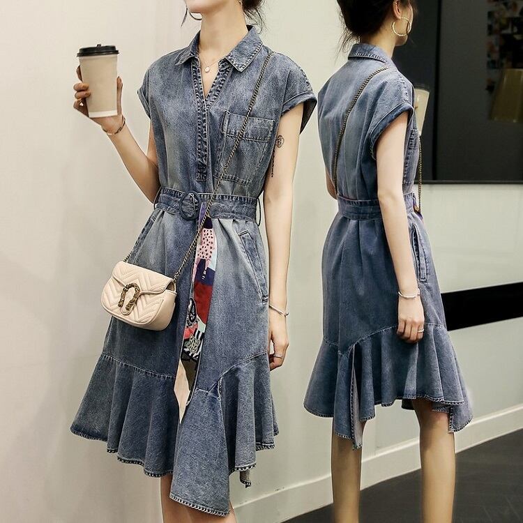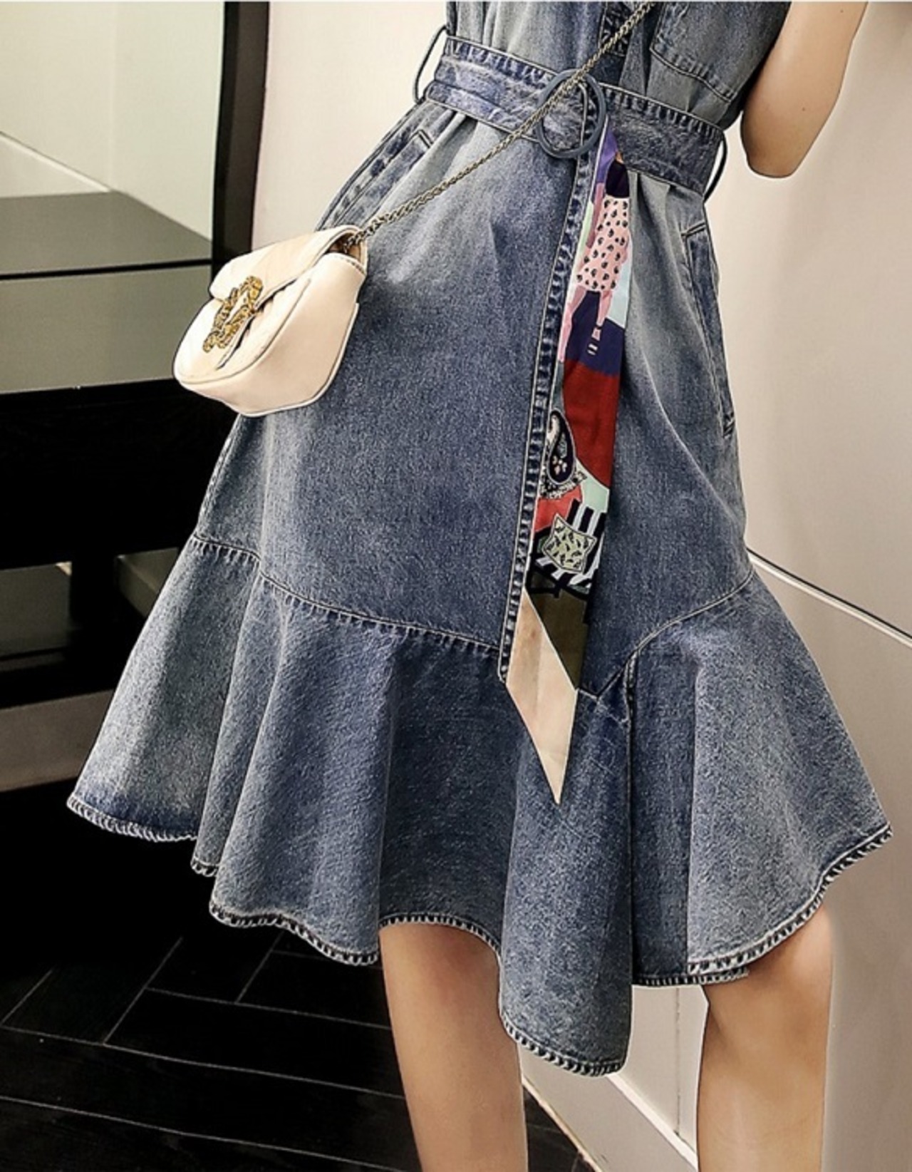 デニムワンピース ひざ丈 ミディ丈 フィッシュテール フリル 襟付き ウエストリボン フレンチスリーブ カジュアル シンプル レトロ お出かけ リゾート デイリー 夏 ブルー