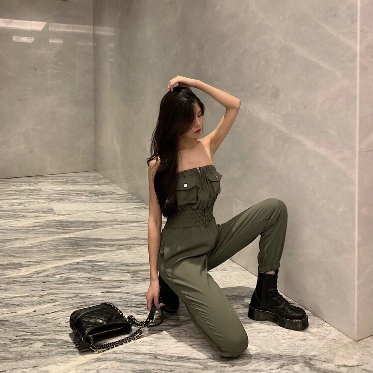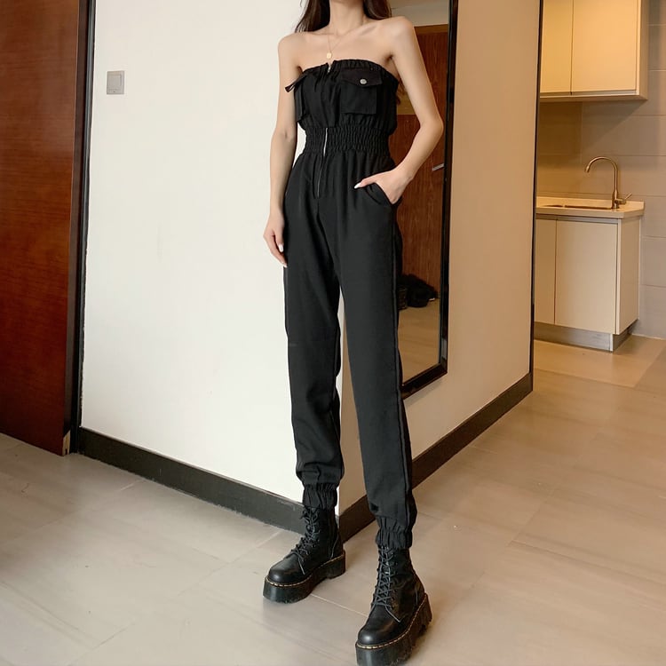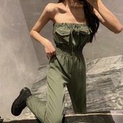 チューブトップのオフショルダーがワイルドな印象のオールインワン。