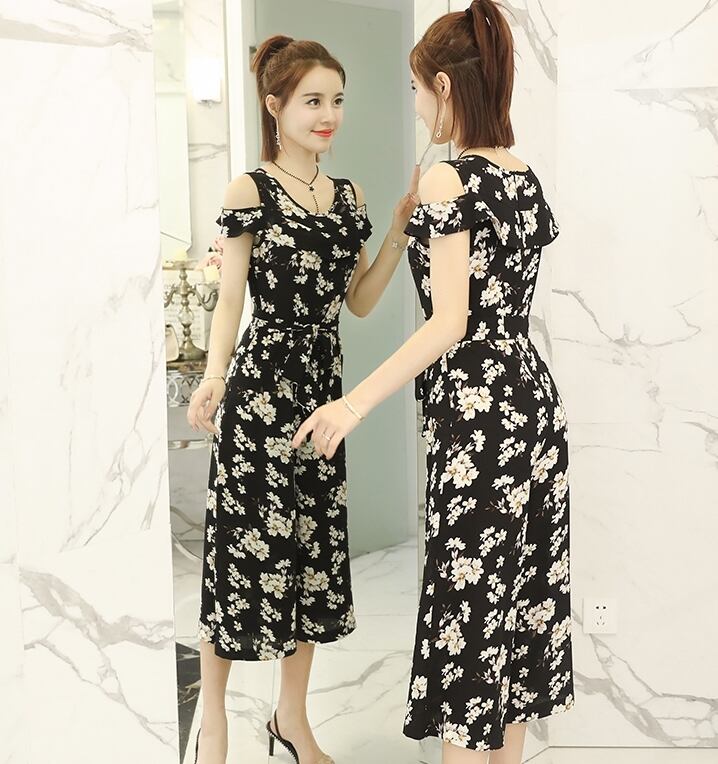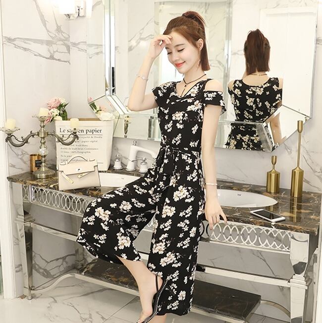 全2色 ジャンプスーツ オールインワン オープンショルダー ワイドレッグ 8分丈 ハイウエスト ウエストリボン 花柄 フリル カジュアル 大人 お出かけ きれいめ 上品 デート 女子会 リゾート 夏