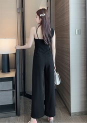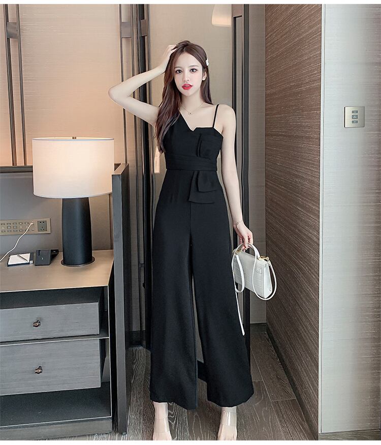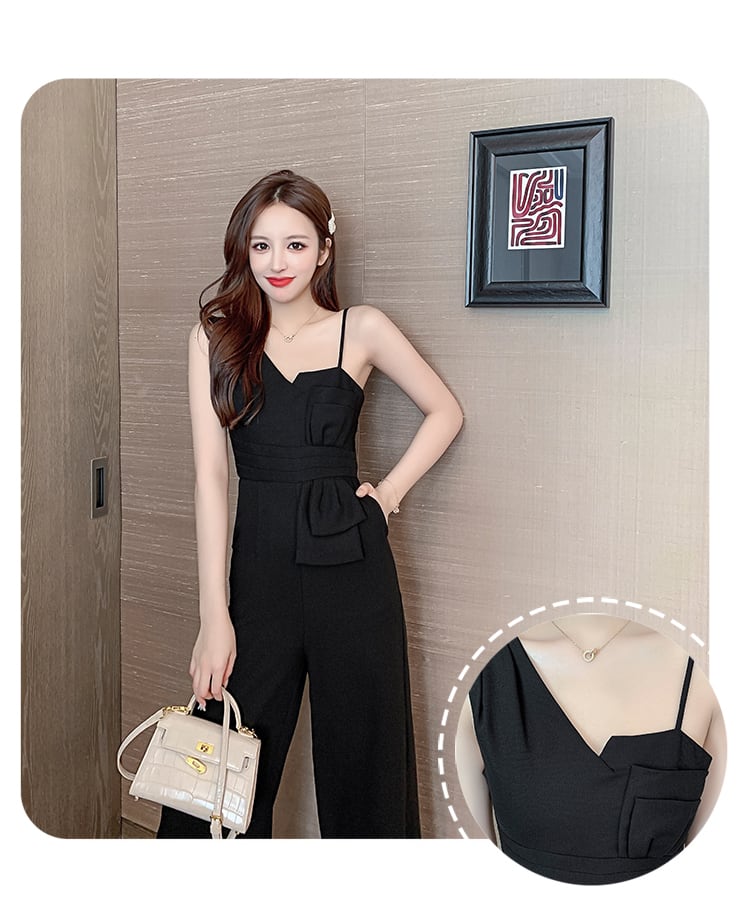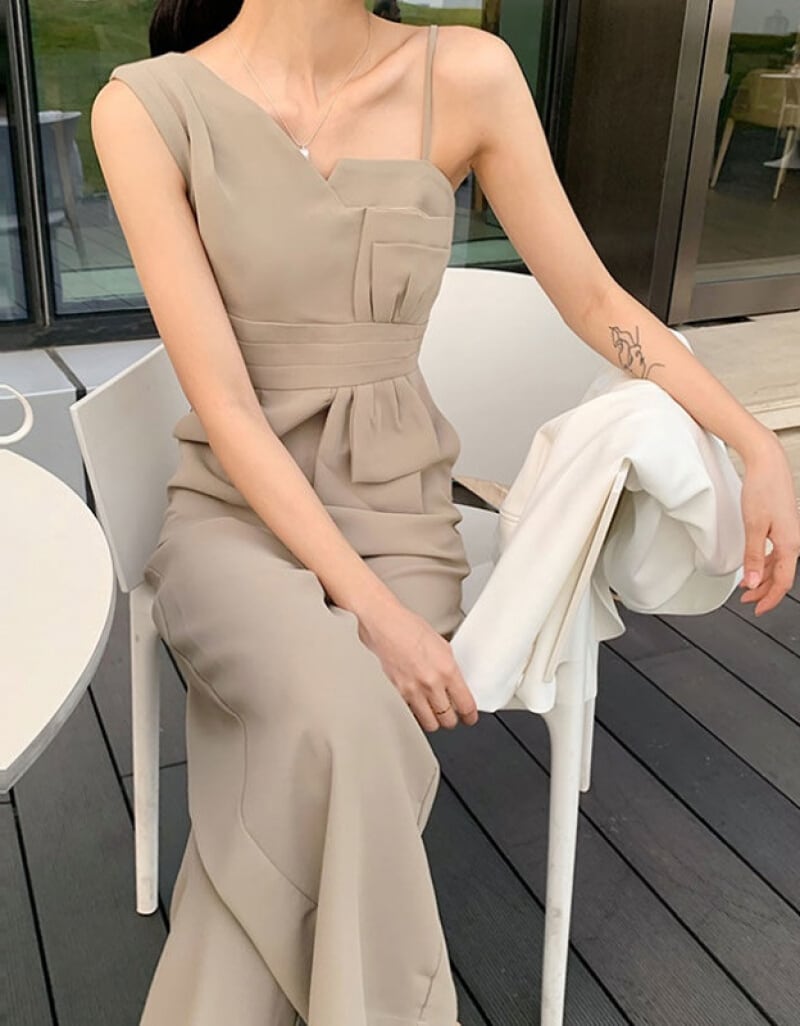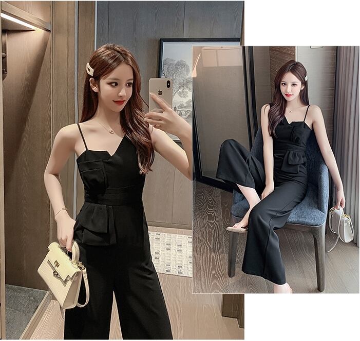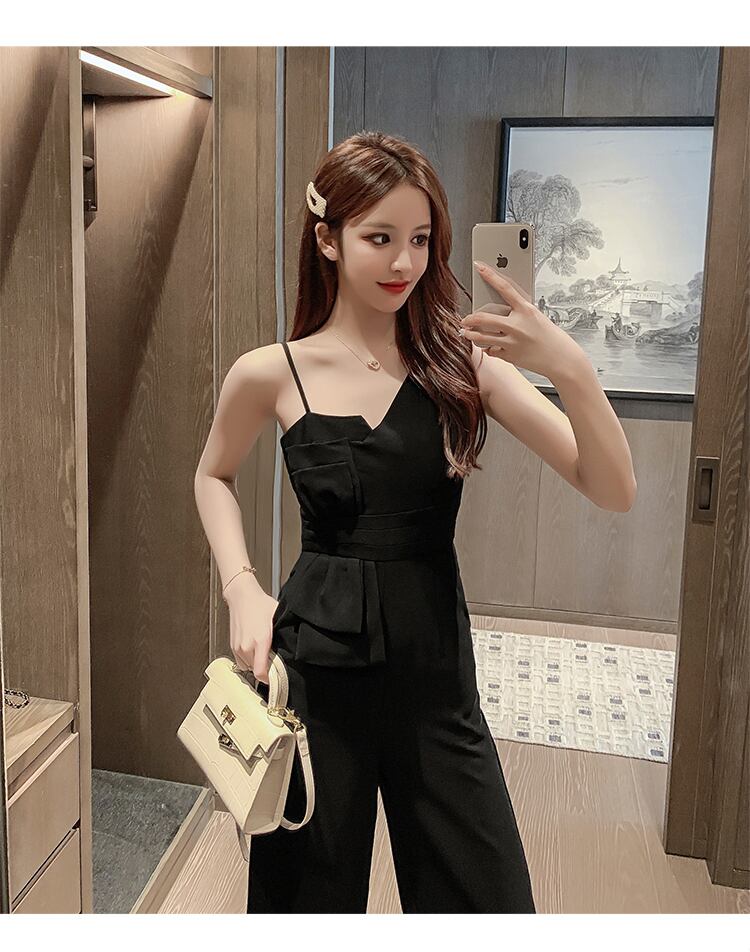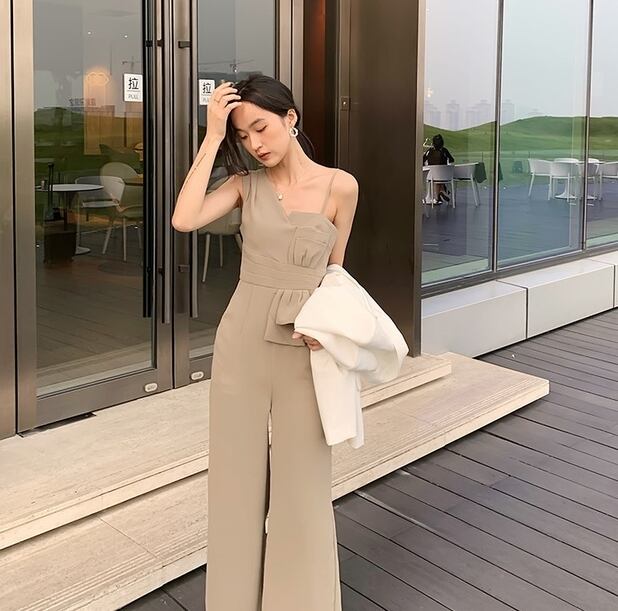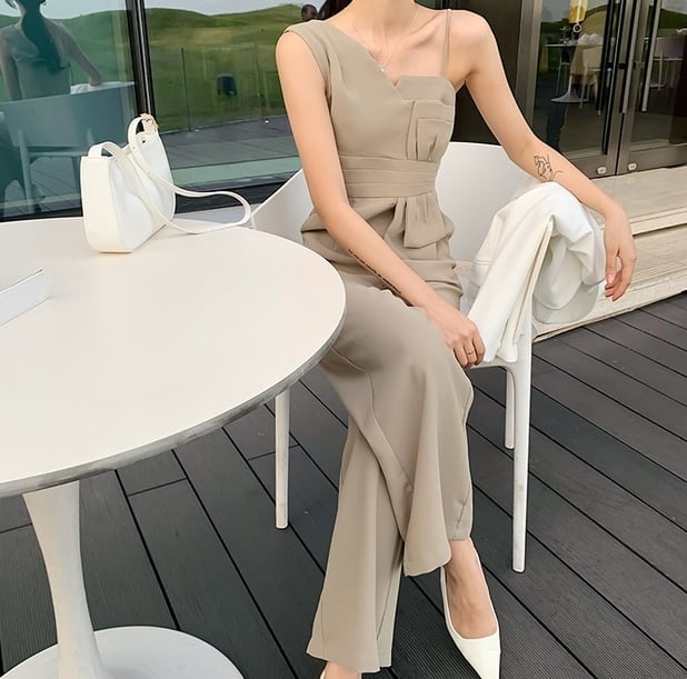 胸元のアシンメトリーなカッティングが女性らしいジャンプスーツです。