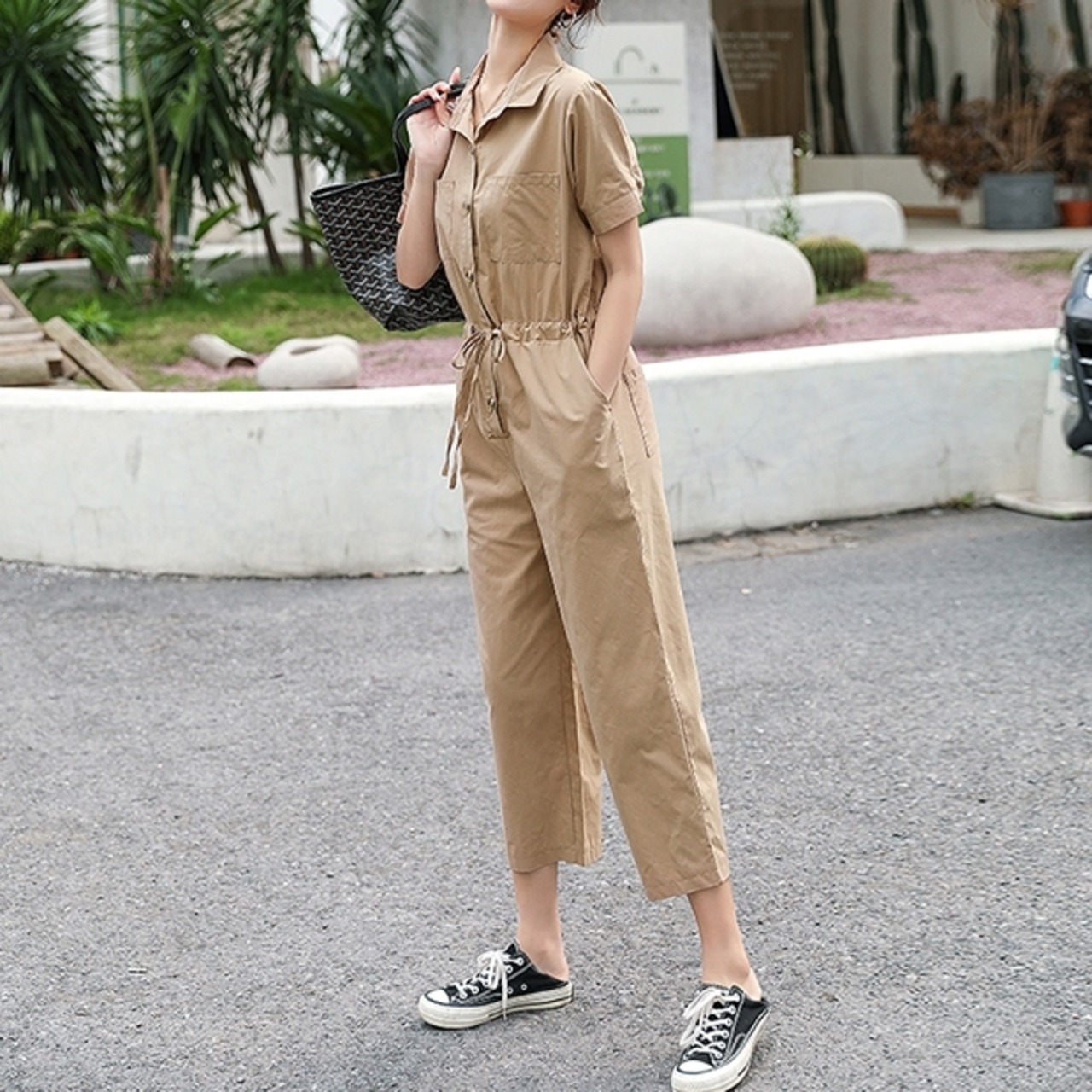 全3色 ジャンプスーツ オールインワン 半袖 襟 ロールアップ 8分丈 フロントボタン ハイウエスト ウエストリボン カジュアル デイリー ラフ 学生 お出かけ 夏 秋