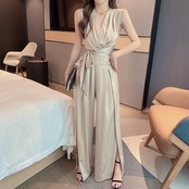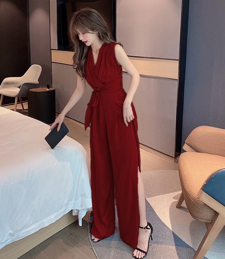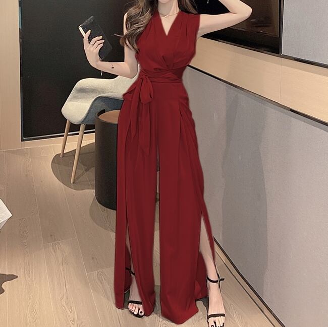 全3色 ジャンプスーツ オールインワン カシュクールネック Vネック ノースリーブ ハイウエスト ウエストリボン ワイドレッグ サイドスリット 大人 上品 カジュアル きれいめ デート お呼ばれ お出かけ 女子会 夏 秋