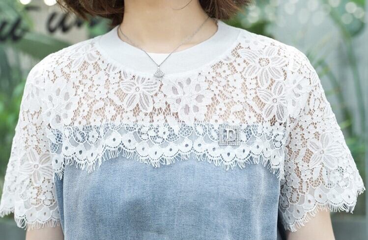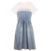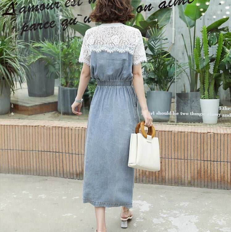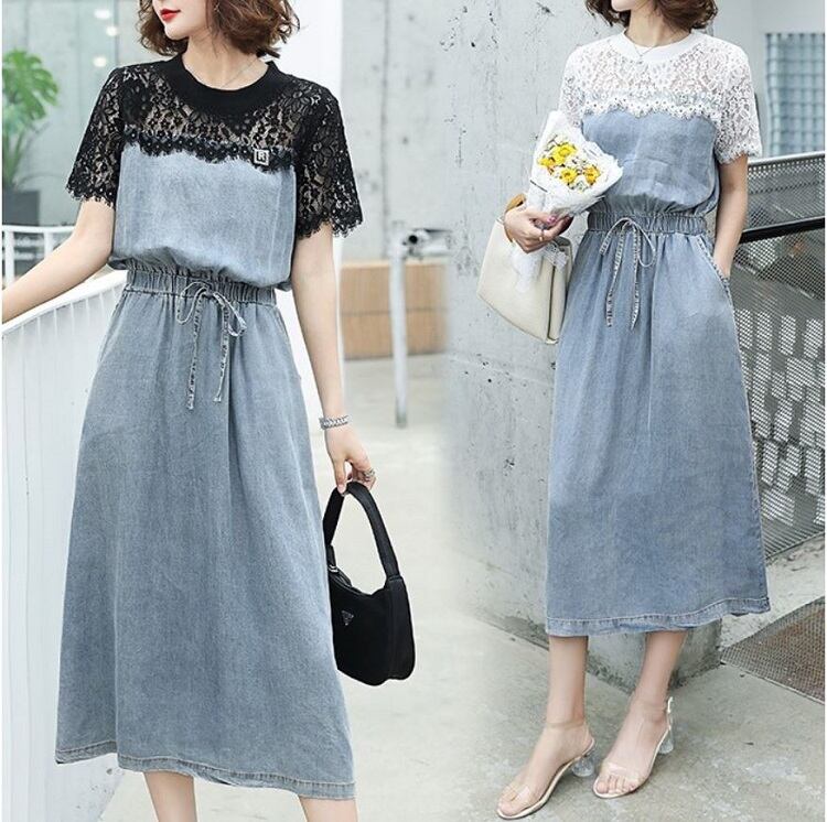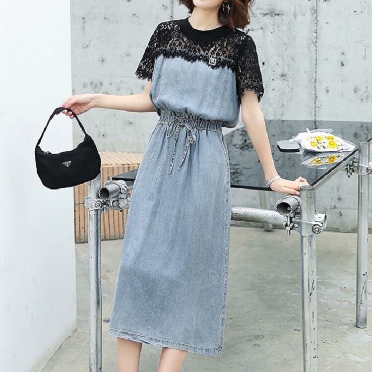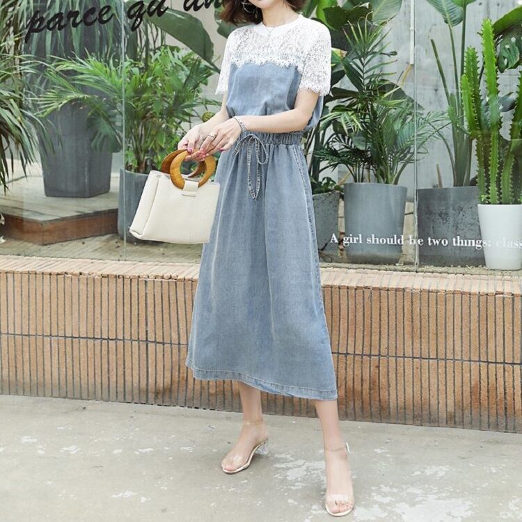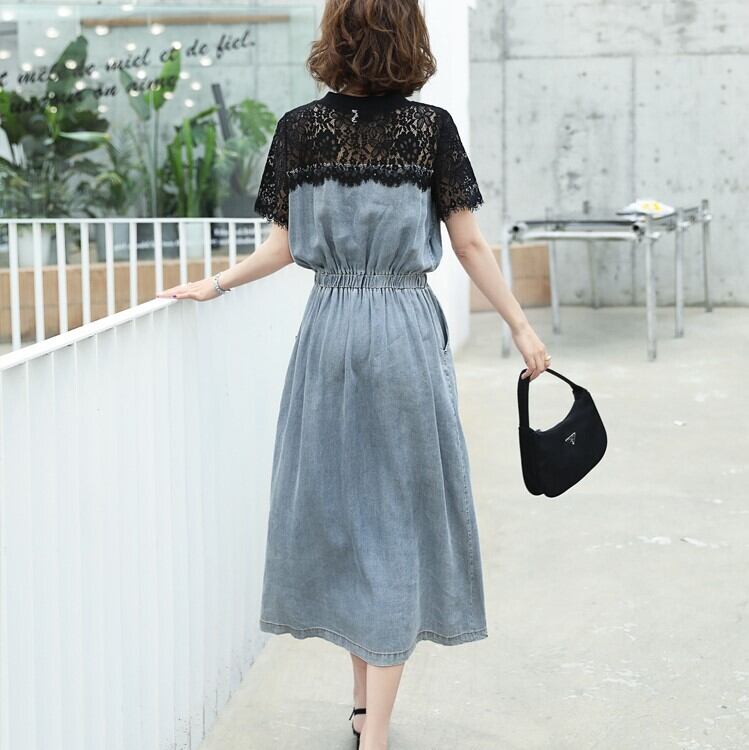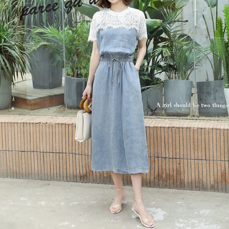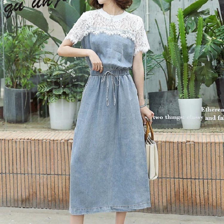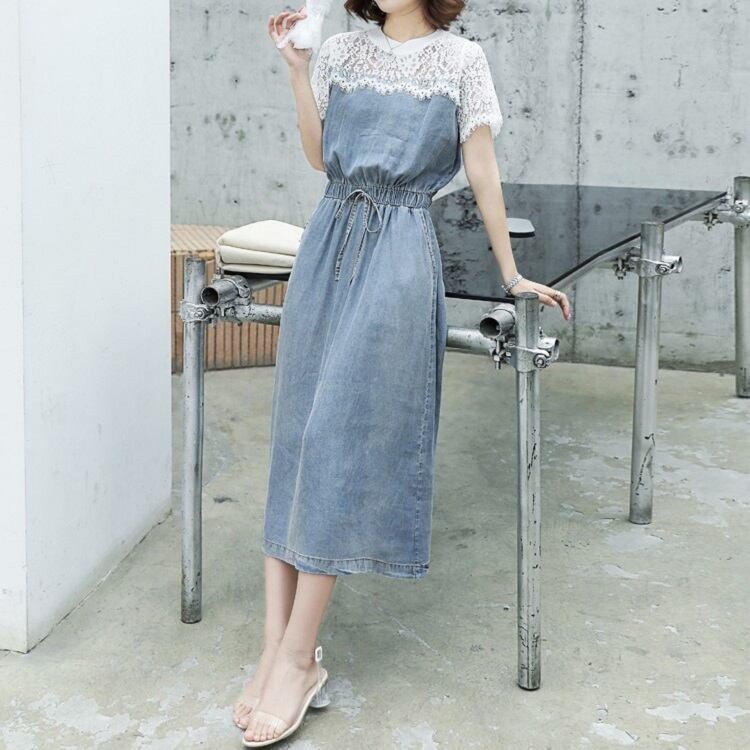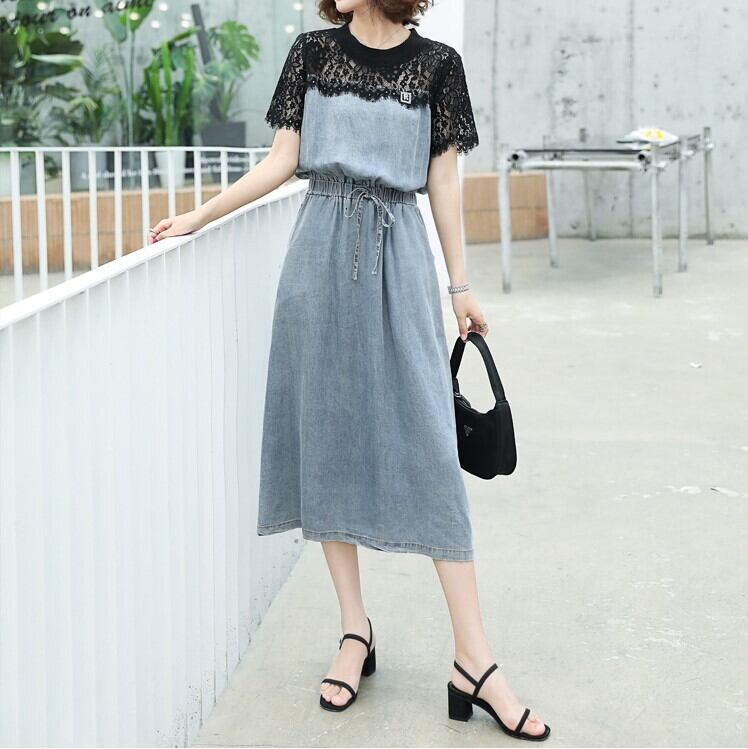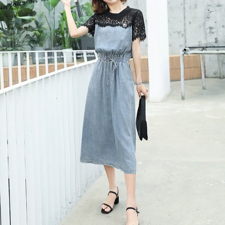 全2色 デニムワンピース 半袖 ひざ丈 ミディ丈 ウエストゴム シャーリング ウエストリボン レース カジュアル シンプル レトロ 可愛い お出かけ デート 女子会 リゾート デイリー 夏