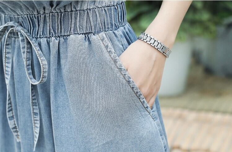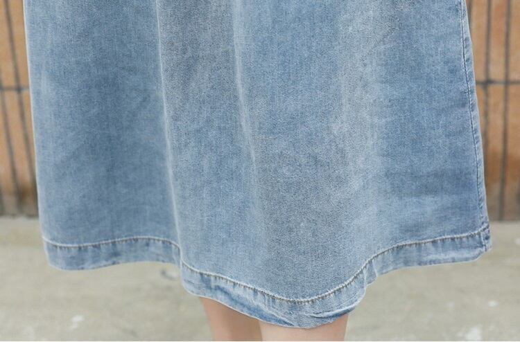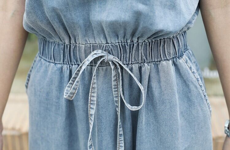 ウエストシャーリングで楽に着られるデニムワンピース。